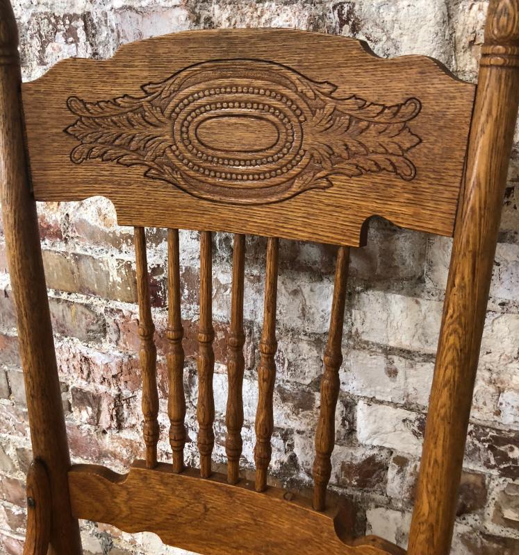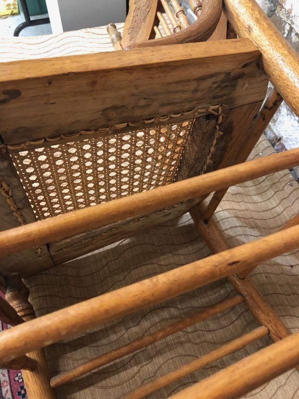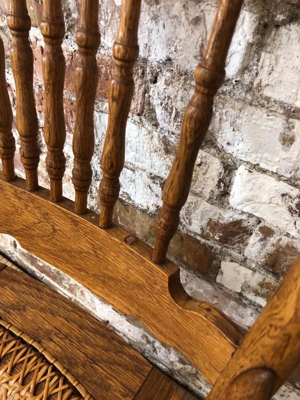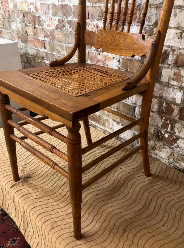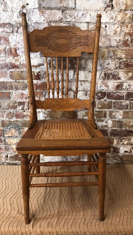 Here is a single oak side chair with a pressed back and wicker seat...Missing one spindle...True antique...
