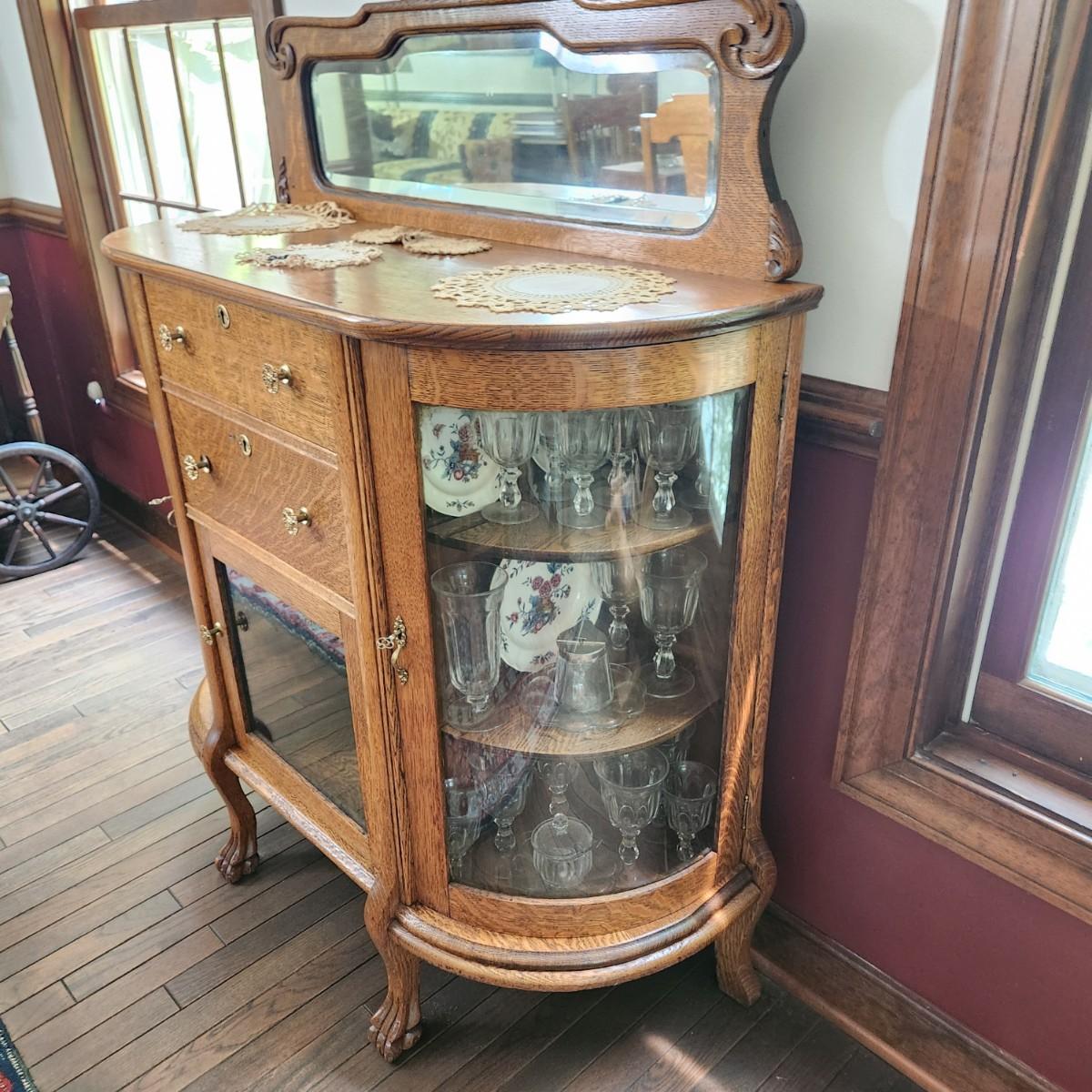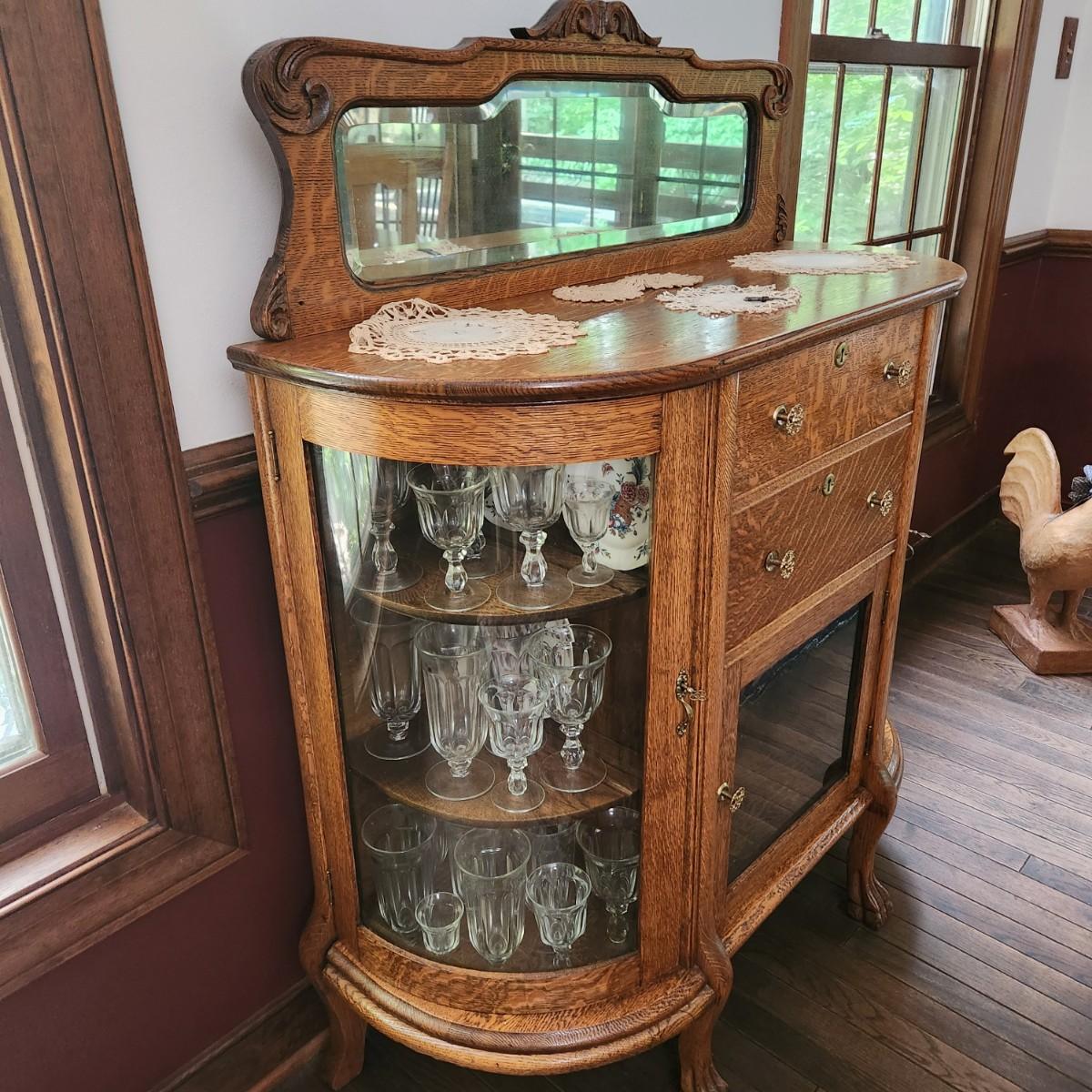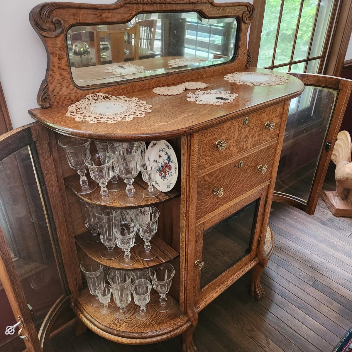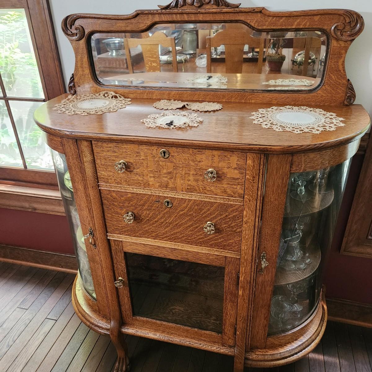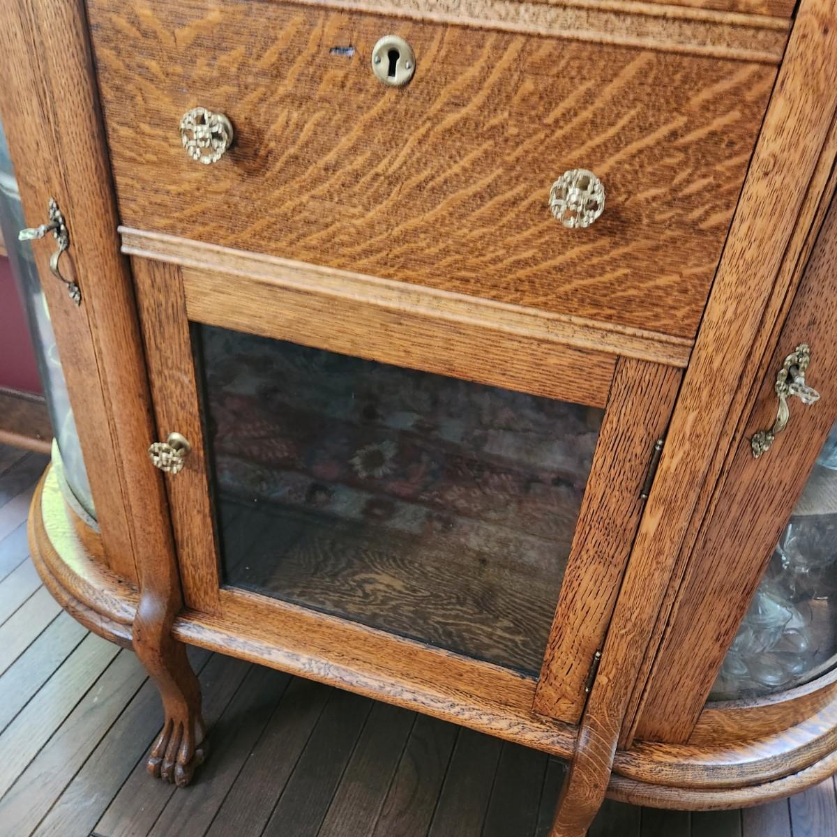 Antique Oak Sideboard Buffet Curved Glass Side Doors Beveled Mirror Carved Feet on Casters 40x16x50