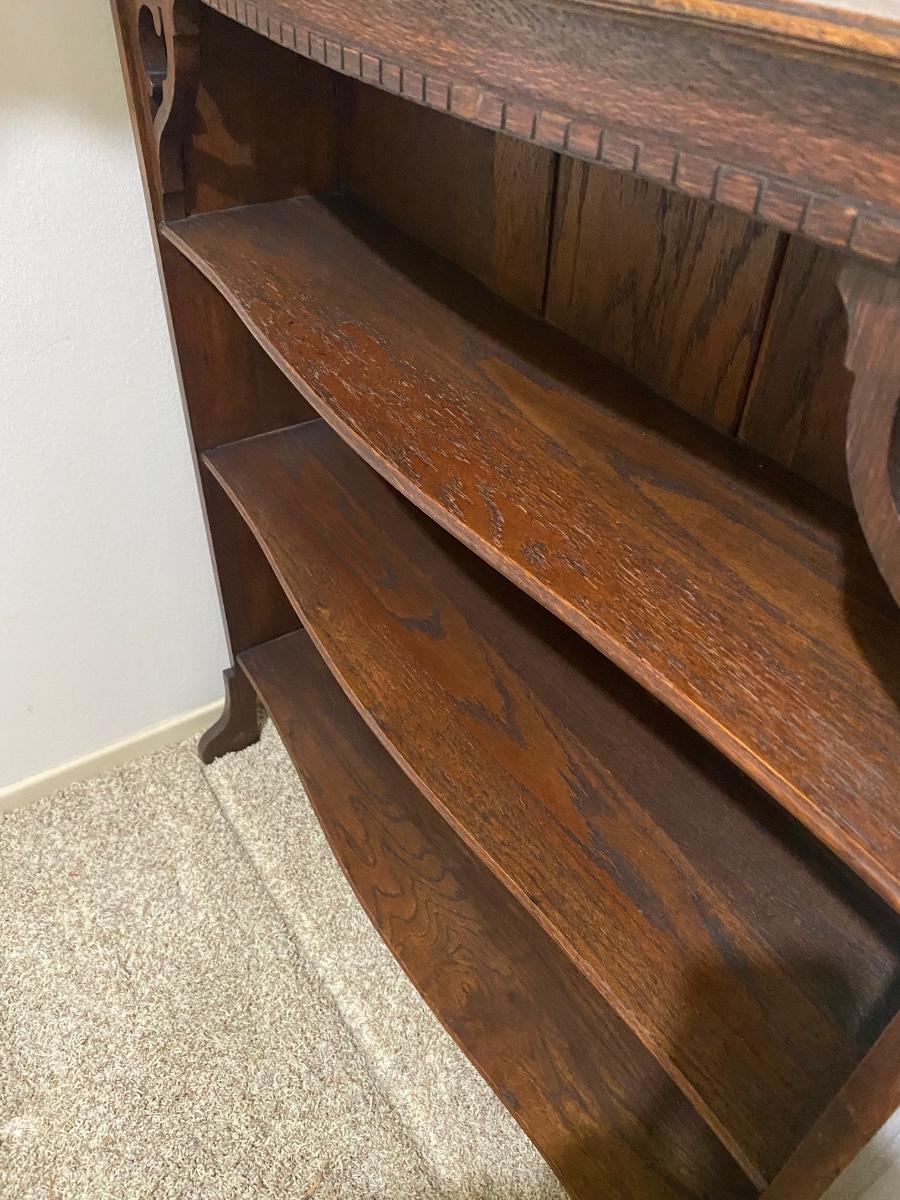 Antique Oak Three Shelf Bookcase Display Cabinet. In good antique condition. Slightly curved front Three fixed shelves. About 36" wide, 46" tall and only 10" deep.