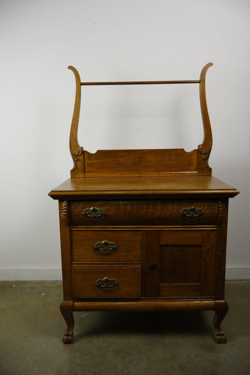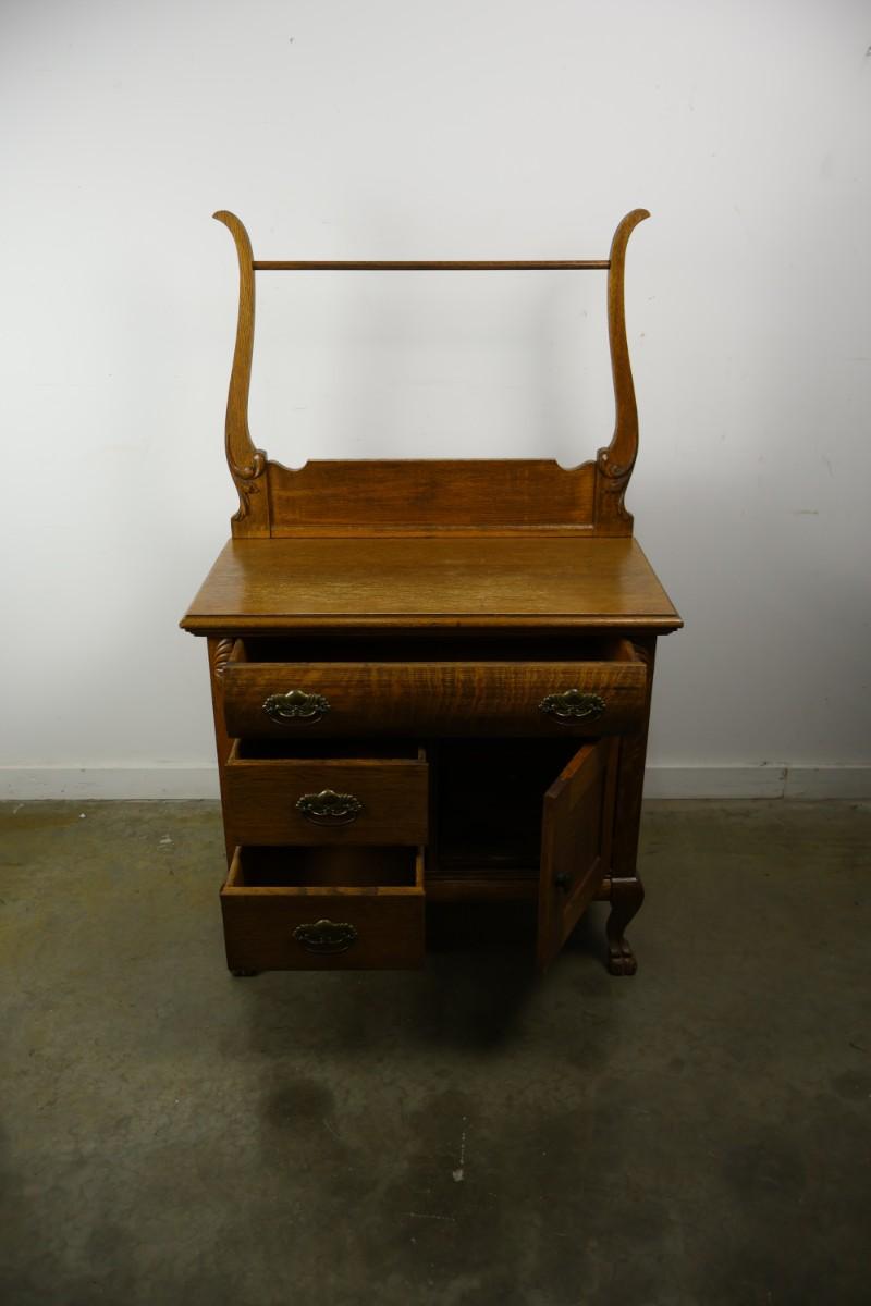 Antique Oak Washstand with Towel Rack. 31 1/2" x 52" high (table top 30" high) x 17" deep.