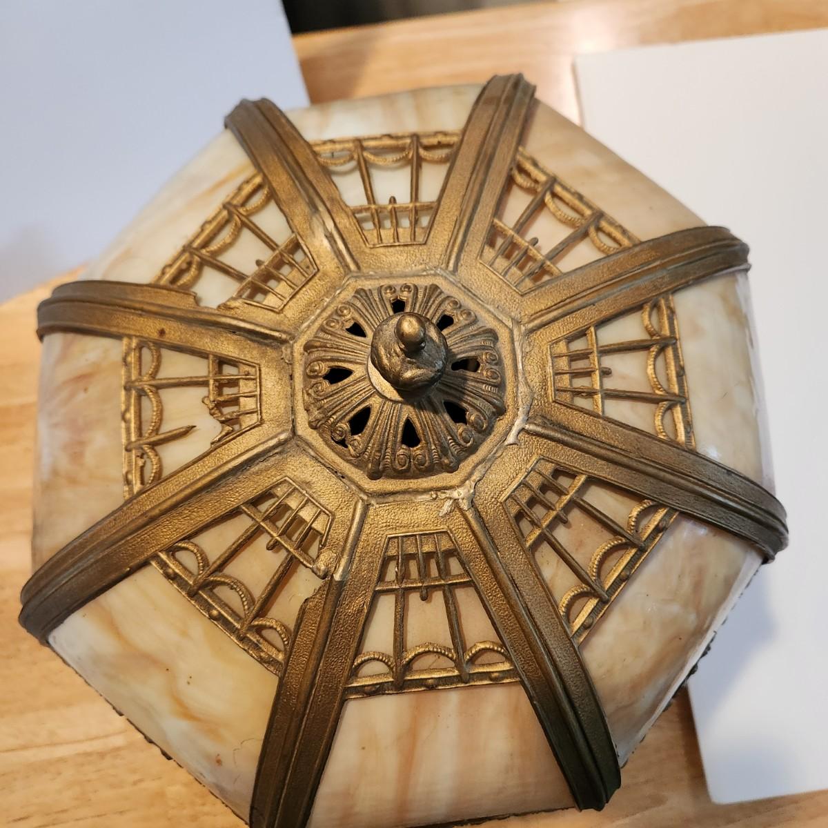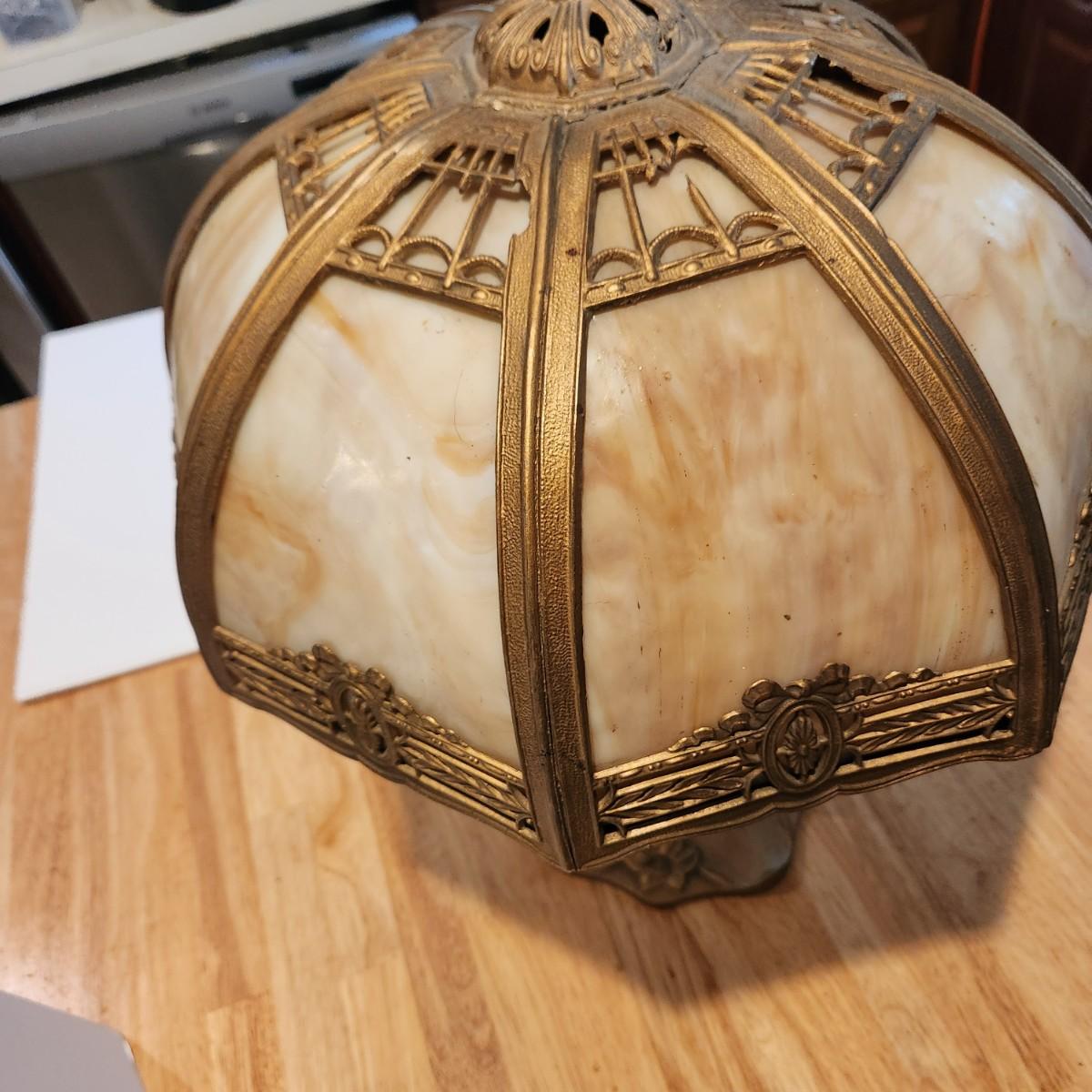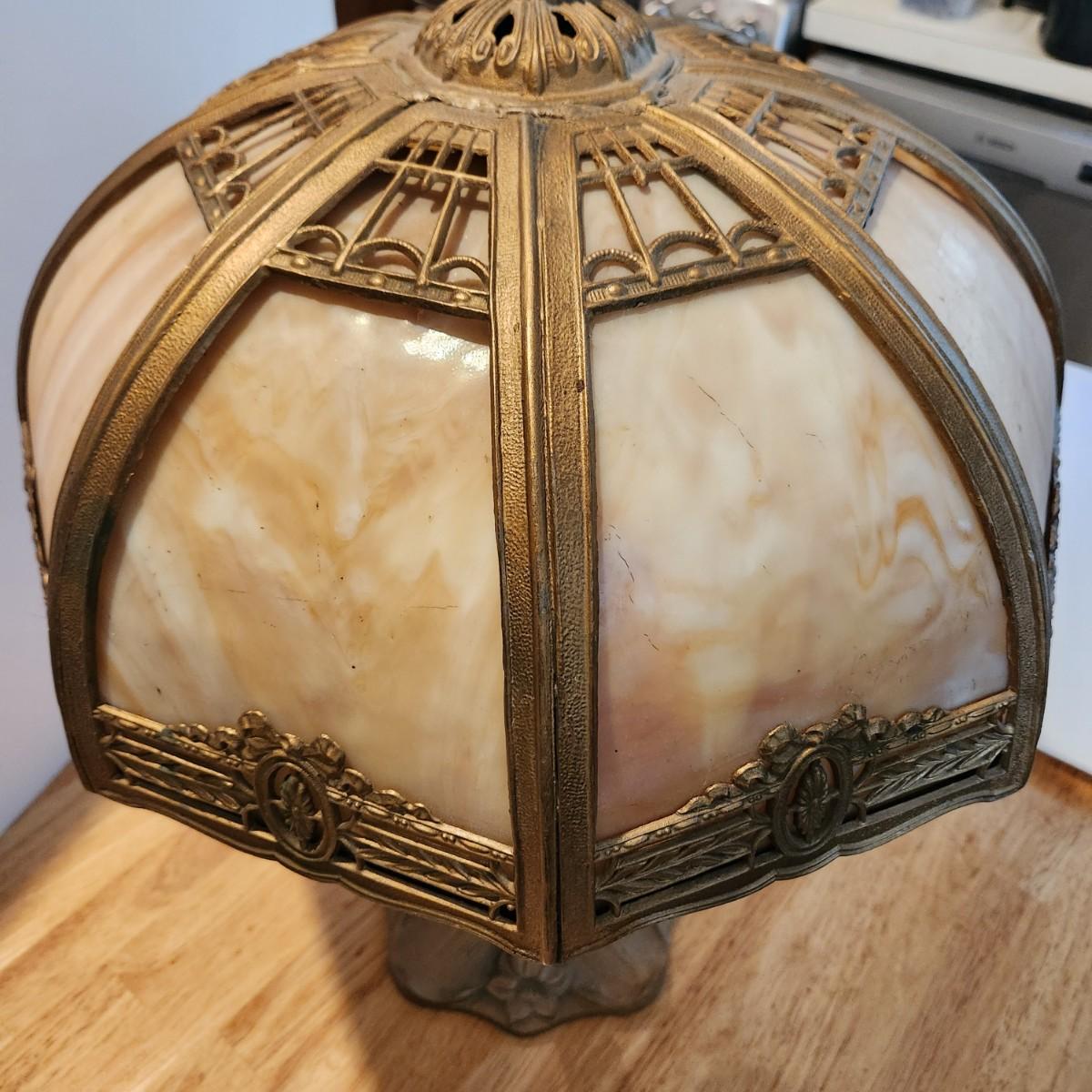 Antique Octagonal Ornate Slag Glass Table Lamp Curved Shade