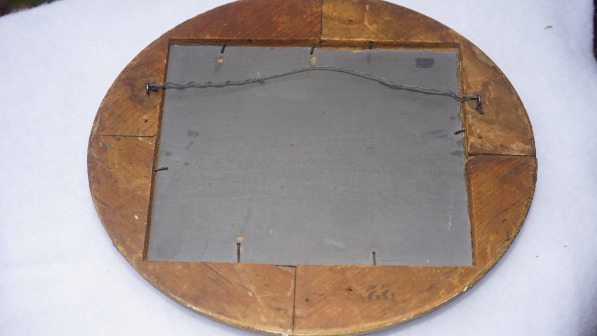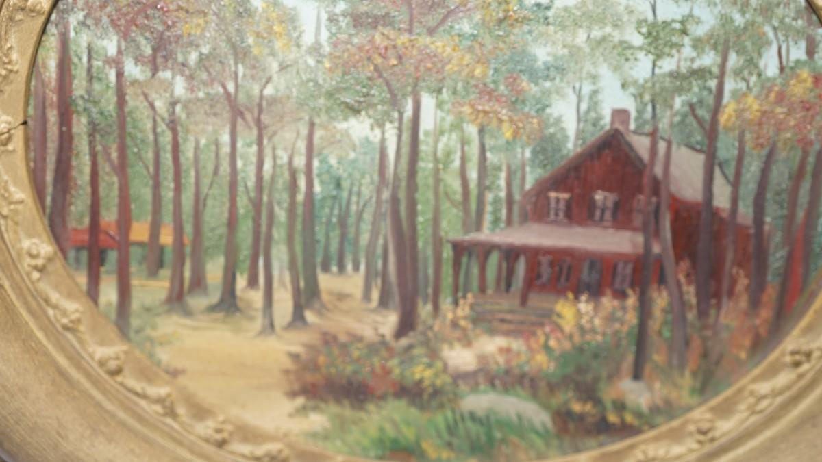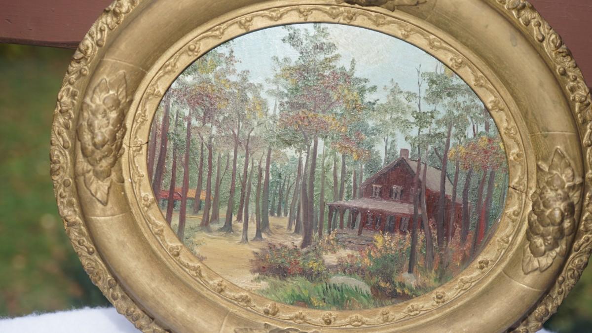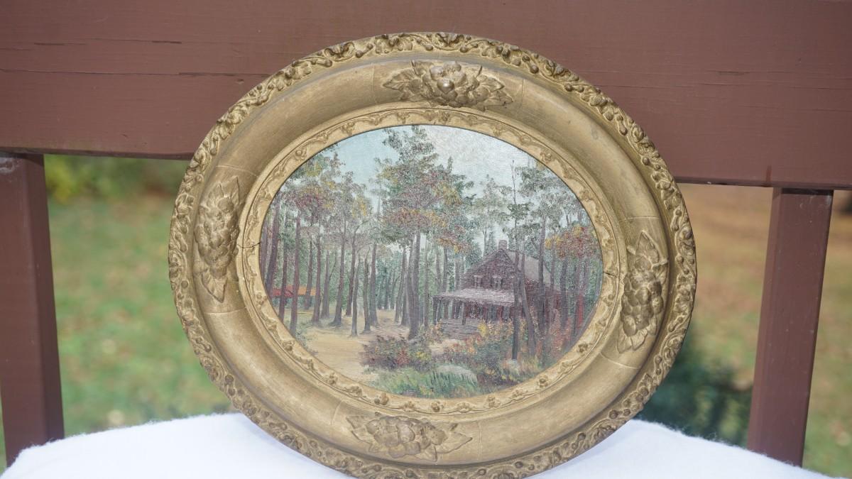 ANTIQUE OIL ON BOARD /HOUSE IN WOODLAND SETTING IN LATE 19TH CENTURY OVAL GESSO FRAME