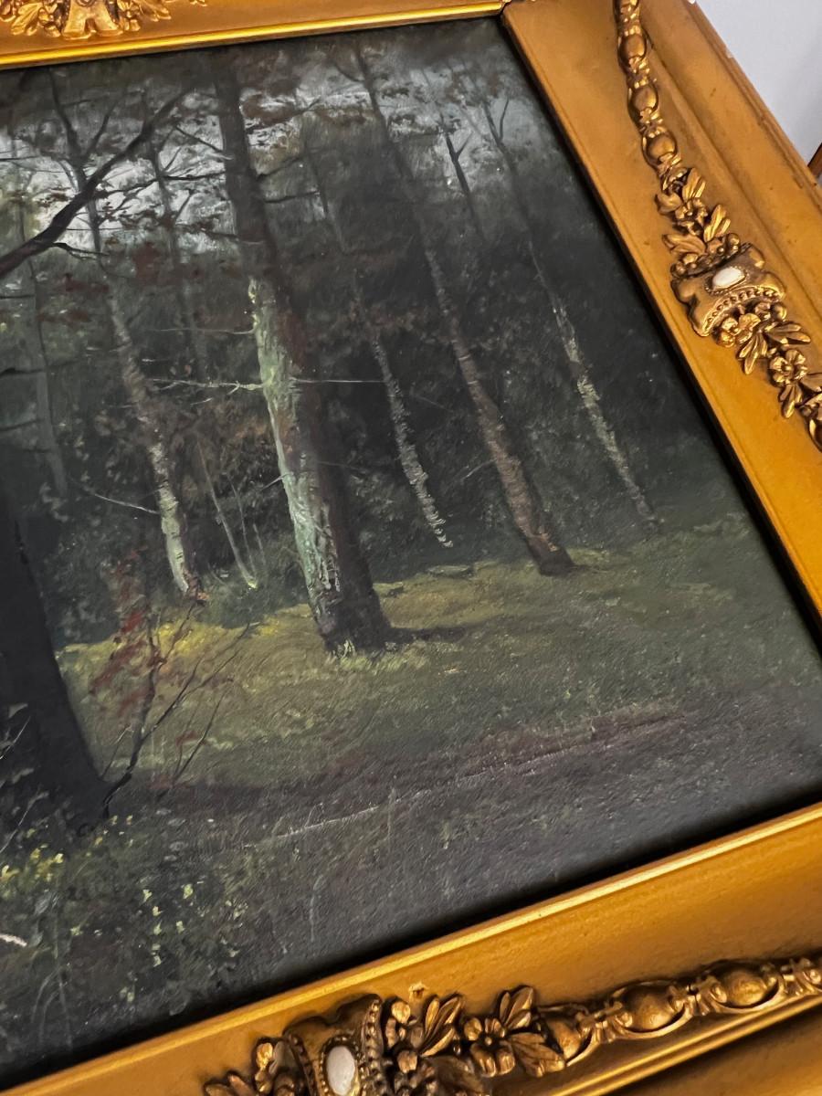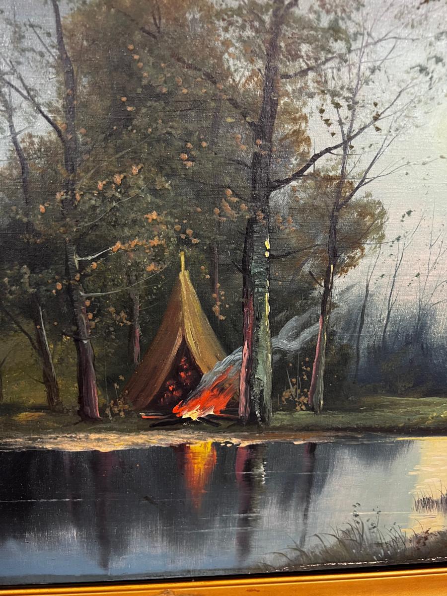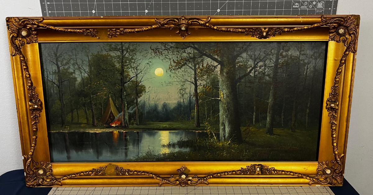 Antique Oil Painting, No Signed. Full Moon Camping by the Pond