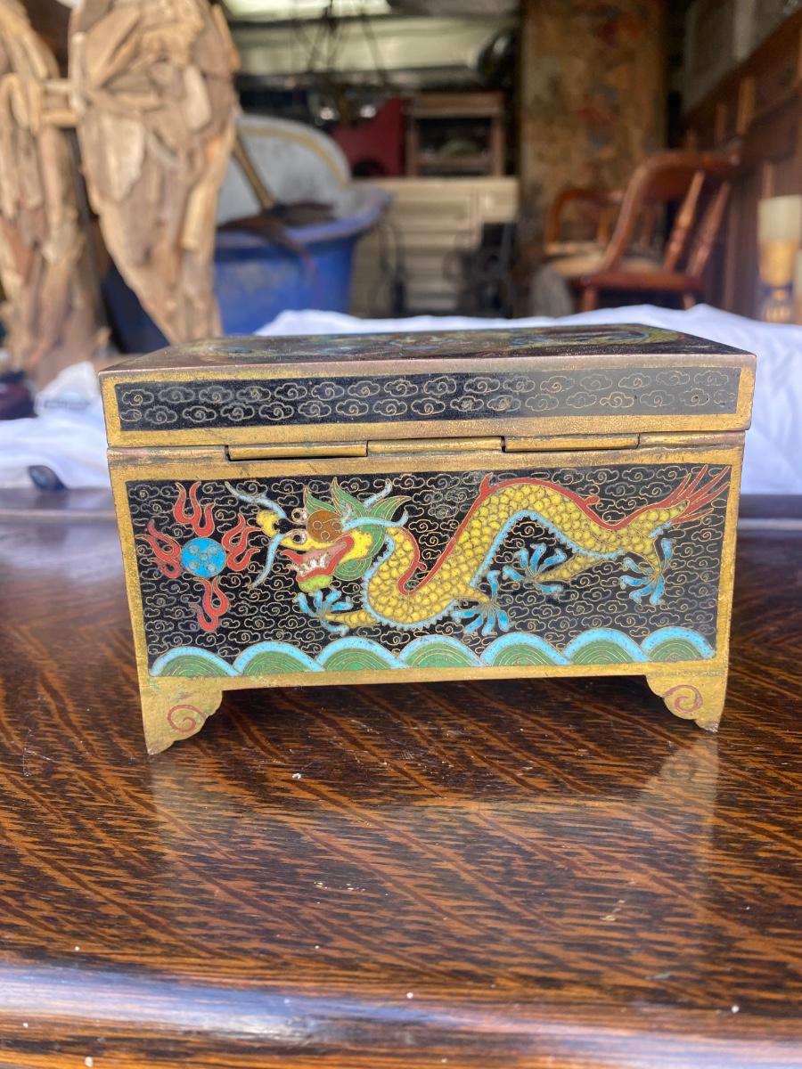 A very cool vintage hinged trinket box. Features a dragon design on a black background. Most likely produced in China. Wear on surface consistent with age. Slight damage on inner lid as shown in photo
