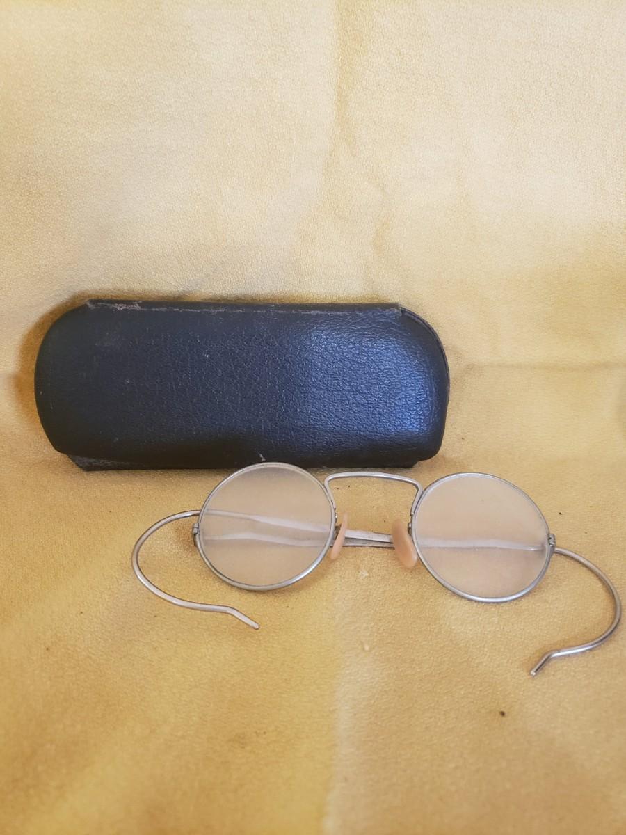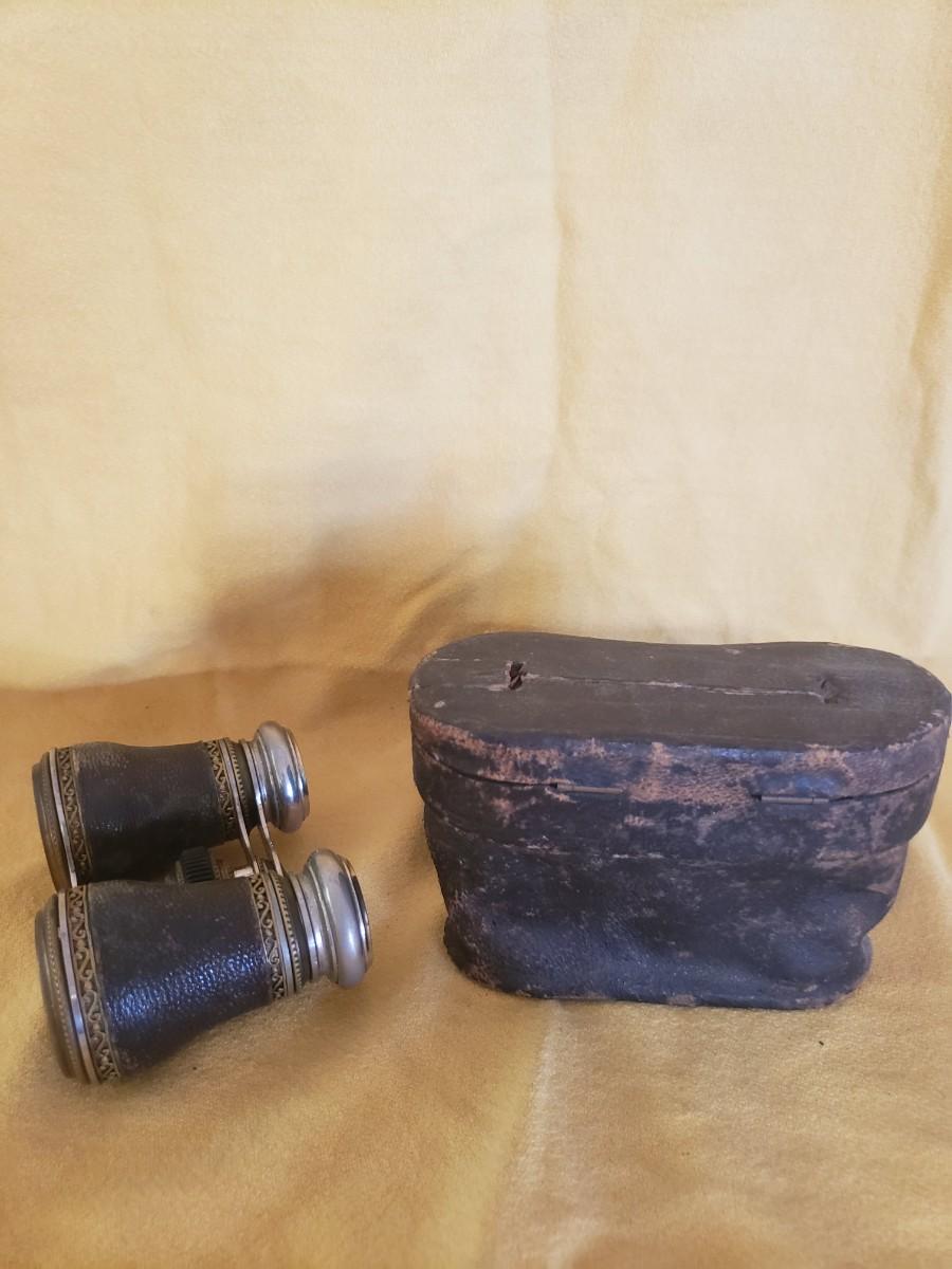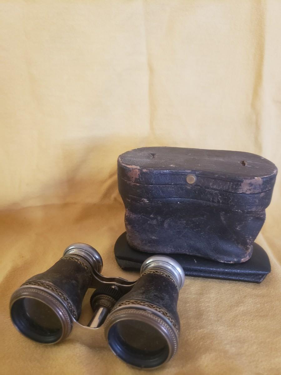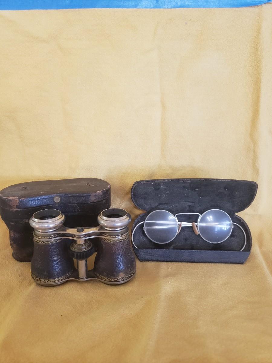 Antique Chevalier opera glasses with case. Antique wire rimmed eyeglasses with case.