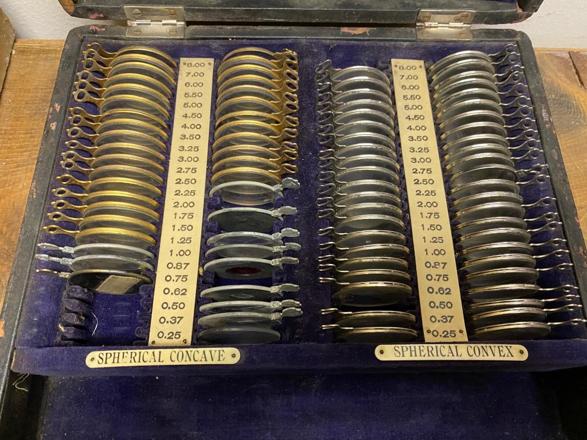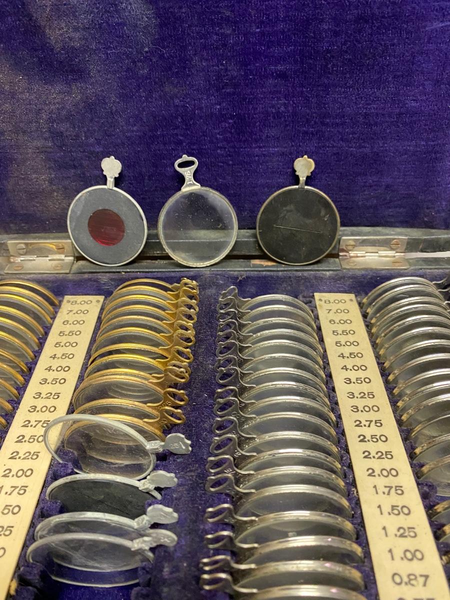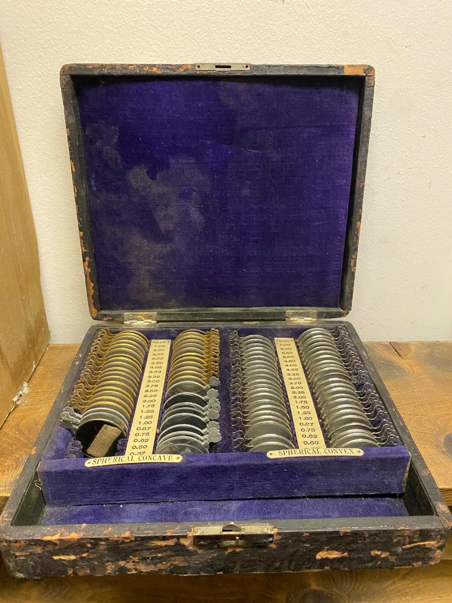 Antique Optometrist Eye Doctor Travel Eyeglass Len Fitting Kit comes with original felt lined box. Box is worn, but fairly solid. The kit is not complete, but the pieces that are included are in very good condition.