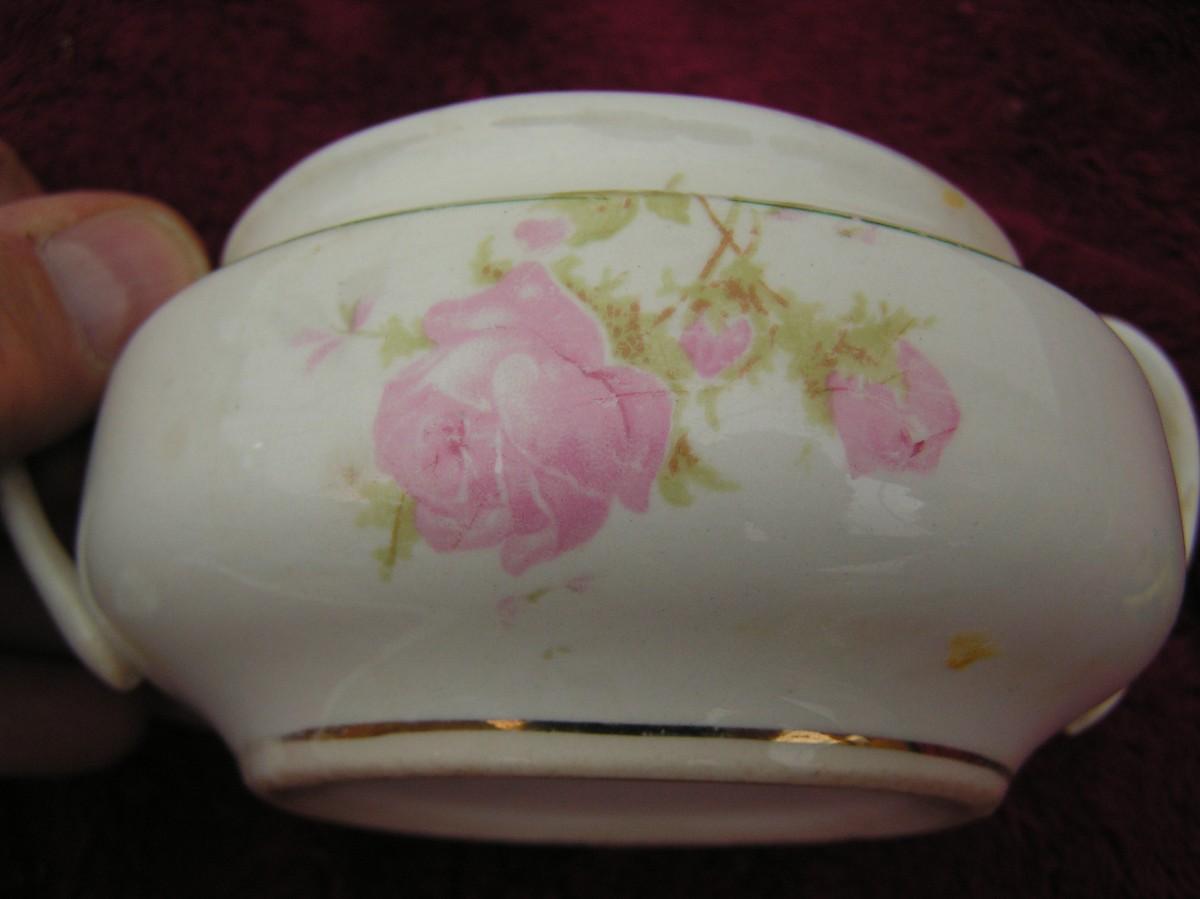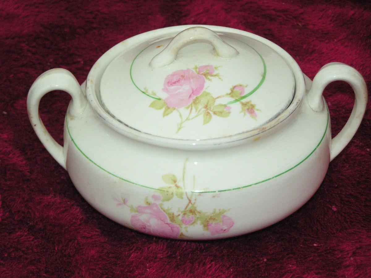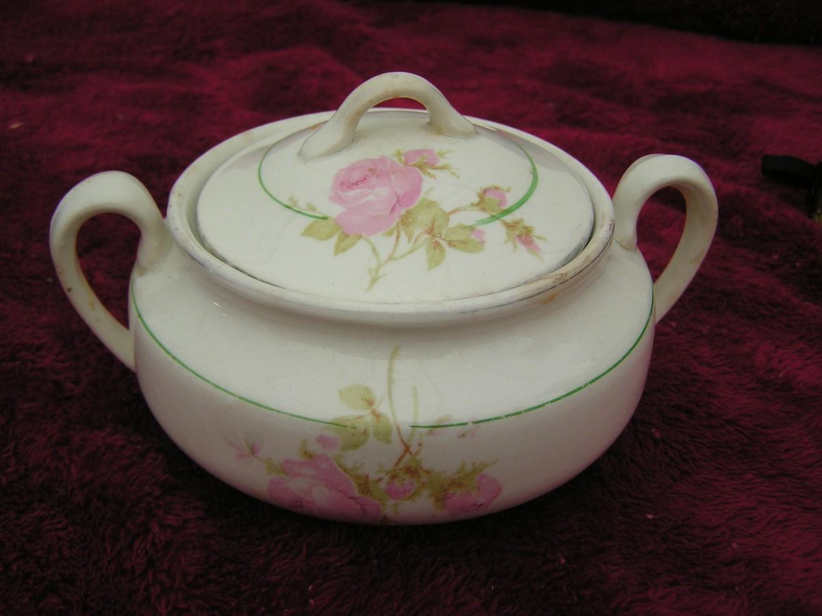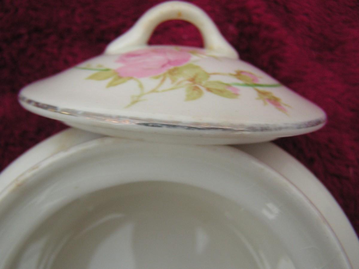 Antique or very old vintage K.T.&K. China sugar bowl w/lid (Knowles, Taylor & Knowles) of East Liverplool Ohio from 1854 to 1931. Glazed ceramic w/gold trim & pink roses. VG.