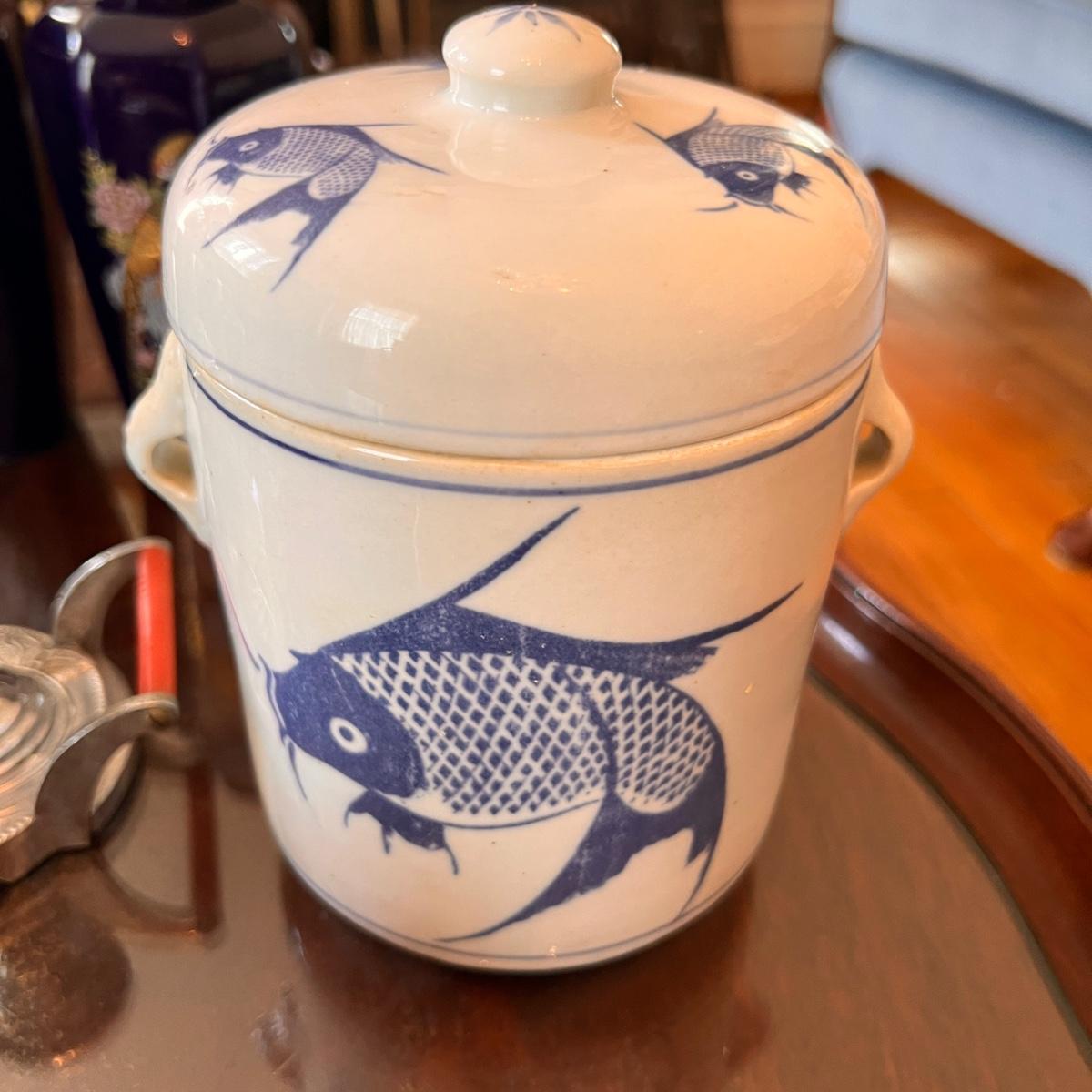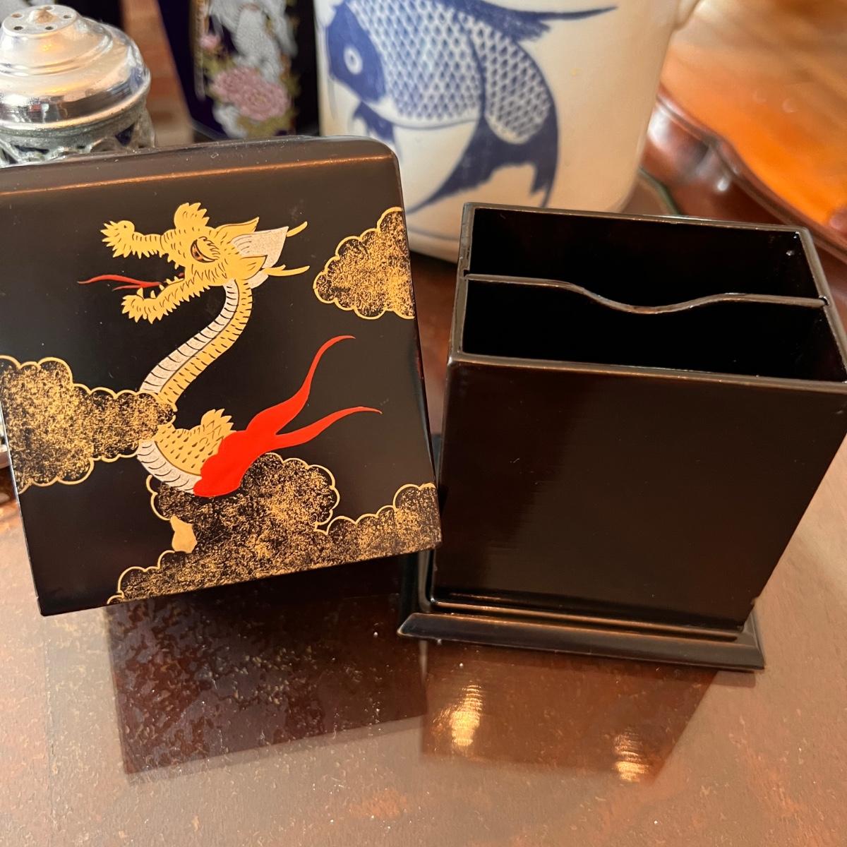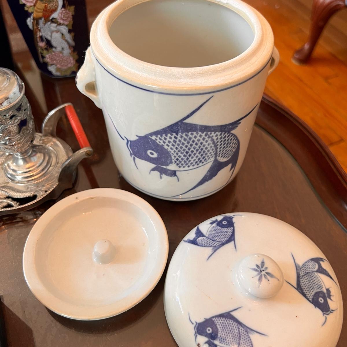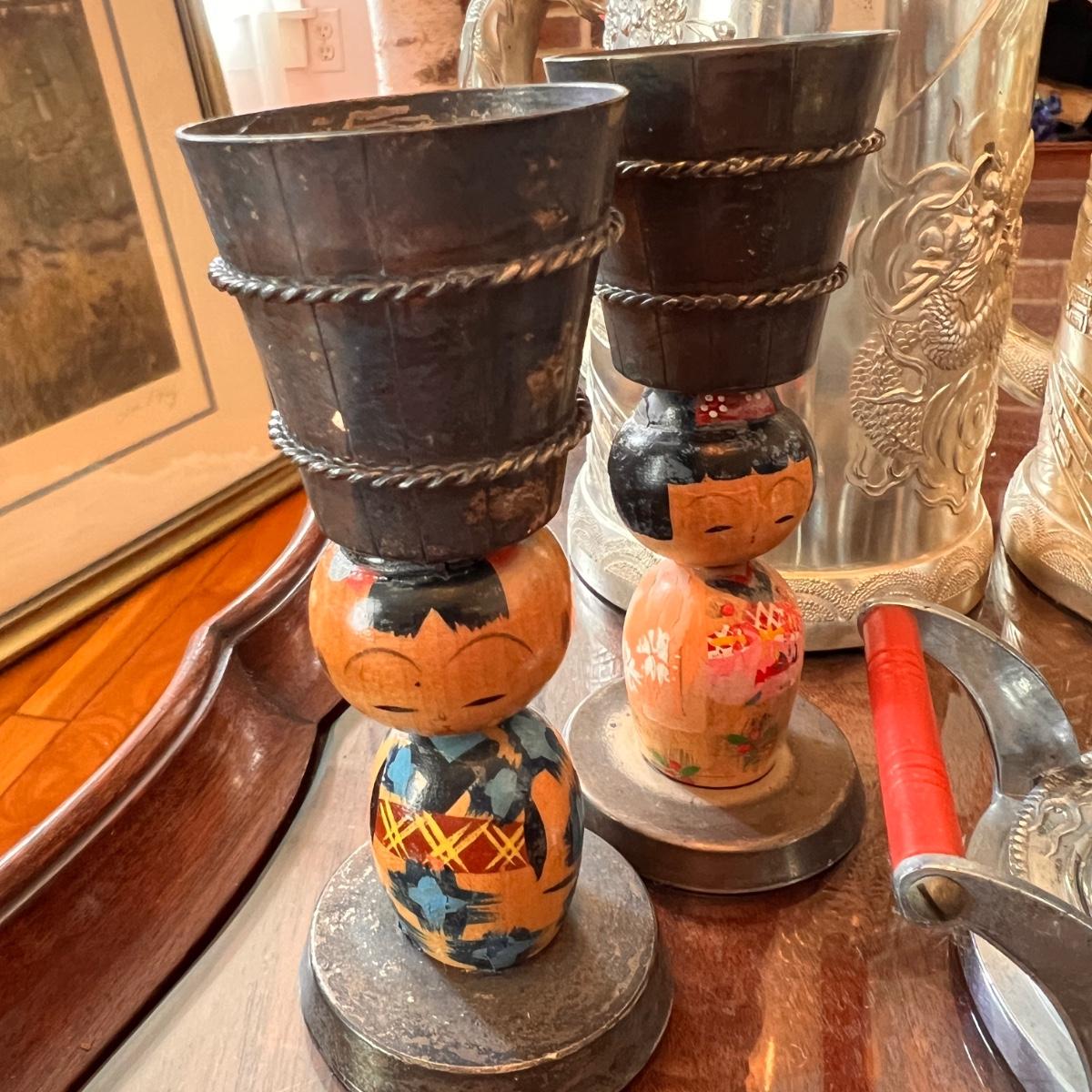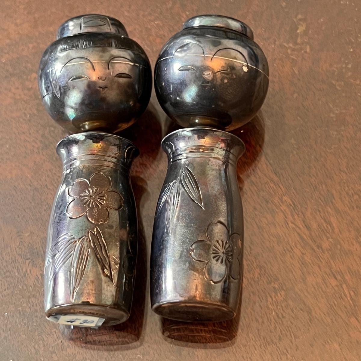 2 Kokeshi Doll Salt and Pepper Shakers and vintage mountain shaped carved salt and pepper shakers are sterling silver, intricate Japanese salt and pepper shaker with matching tray red handles. 2 metal mugs. Dragon Laquerware playing card holder. Vintage Koi Fish Chinese Asian Ginger Jar Double Lid. 2 blue matching vases. 2 wood and untested metal Kokeshi doll cups.