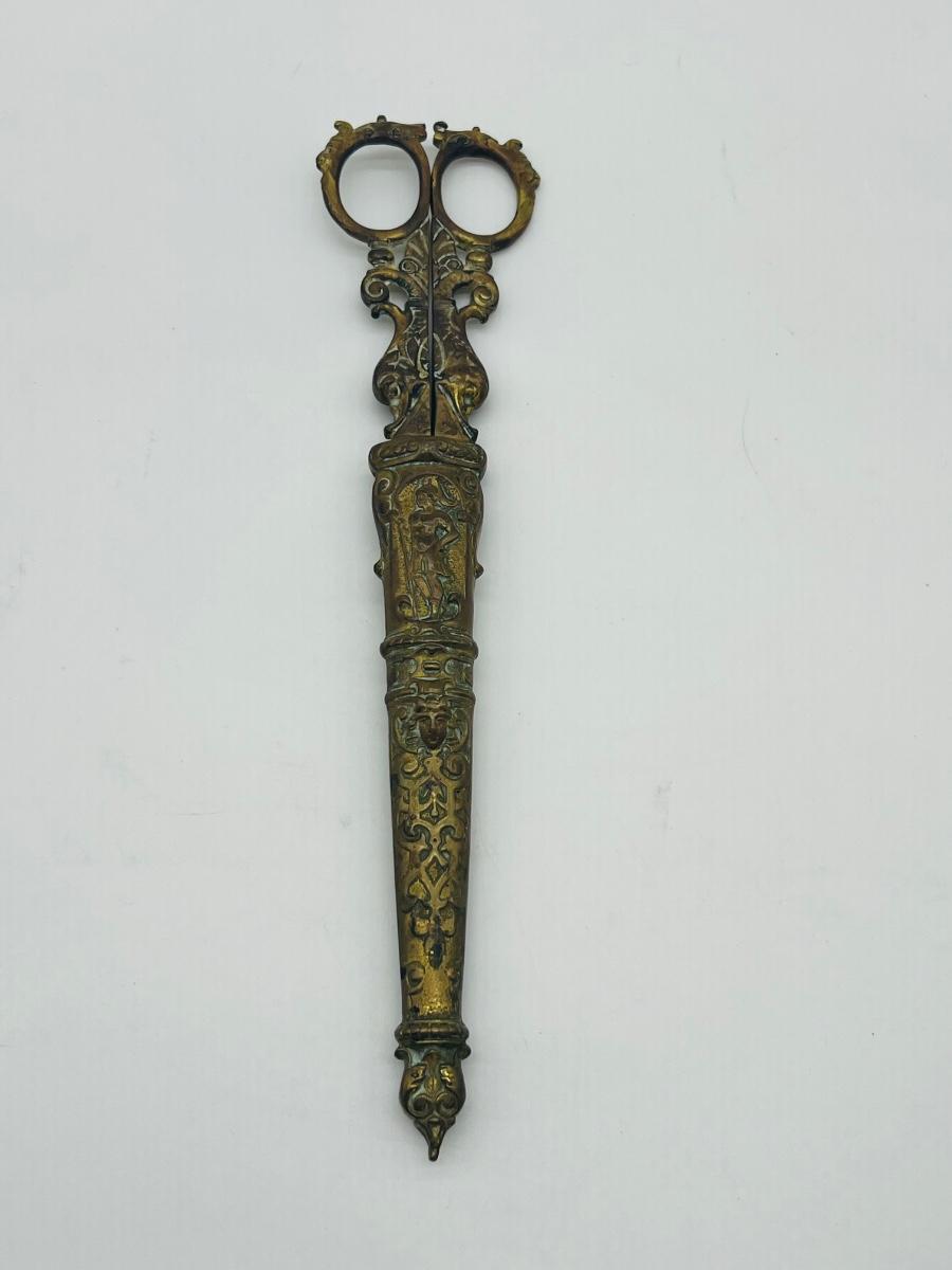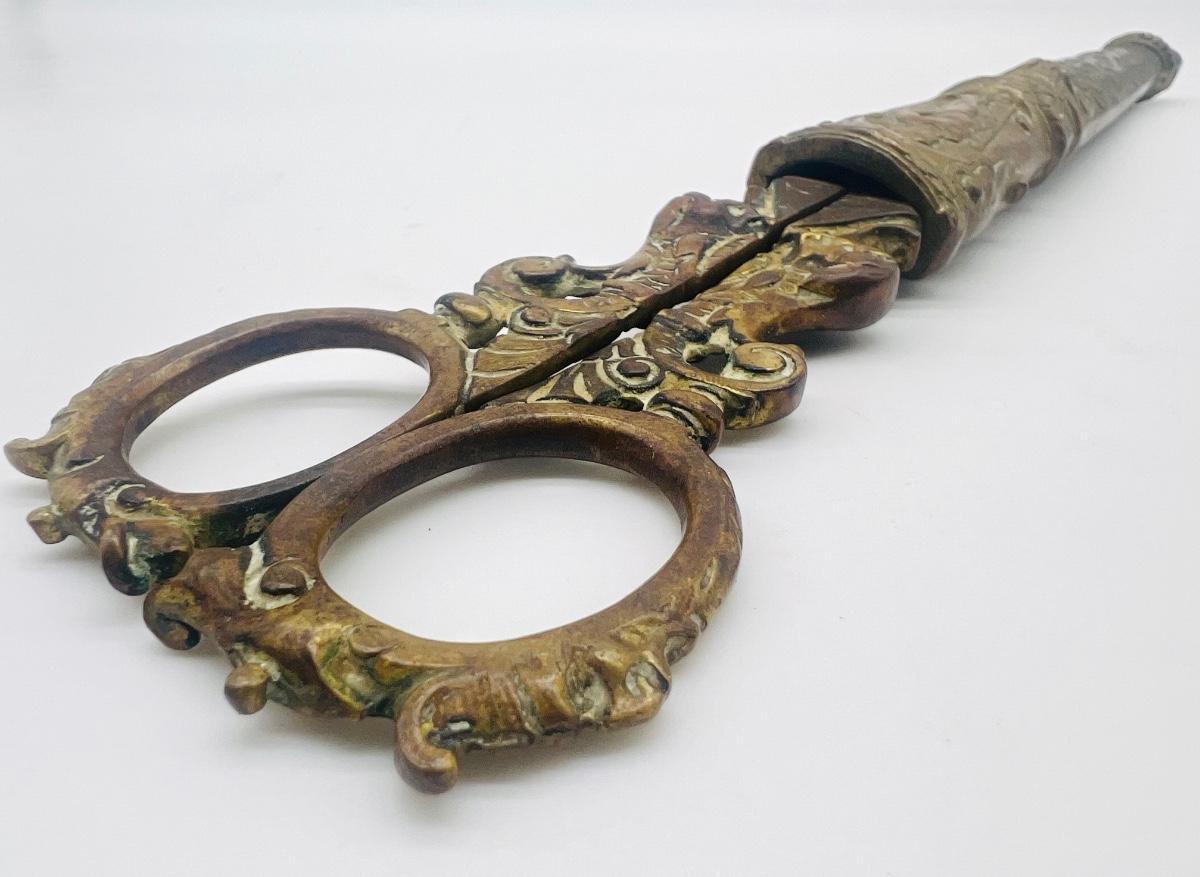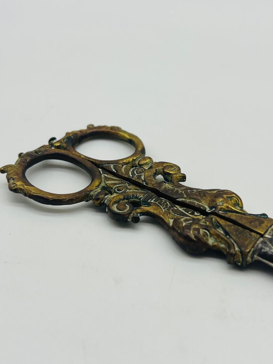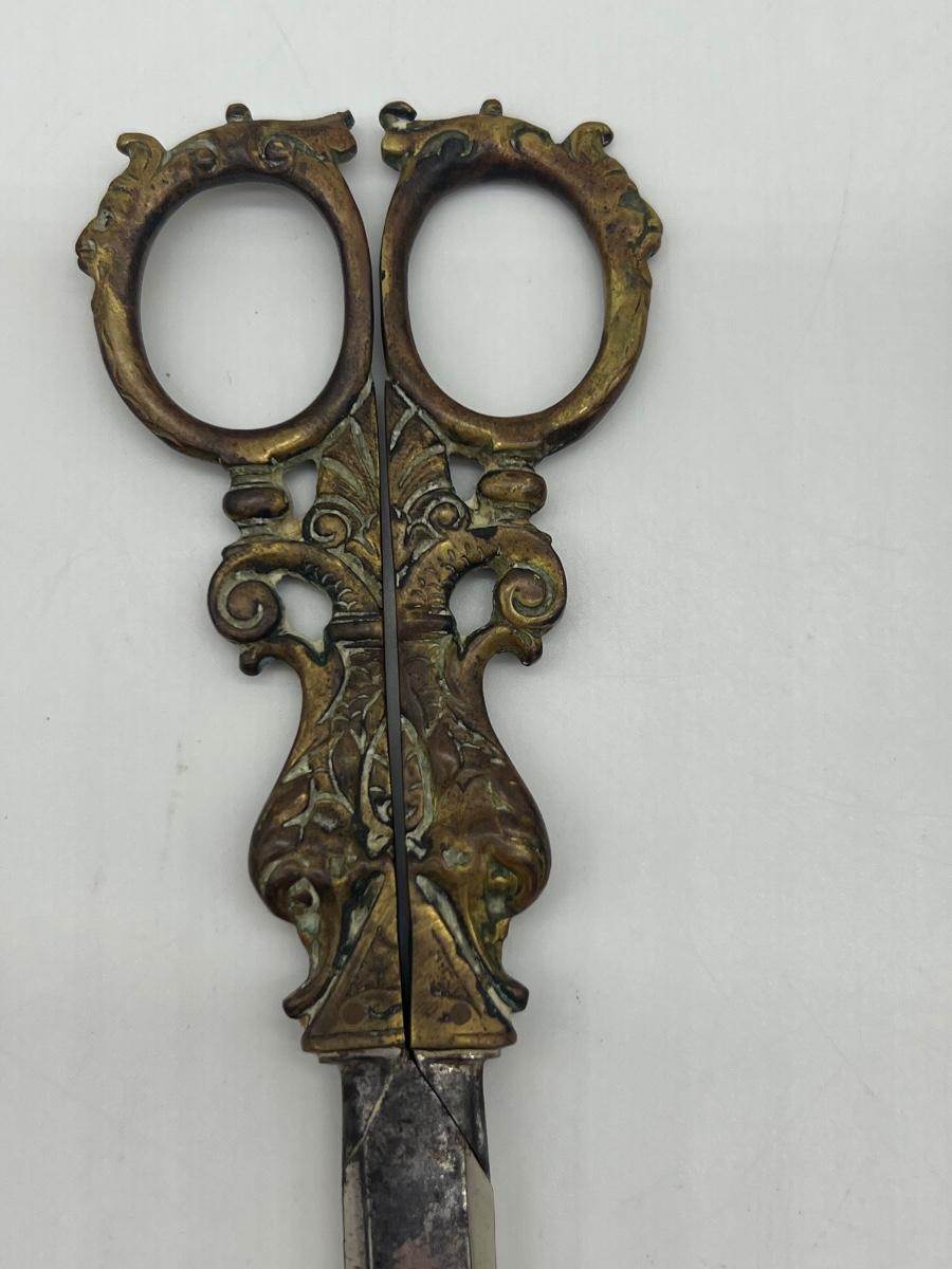 Antique Ornate Brass Scissors. Opens and closes easily. Measures