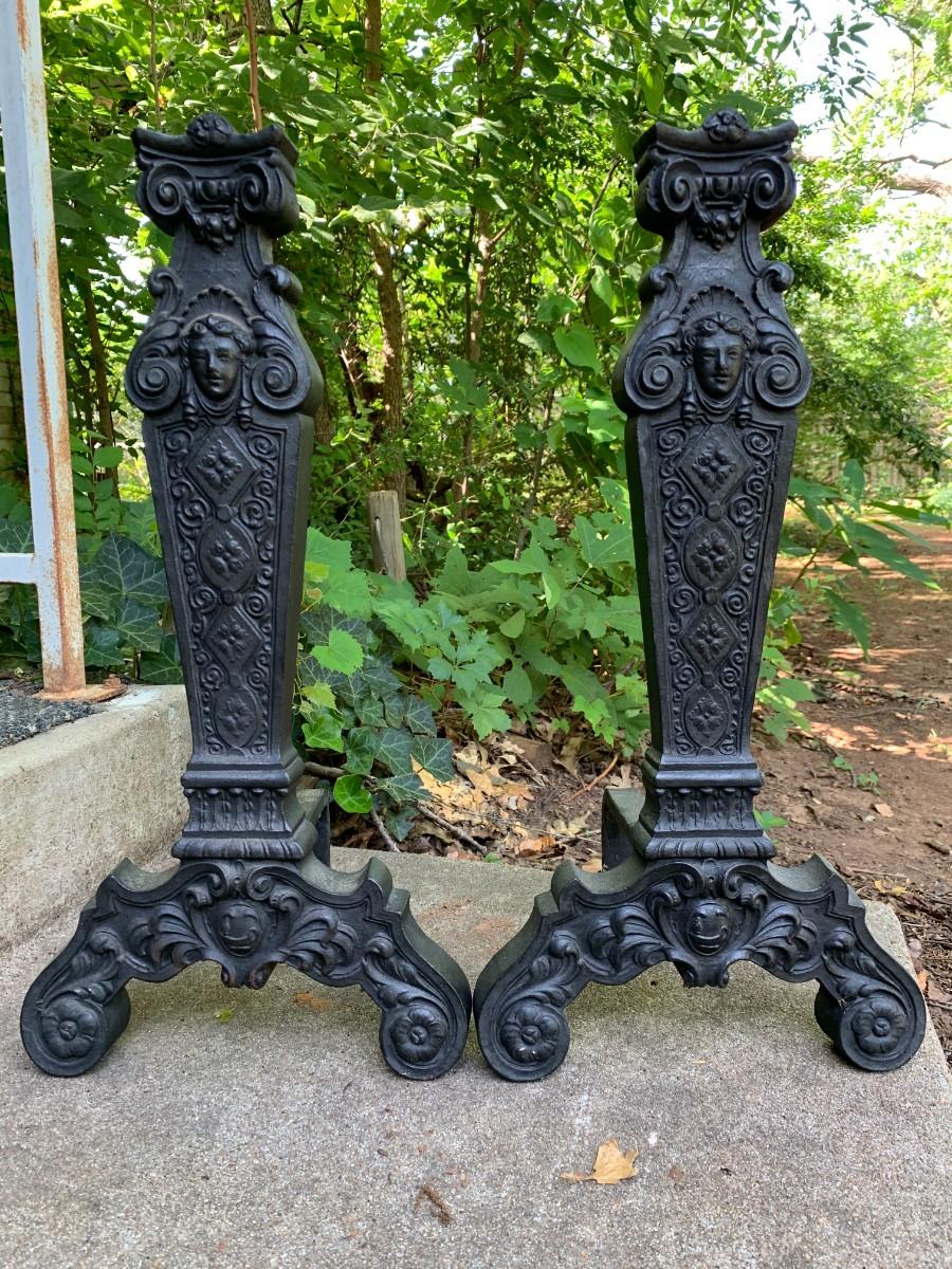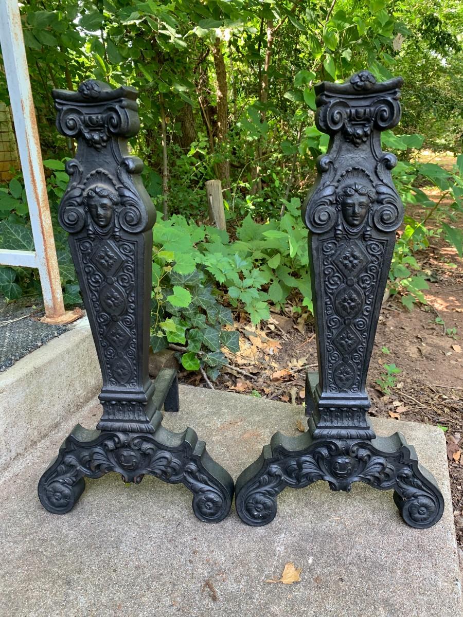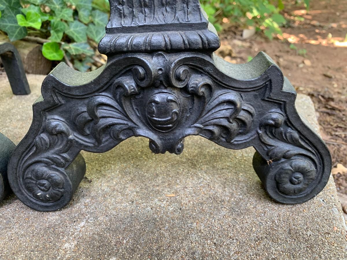 Antique Ornate Cast Iron Fireplace Andirons - excellent condition
