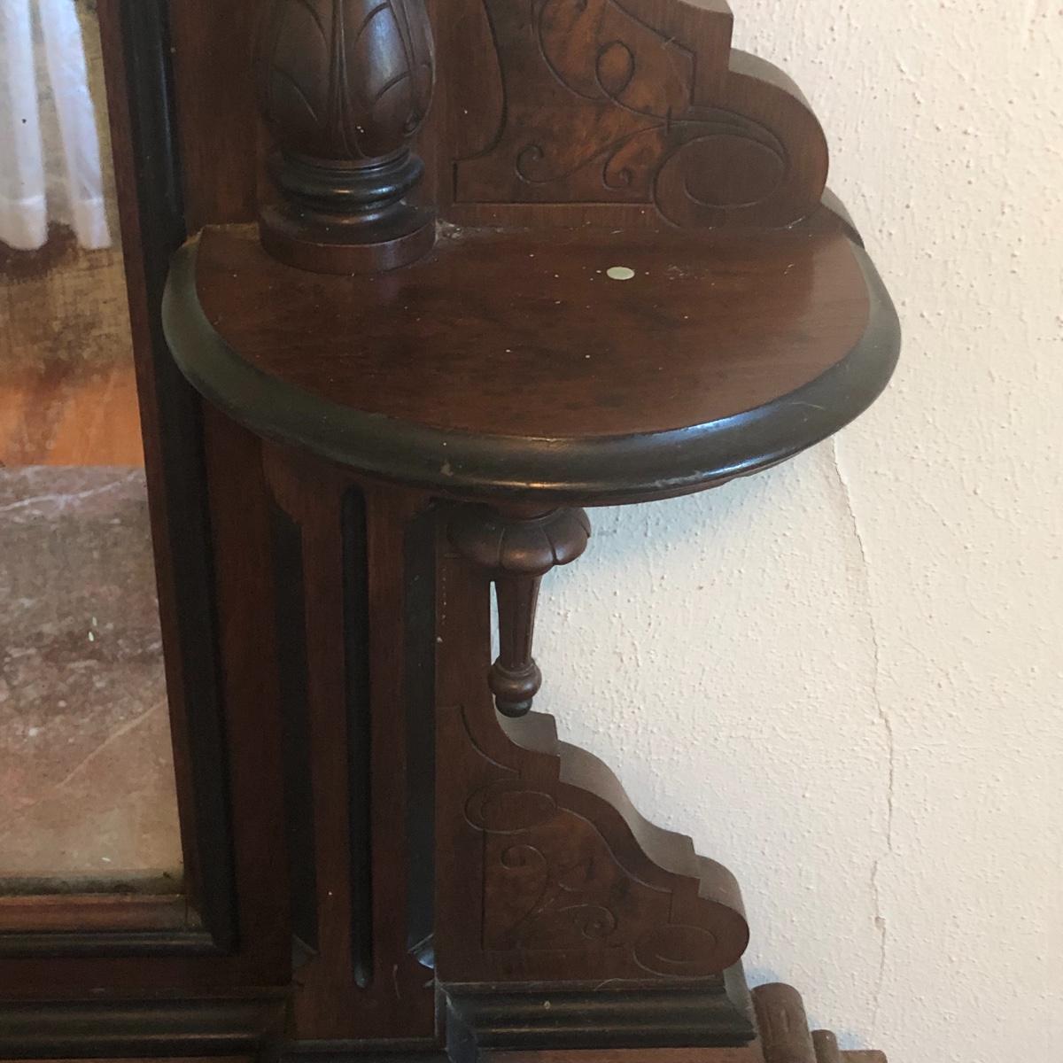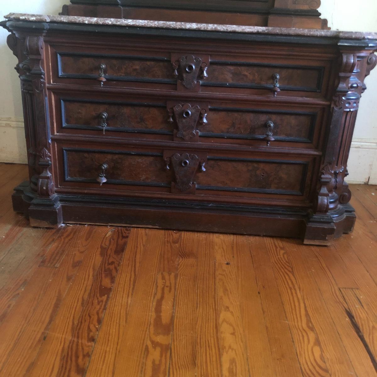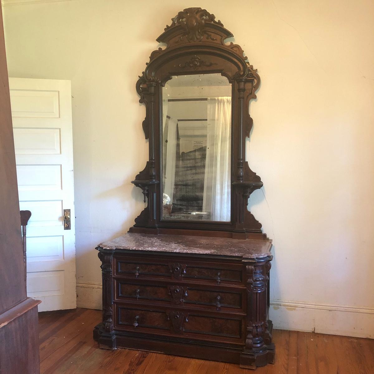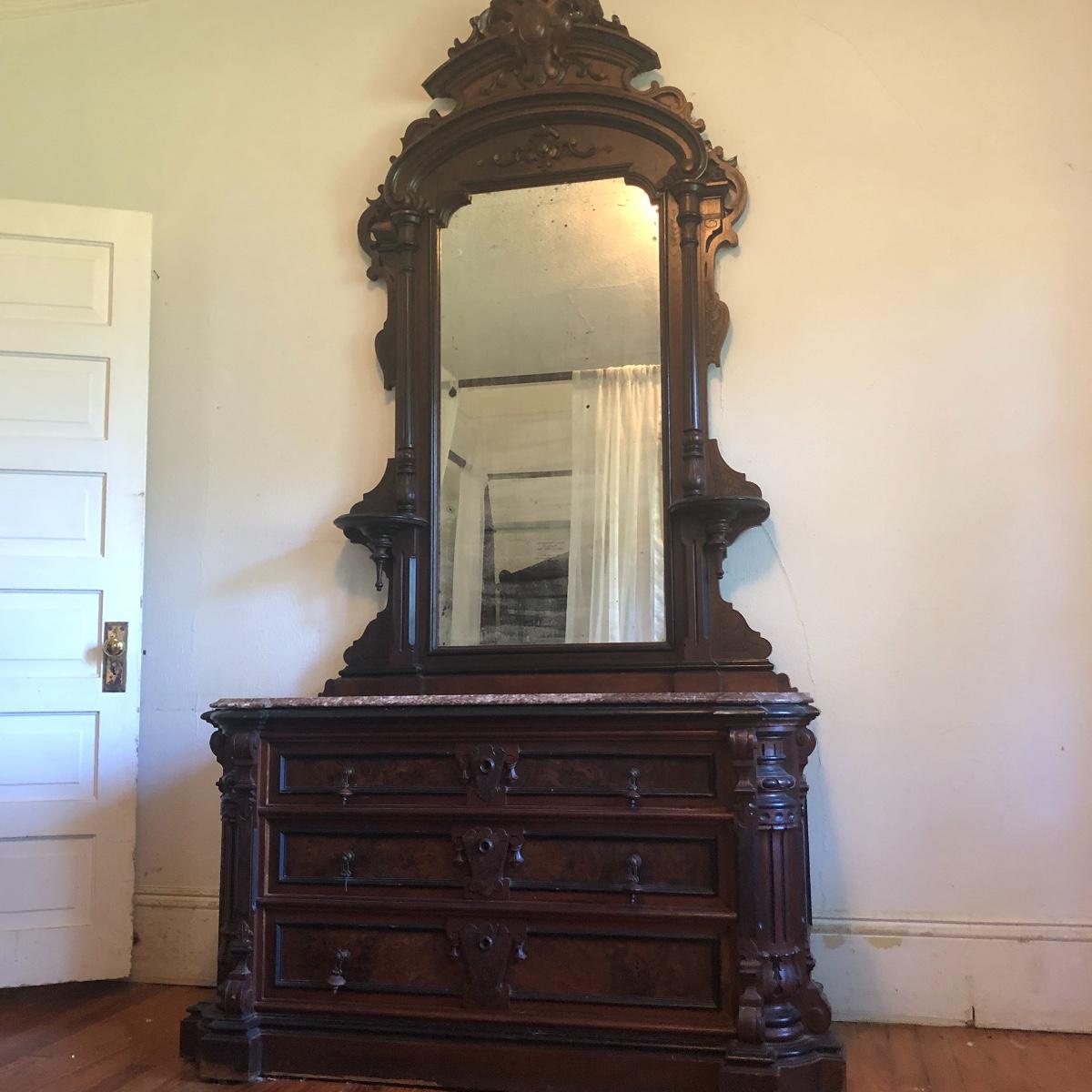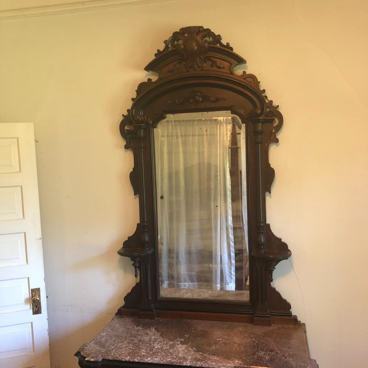 This large antique statement dresser is a very solid dark wood with ornate carvings and a stunning reddish brown and white marble top. Matching headboard/footboard in Lot 276. It’s three drawers are dovetailed and have locks (no key). It does show its age in areas, particularly the mirror that’s lead glass has spotting and streaking. One drawer handle is missing and another is missing it’s wood piece. Any white spots/drips appear to be paint and come off. The mirror has a broken cable to secure it to the wall. The marble is just placed and the mirror also, so that will make moving it a little easier, but it’s a very heavy piece, bring help to load.
