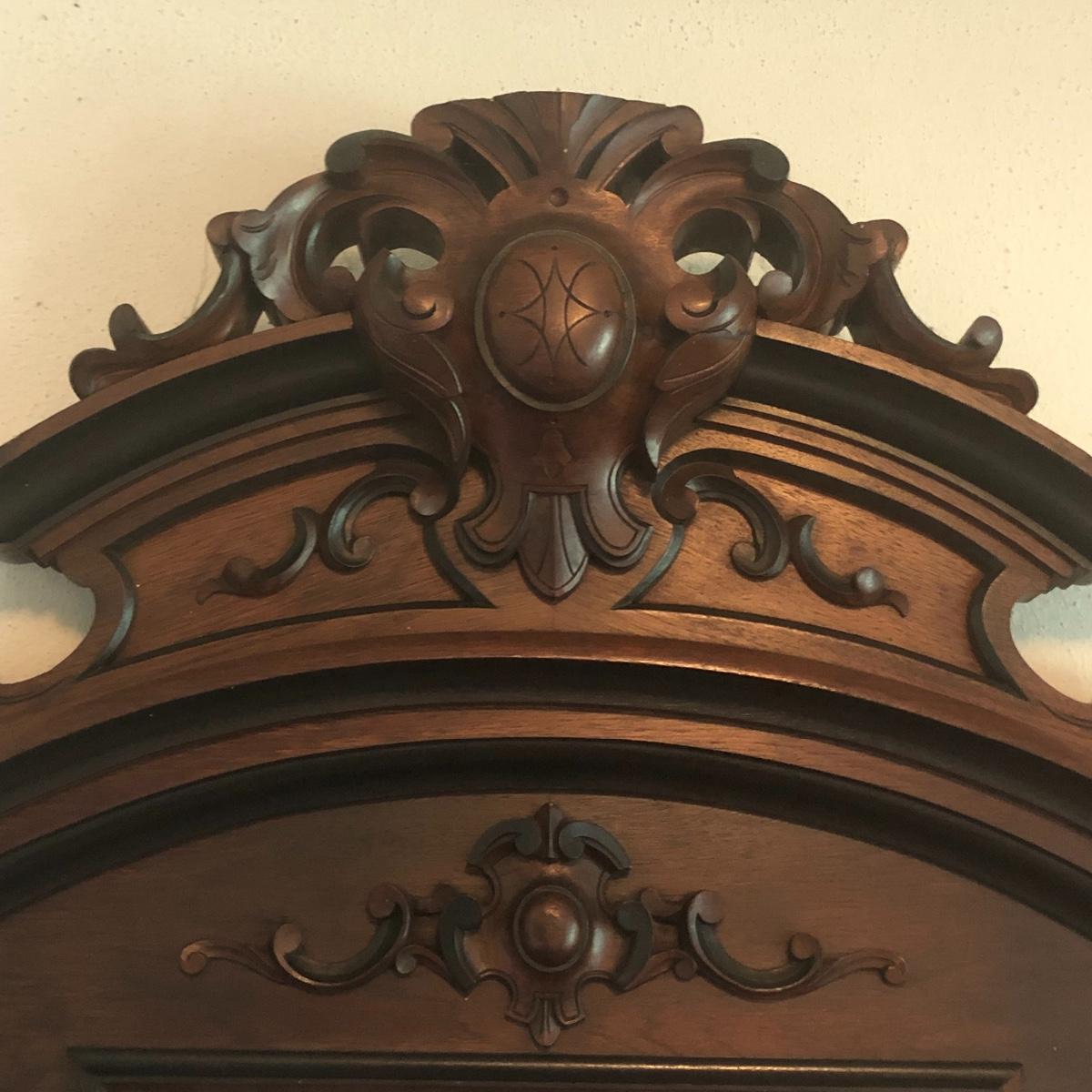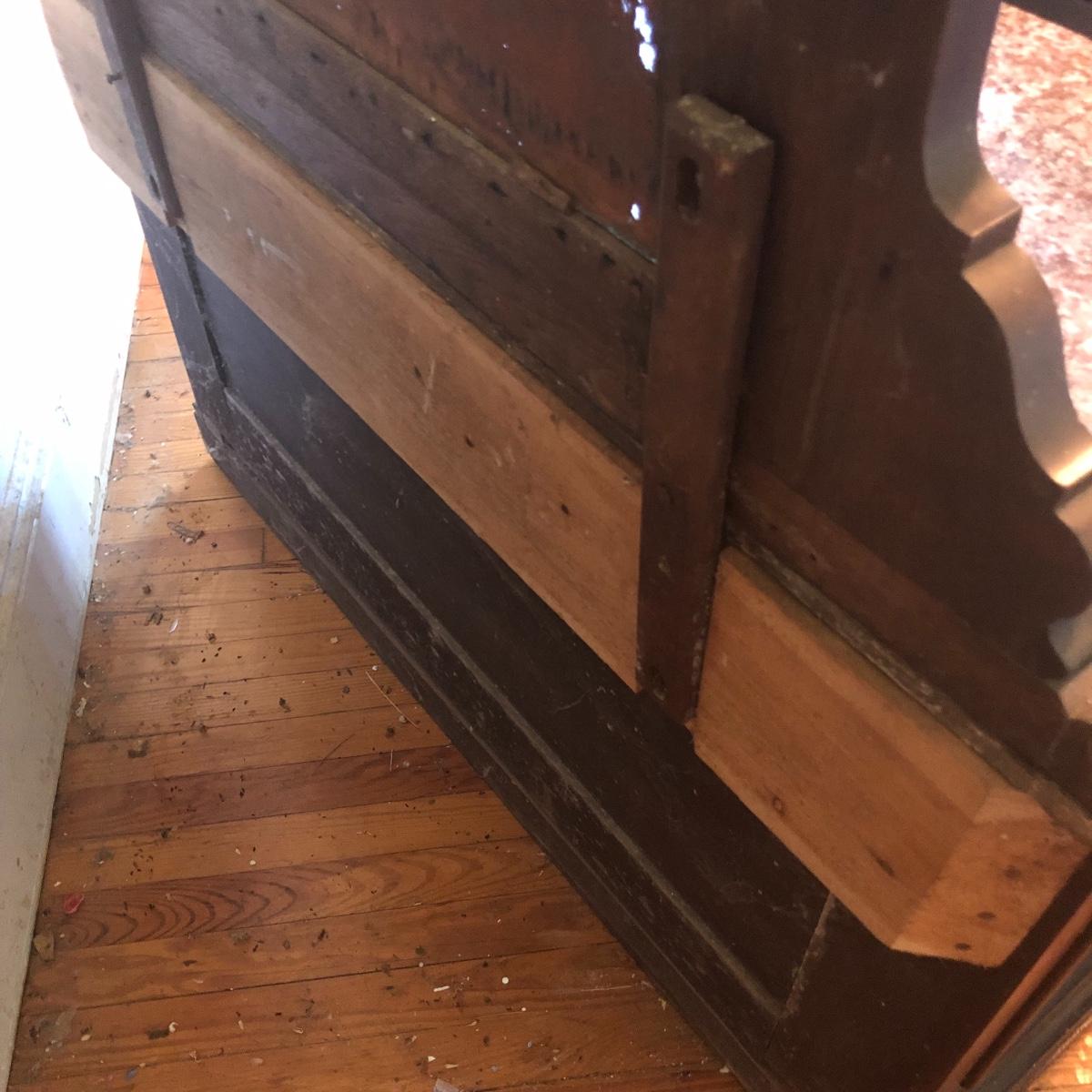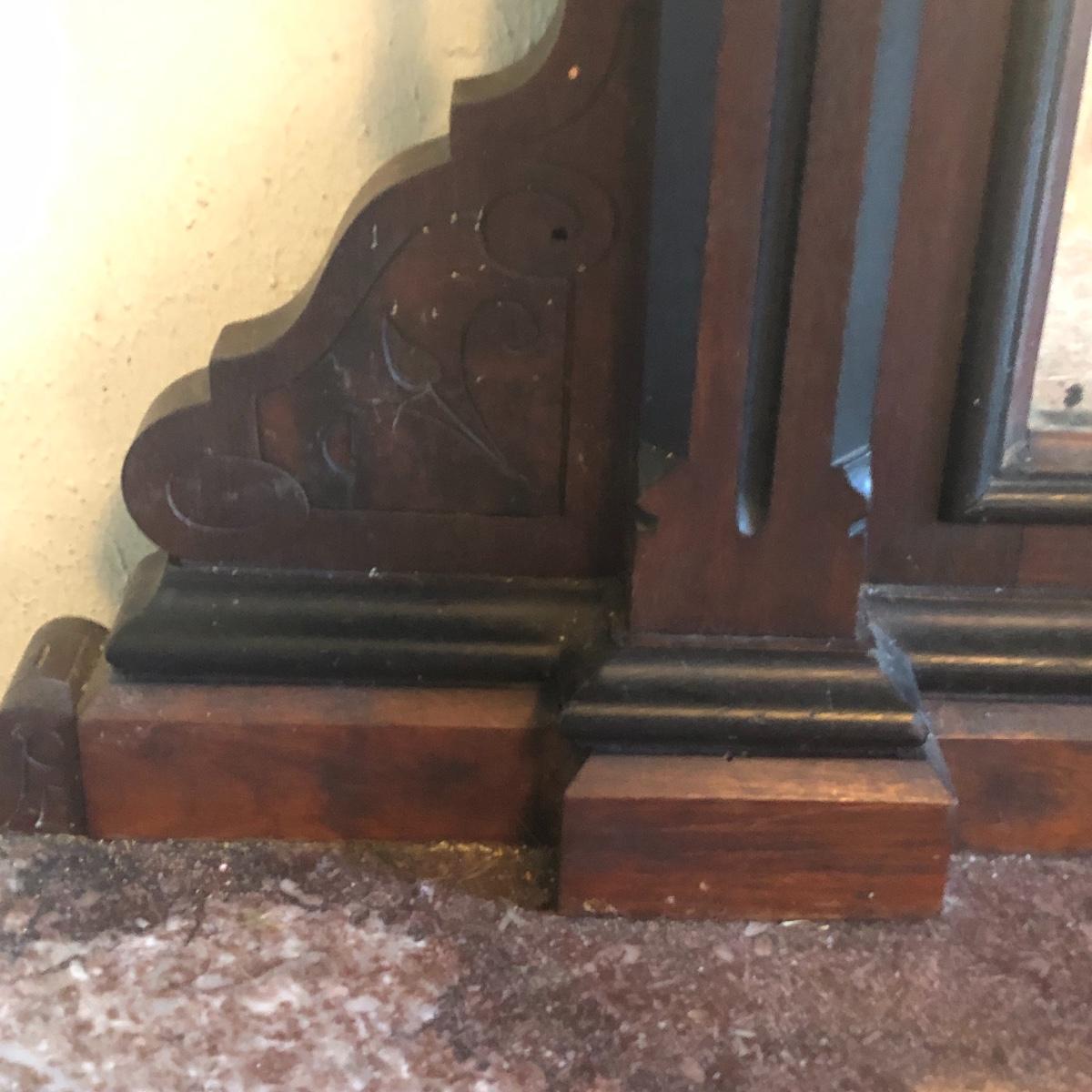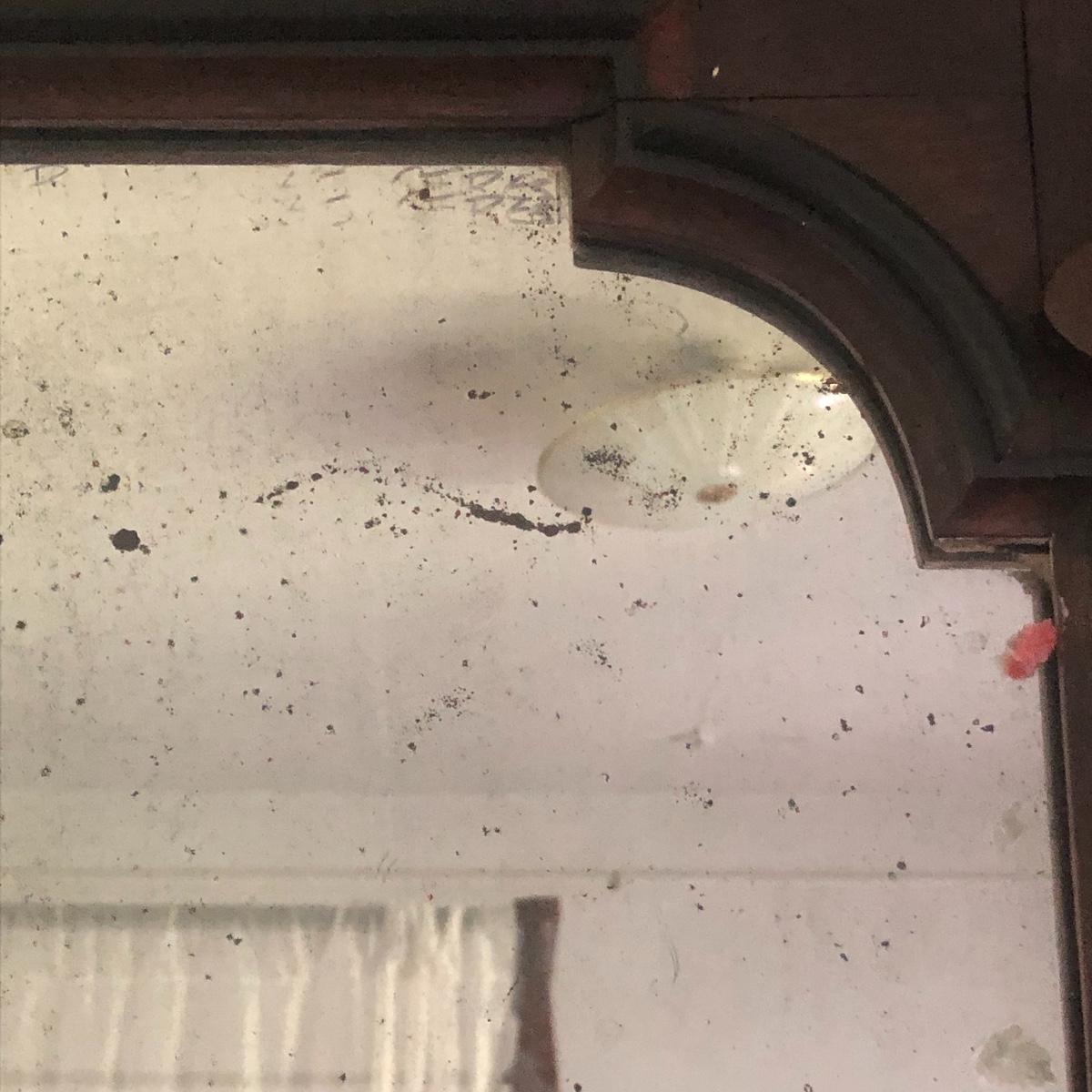 This large antique statement dresser is a very solid dark wood with ornate carvings and a stunning reddish brown and white marble top. Matching headboard/footboard in Lot 276. It’s three drawers are dovetailed and have locks (no key). It does show its age in areas, particularly the mirror that’s lead glass has spotting and streaking. One drawer handle is missing and another is missing it’s wood piece. Any white spots/drips appear to be paint and come off. The mirror has a broken cable to secure it to the wall. The marble is just placed and the mirror also, so that will make moving it a little easier, but it’s a very heavy piece, bring help to load.