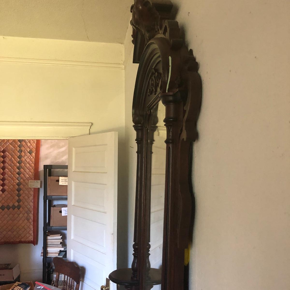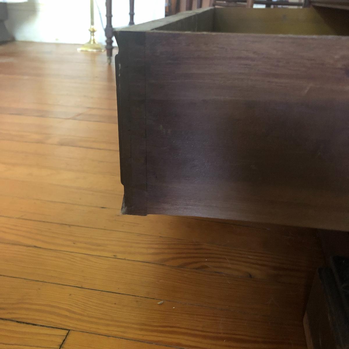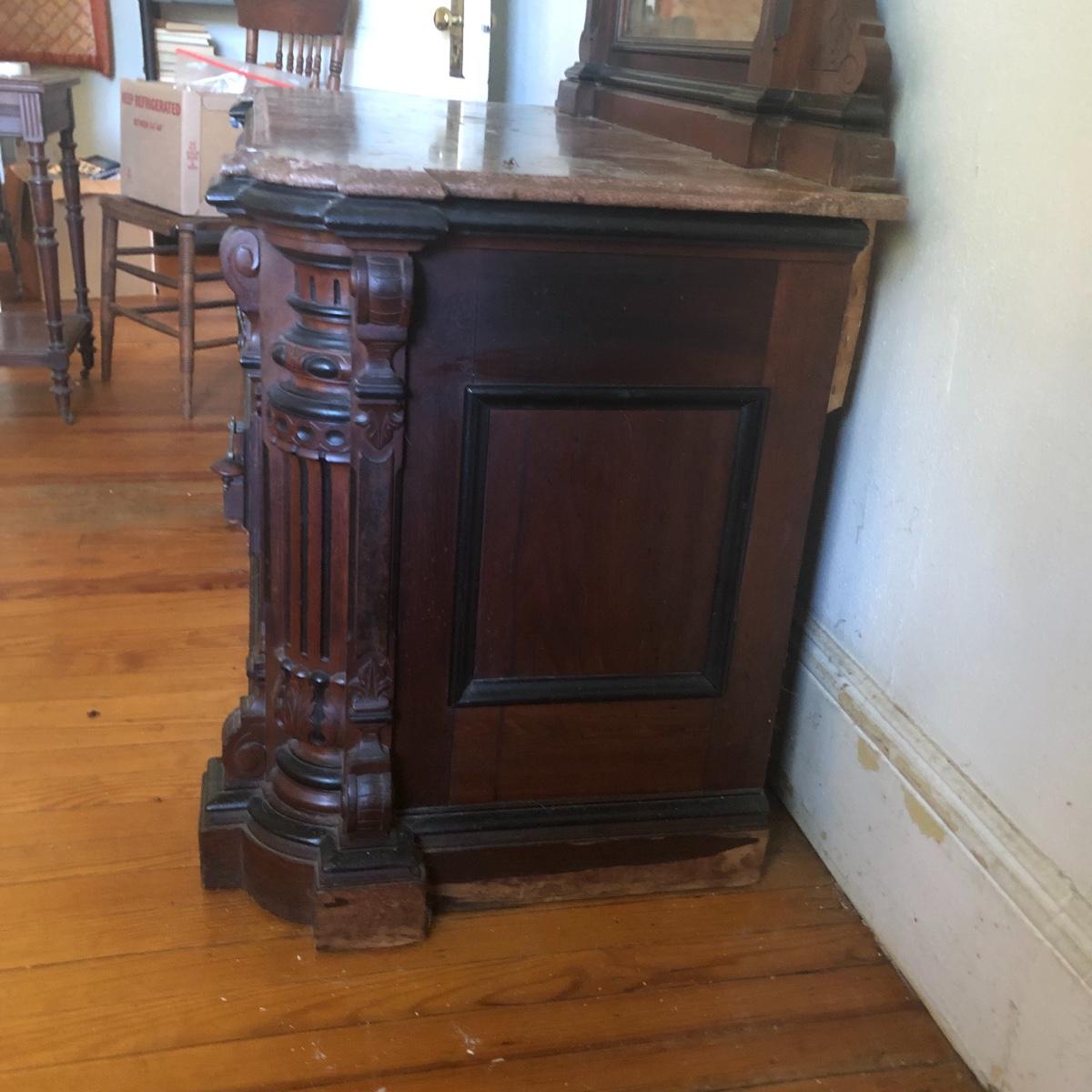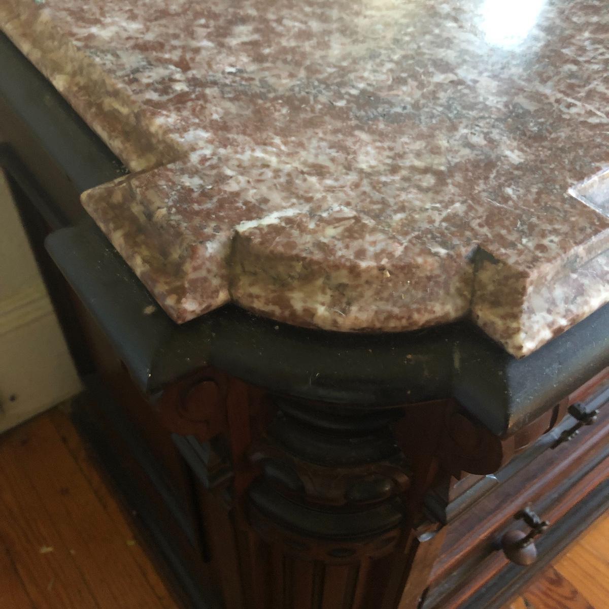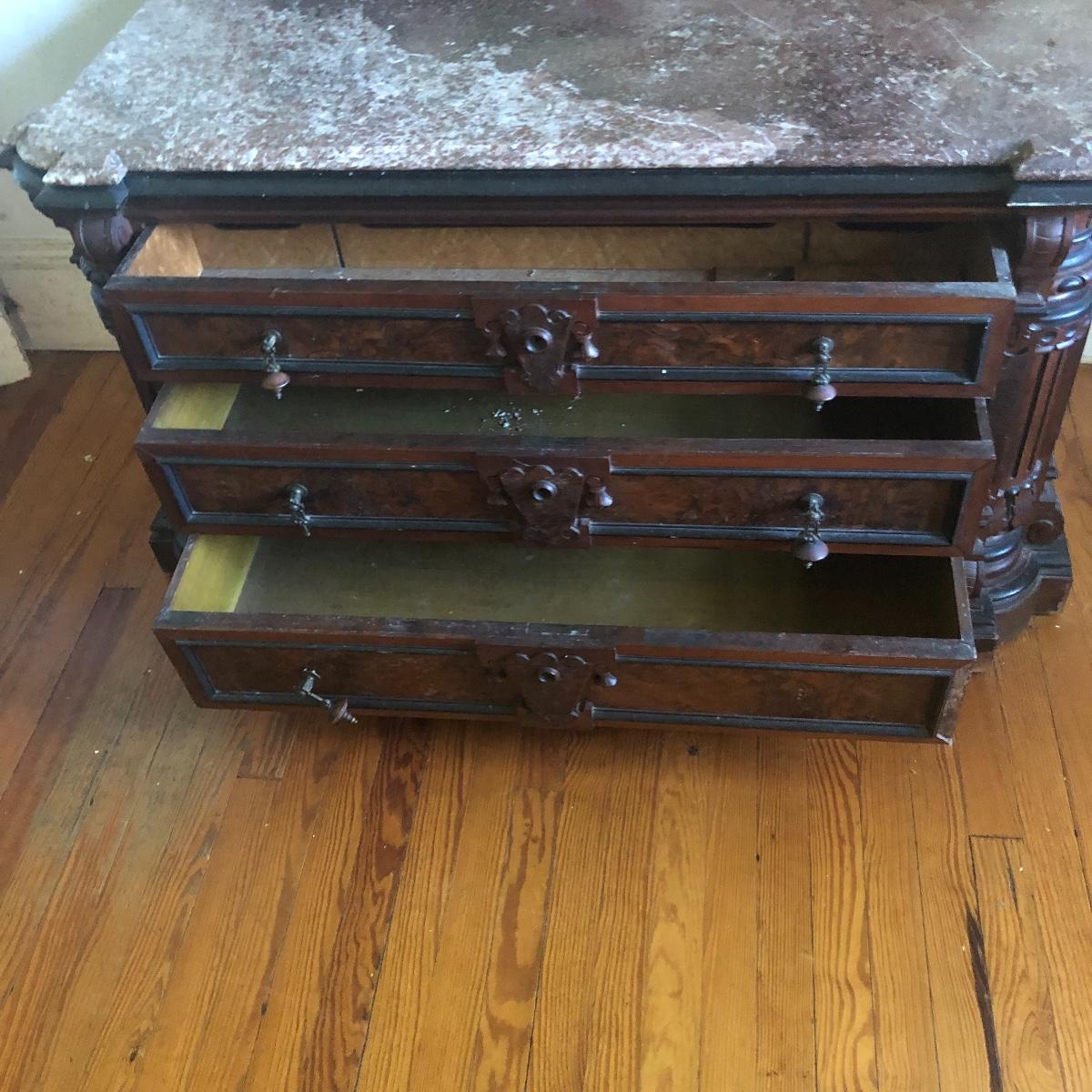 This large antique statement dresser is a very solid dark wood with ornate carvings and a stunning reddish brown and white marble top. Matching headboard/footboard in Lot 276. It’s three drawers are dovetailed and have locks (no key). It does show its age in areas, particularly the mirror that’s lead glass has spotting and streaking. One drawer handle is missing and another is missing it’s wood piece. Any white spots/drips appear to be paint and come off. The mirror has a broken cable to secure it to the wall. The marble is just placed and the mirror also, so that will make moving it a little easier, but it’s a very heavy piece, bring help to load.