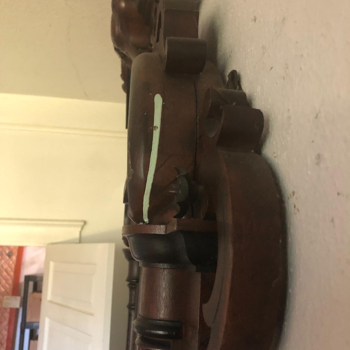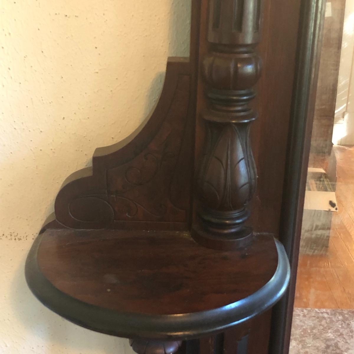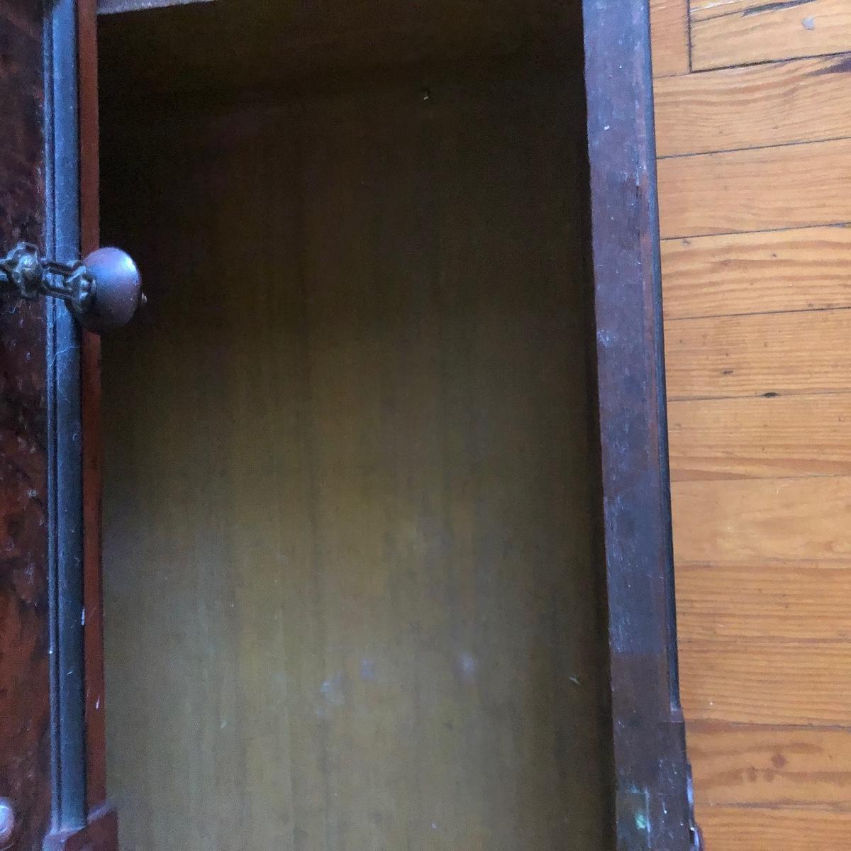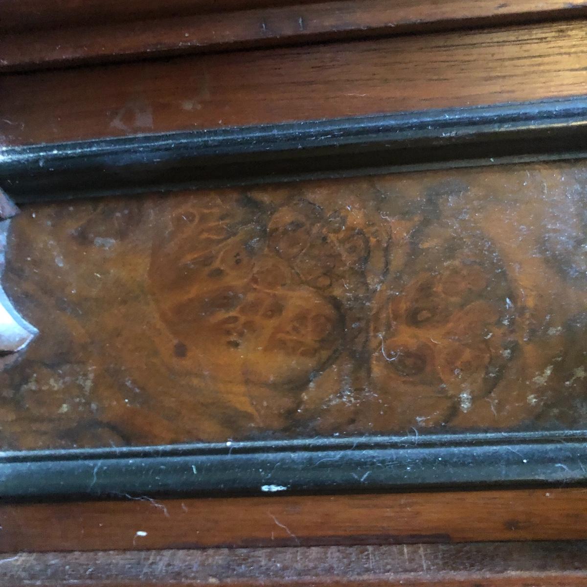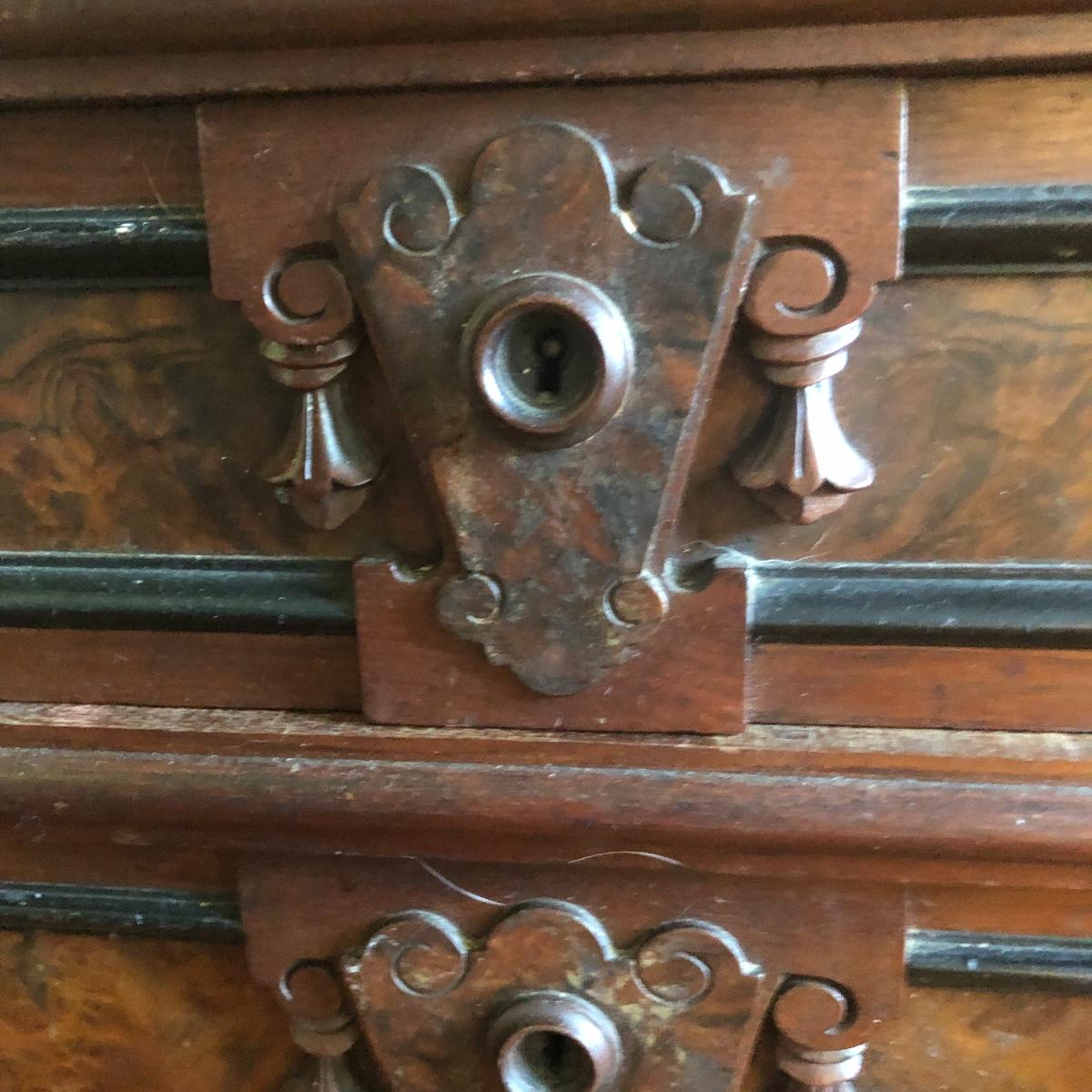 This large antique statement dresser is a very solid dark wood with ornate carvings and a stunning reddish brown and white marble top. Matching headboard/footboard in Lot 276. It’s three drawers are dovetailed and have locks (no key). It does show its age in areas, particularly the mirror that’s lead glass has spotting and streaking. One drawer handle is missing and another is missing it’s wood piece. Any white spots/drips appear to be paint and come off. The mirror has a broken cable to secure it to the wall. The marble is just placed and the mirror also, so that will make moving it a little easier, but it’s a very heavy piece, bring help to load.