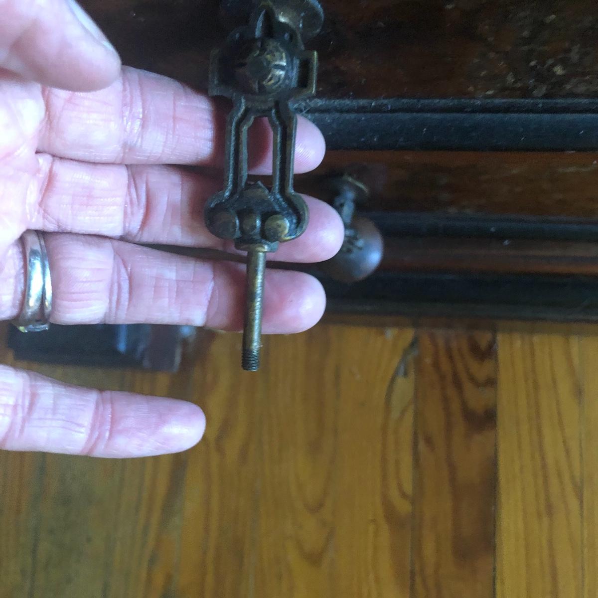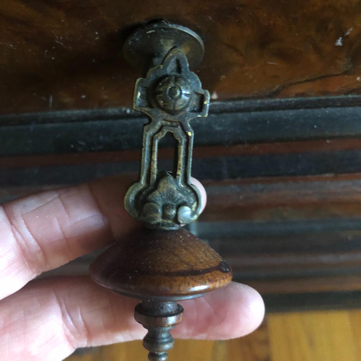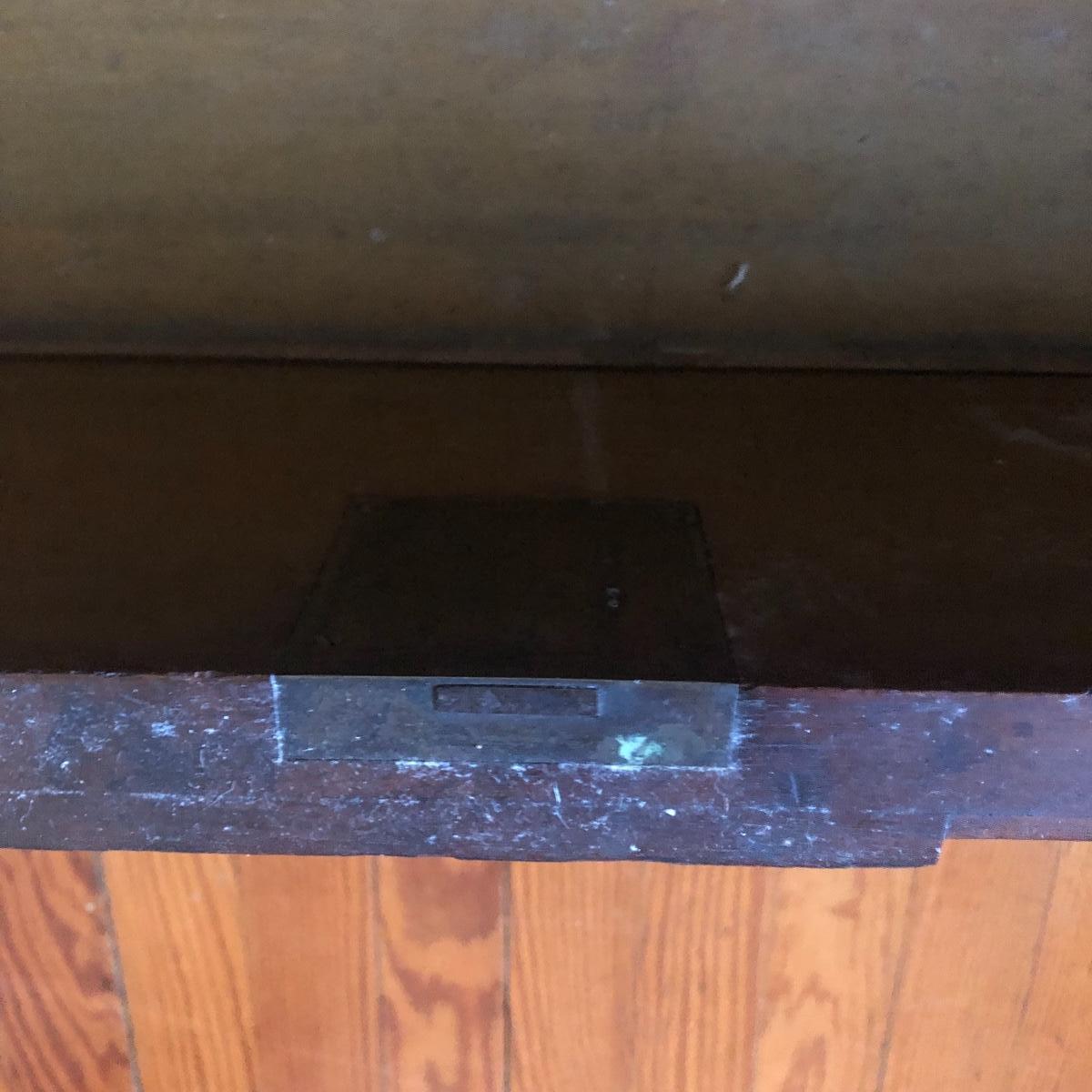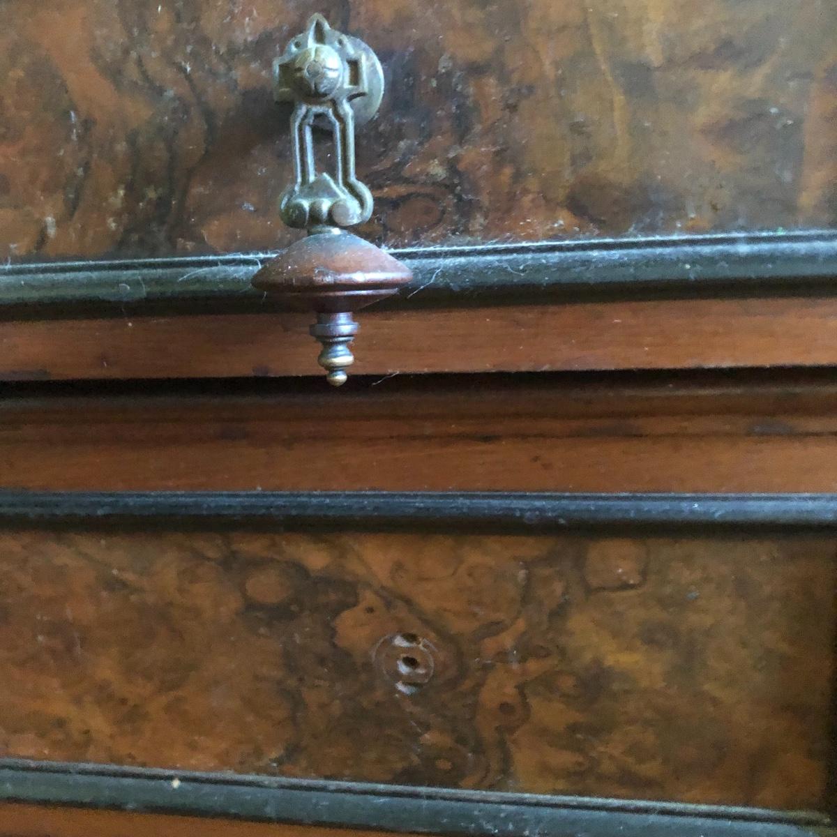 This large antique statement dresser is a very solid dark wood with ornate carvings and a stunning reddish brown and white marble top. Matching headboard/footboard in Lot 276. It’s three drawers are dovetailed and have locks (no key). It does show its age in areas, particularly the mirror that’s lead glass has spotting and streaking. One drawer handle is missing and another is missing it’s wood piece. Any white spots/drips appear to be paint and come off. The mirror has a broken cable to secure it to the wall. The marble is just placed and the mirror also, so that will make moving it a little easier, but it’s a very heavy piece, bring help to load.