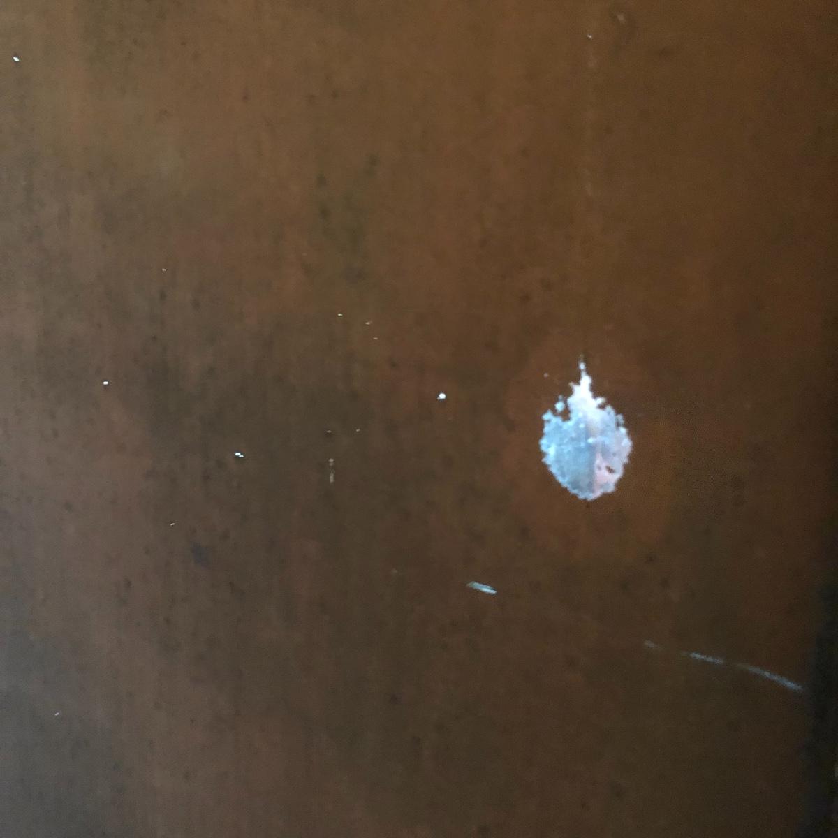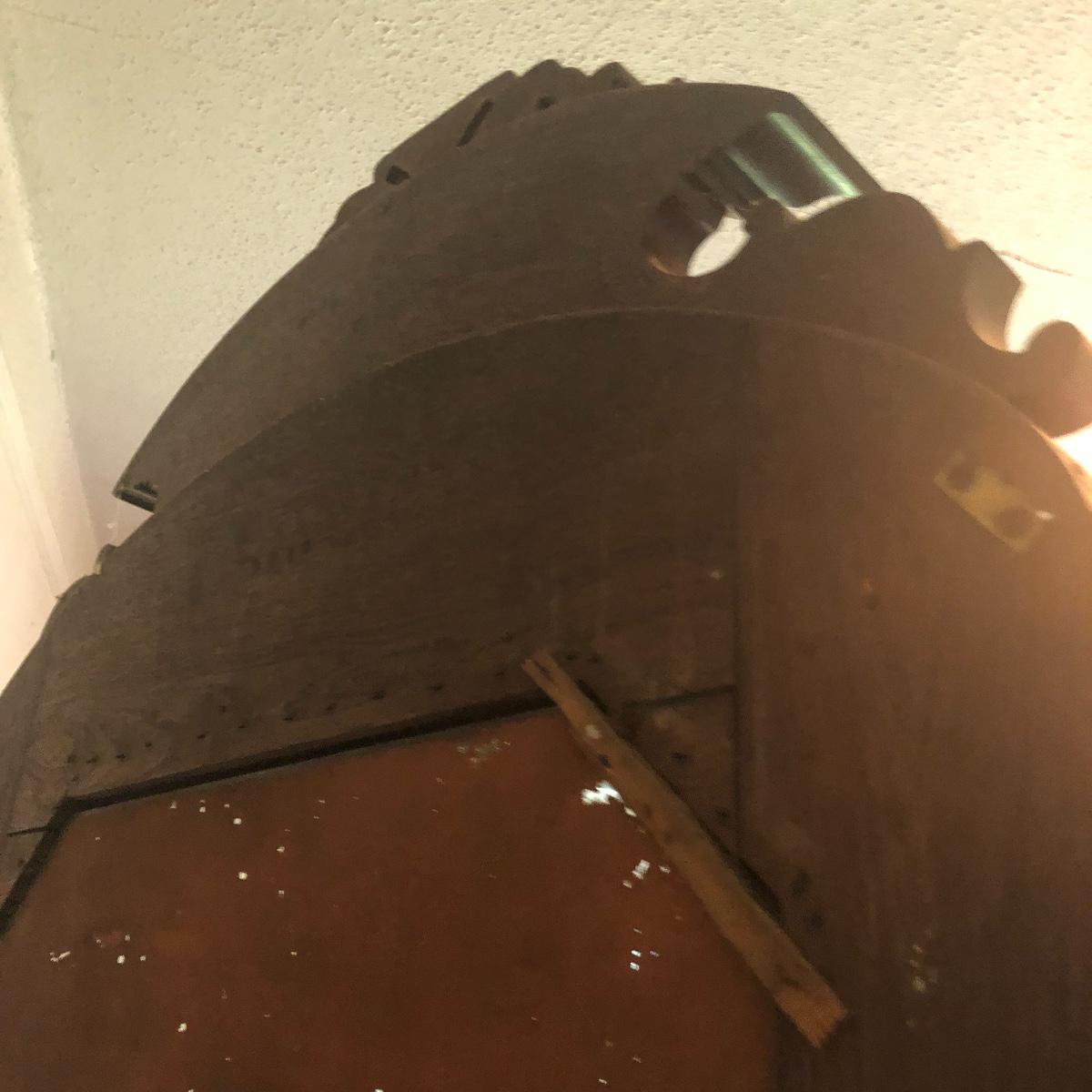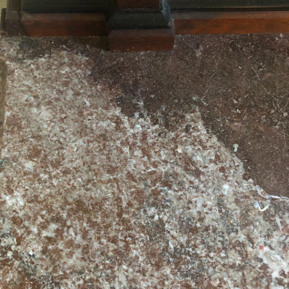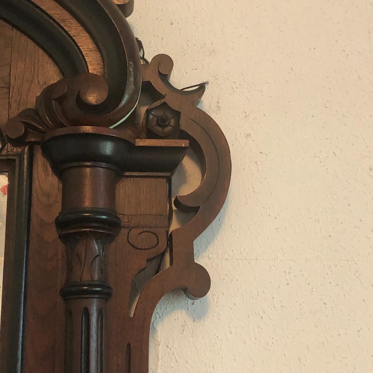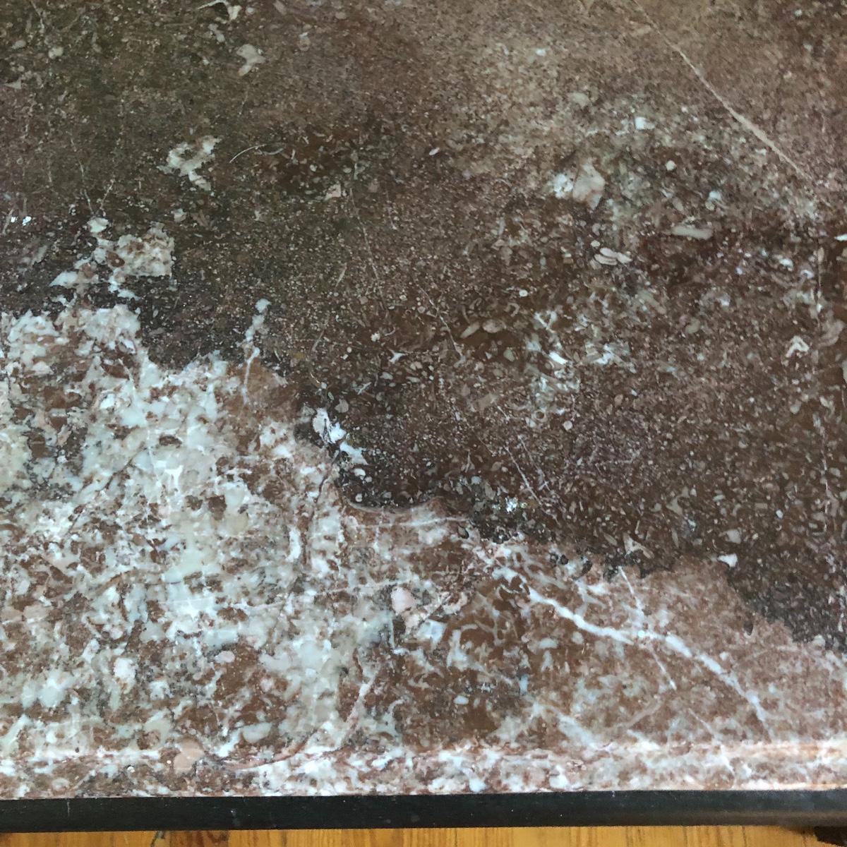 This large antique statement dresser is a very solid dark wood with ornate carvings and a stunning reddish brown and white marble top. Matching headboard/footboard in Lot 276. It’s three drawers are dovetailed and have locks (no key). It does show its age in areas, particularly the mirror that’s lead glass has spotting and streaking. One drawer handle is missing and another is missing it’s wood piece. Any white spots/drips appear to be paint and come off. The mirror has a broken cable to secure it to the wall. The marble is just placed and the mirror also, so that will make moving it a little easier, but it’s a very heavy piece, bring help to load.
