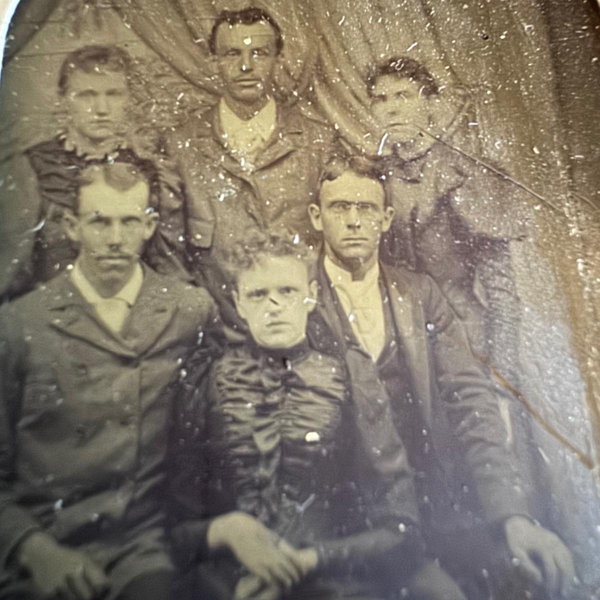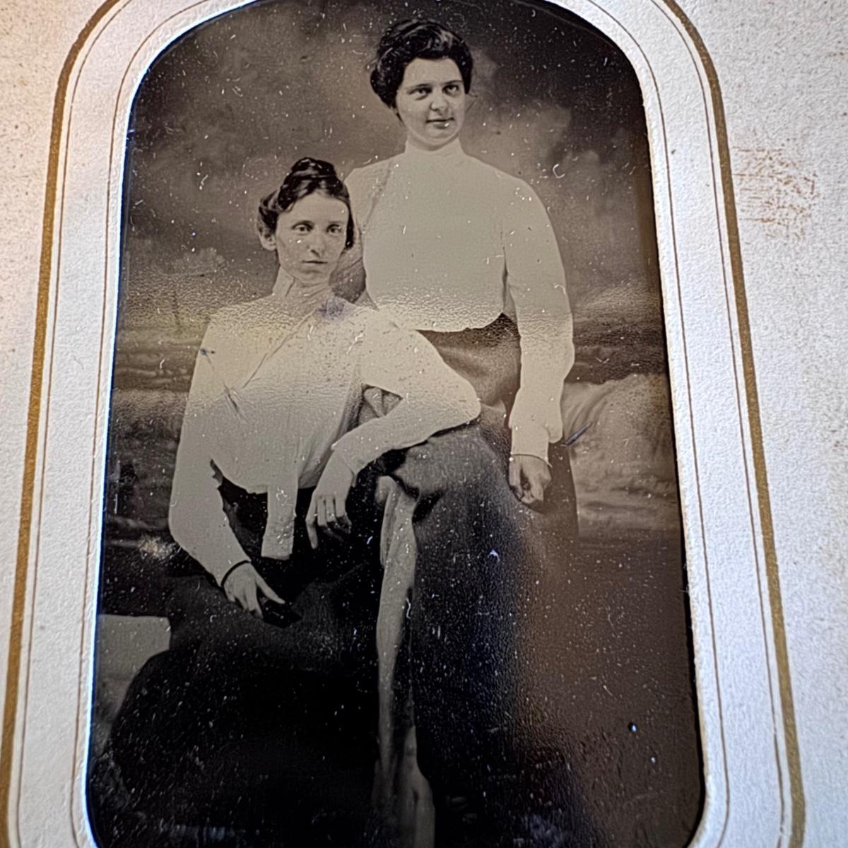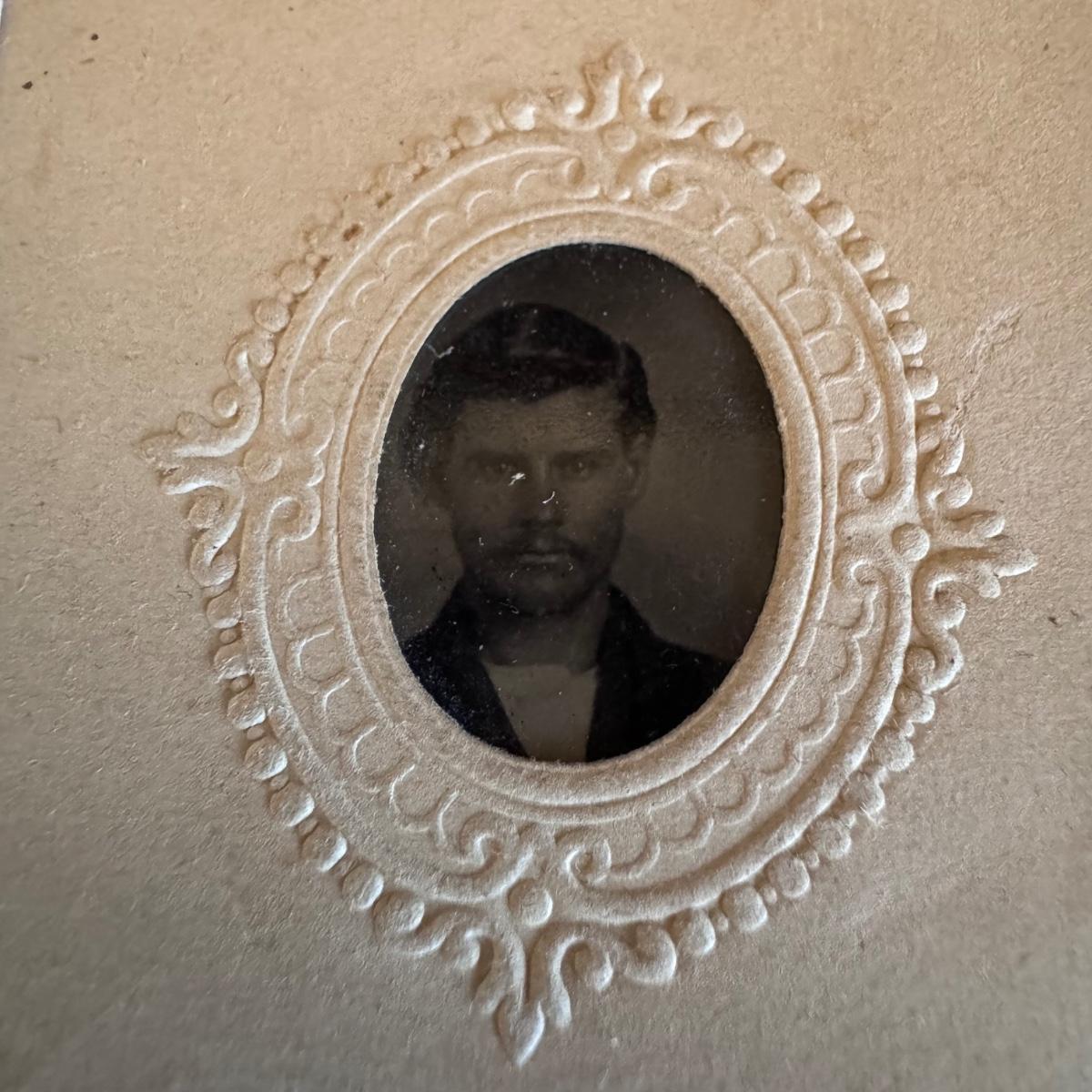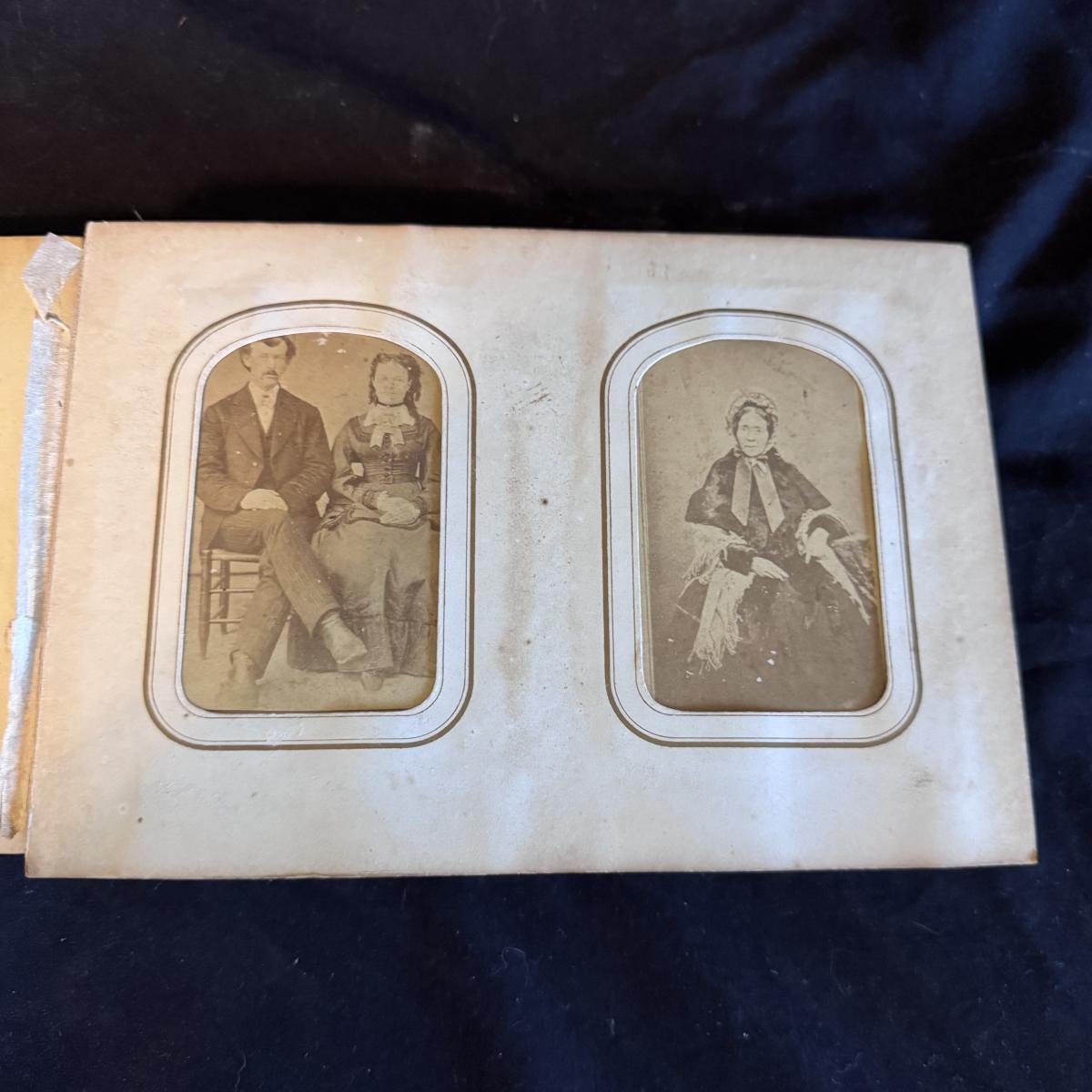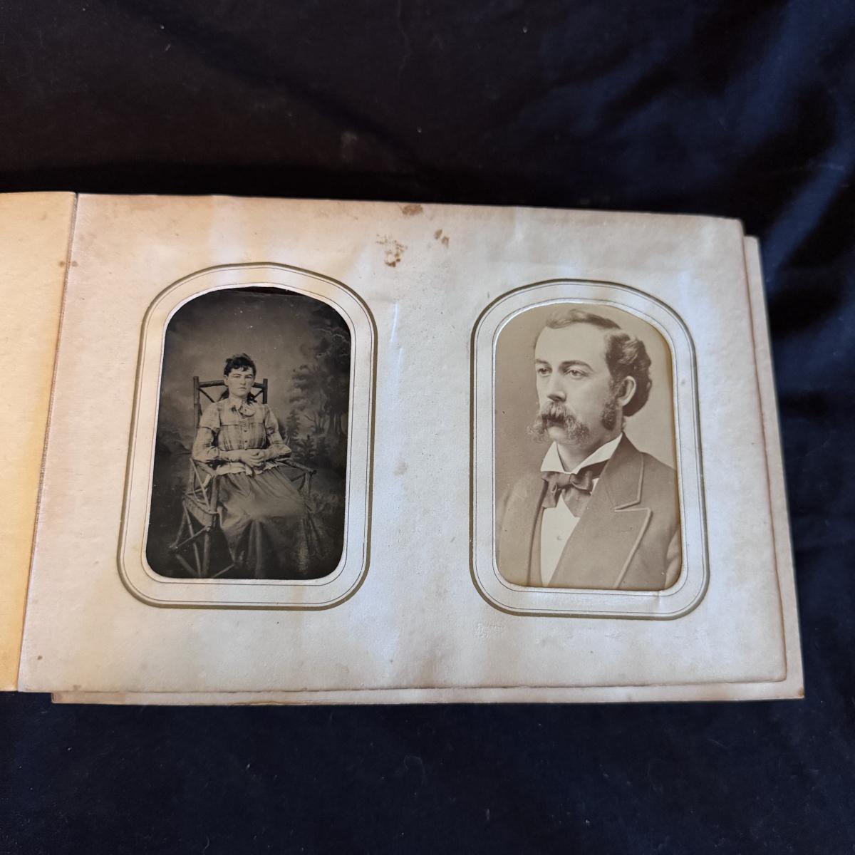 This lot includes one really special antique photo album with ornate detail. It includes several antique photos that tell a story by just looking at them. The photo album is in antique condition - it is not attached to the binding. Also included are two old photos that are in a pretty old frame and under glass. Some nicks in the finish of the frame, see pics, it measures 12” x 8.5”H. The album measures 8” x 6” x 2”H. Shipping available.