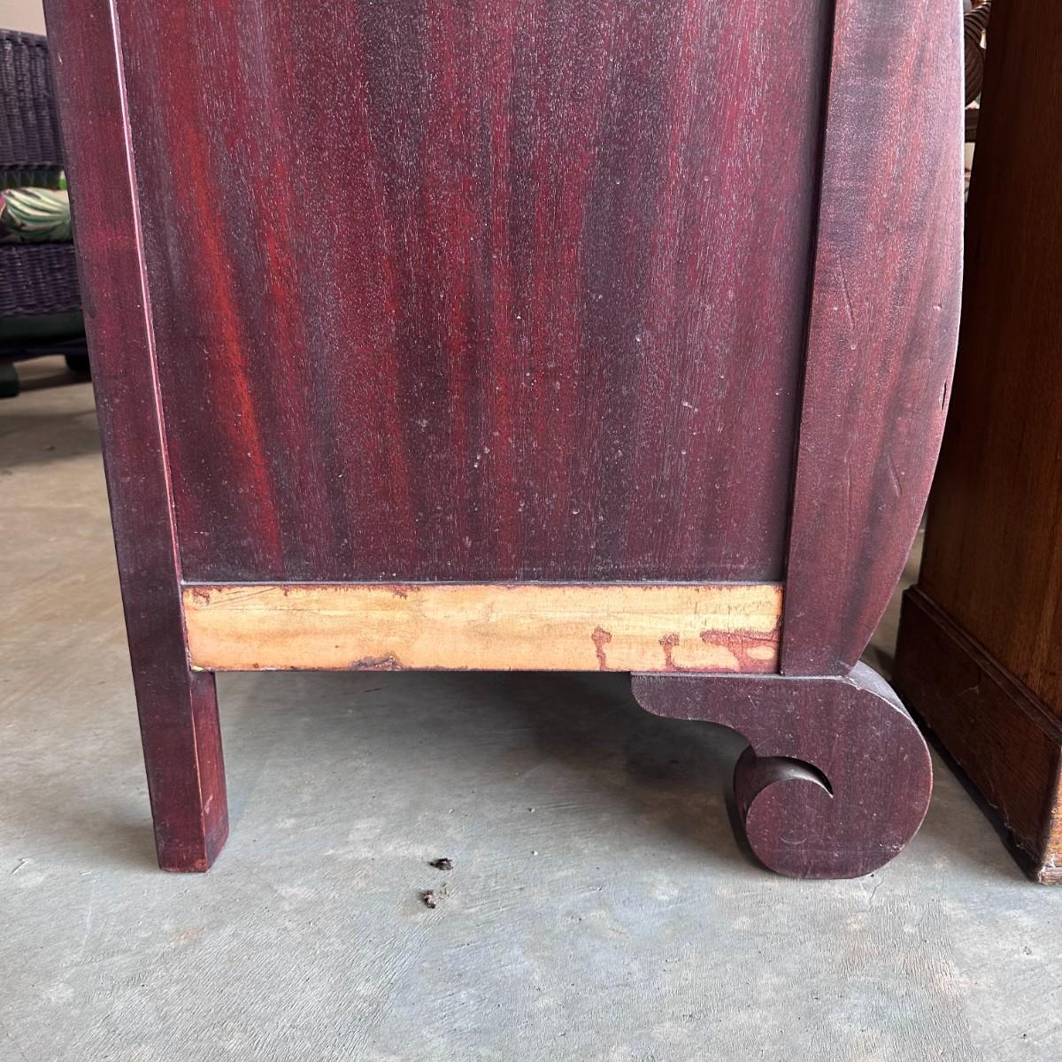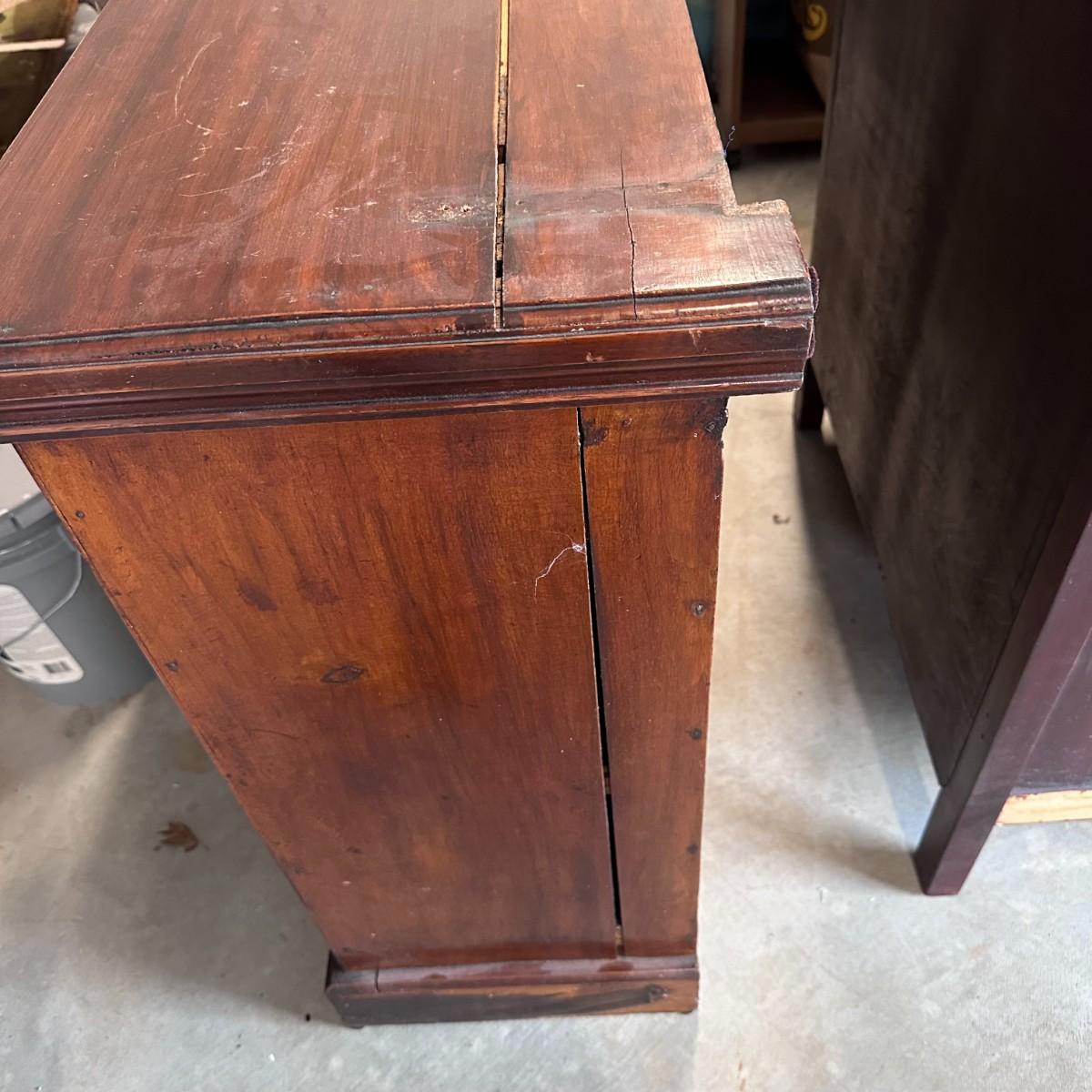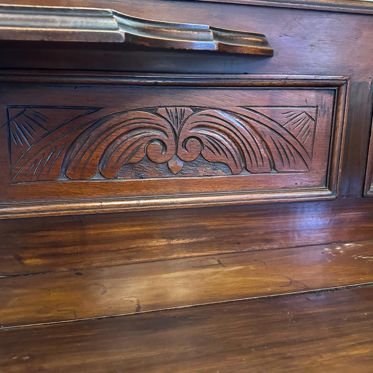 The sideboard buffet is a beautiful antique and has intricate ornate details. Its surface is a dark wood mostly in excellent condition. The wood is solid, drawers and doors open cleanly, and the cabinet has no visible damage except for a small separation crack as shown in the photo, on the top left of the piece.