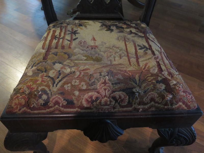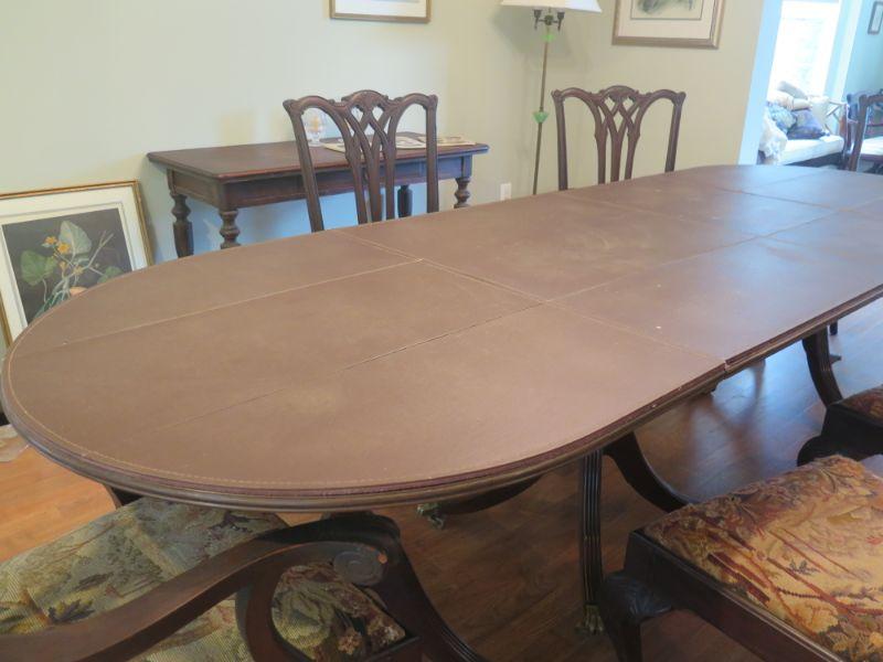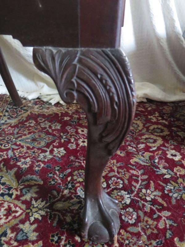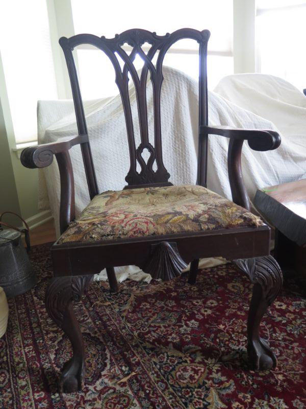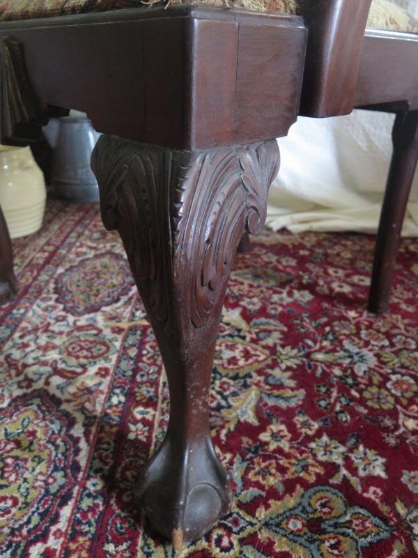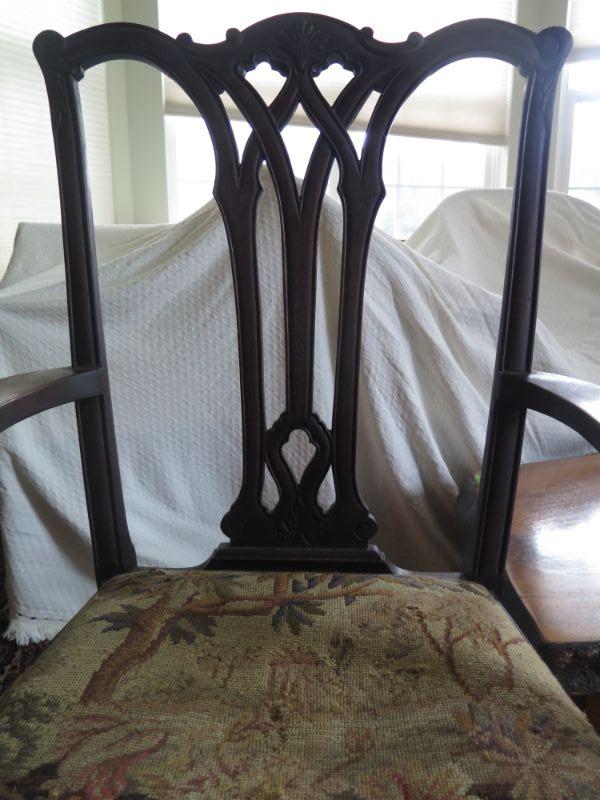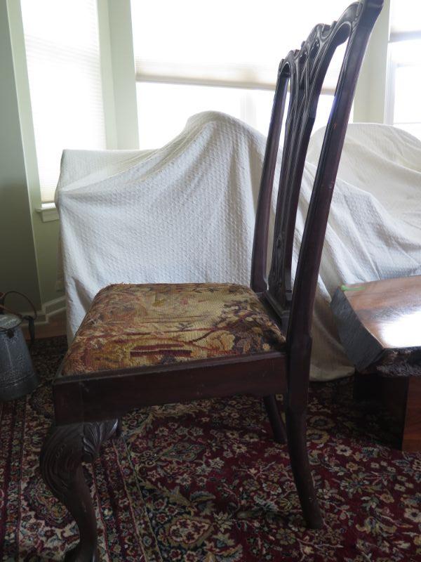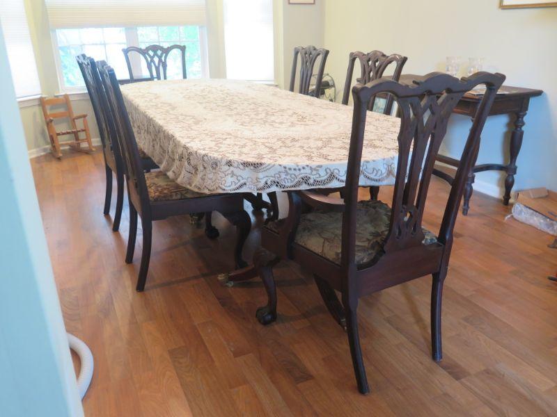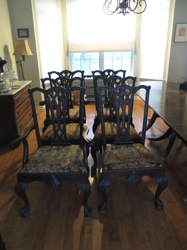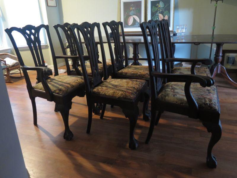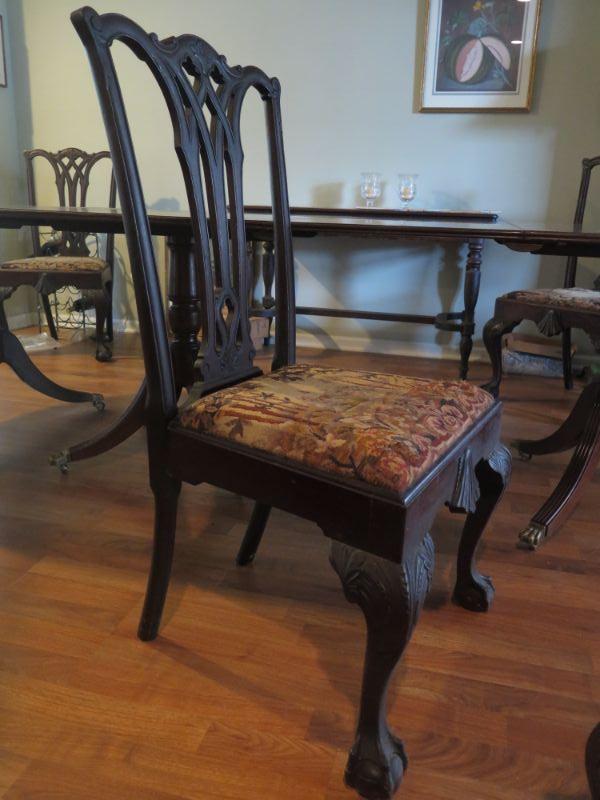 Antique oval mahogany dining table with 6 Chippendale chairs with ball and claw feet. Chairs have tapestry seats and there are two armchairs and 4 regular chairs. Table has 2 leaves. Comes with table pad and table cloth. **Please read Terms and Conditions before placing a bid. Pick up is Sunday, September 1, 2019 from 10am to 4pm in Williamstown. All sales are final. All sales are as is, where is. Please review all photos. Any props included in photos are not included in listing. All measurements are approximate. Comes from a home with cats.