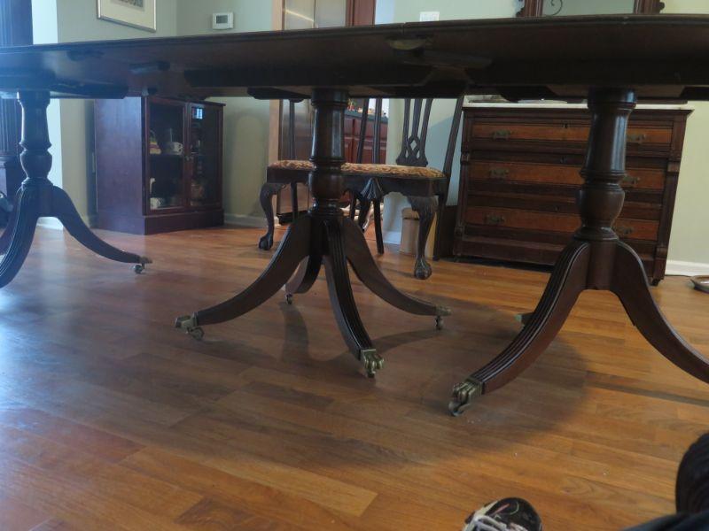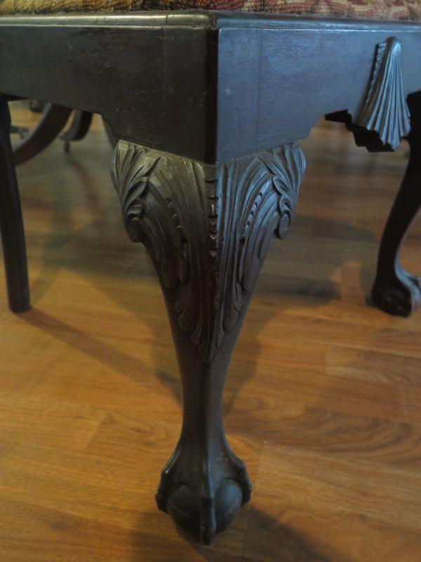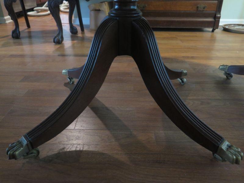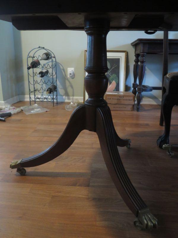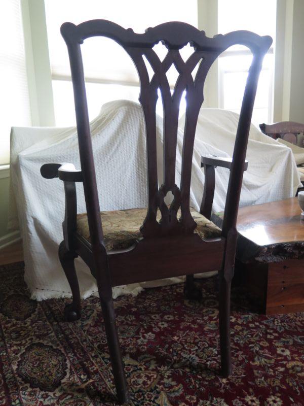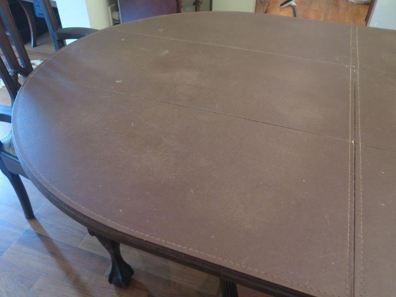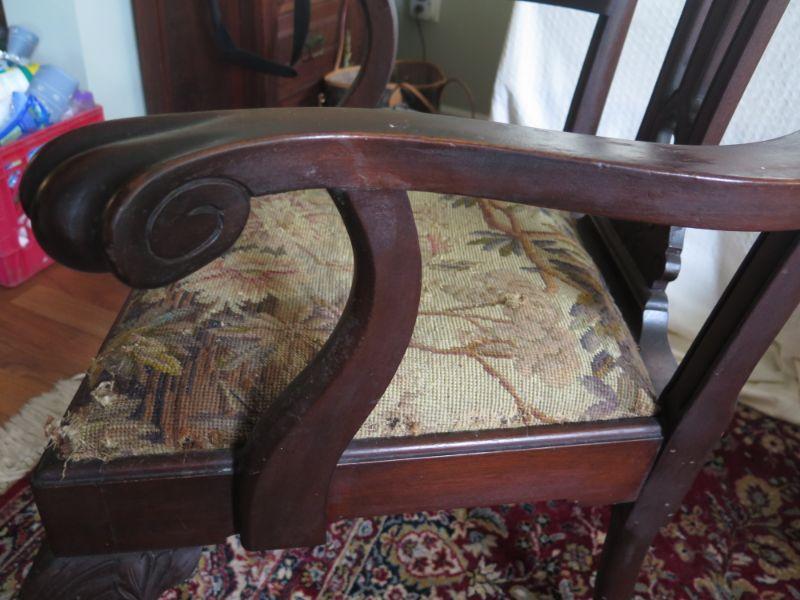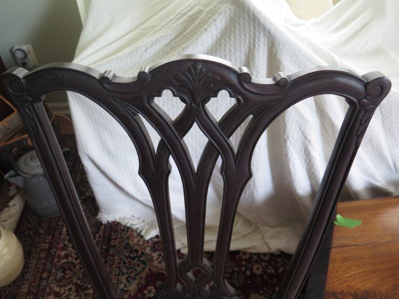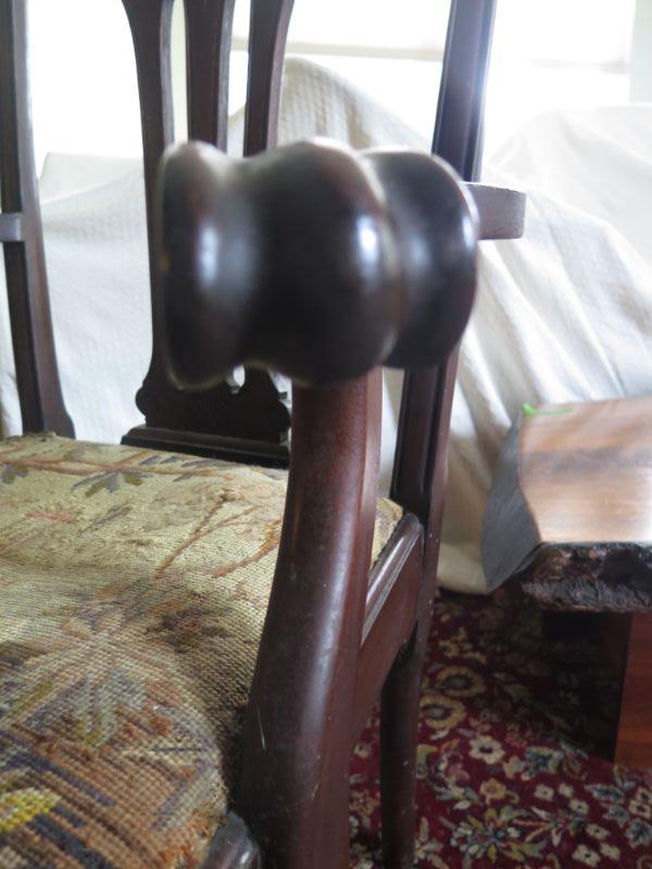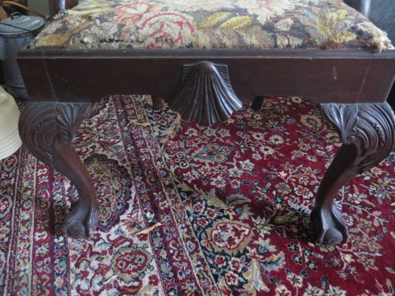 Antique oval mahogany dining table with 6 Chippendale chairs with ball and claw feet. Chairs have tapestry seats and there are two armchairs and 4 regular chairs. Table has 2 leaves. Comes with table pad and table cloth. **Please read Terms and Conditions before placing a bid. Pick up is Sunday, September 1, 2019 from 10am to 4pm in Williamstown. All sales are final. All sales are as is, where is. Please review all photos. Any props included in photos are not included in listing. All measurements are approximate. Comes from a home with cats.