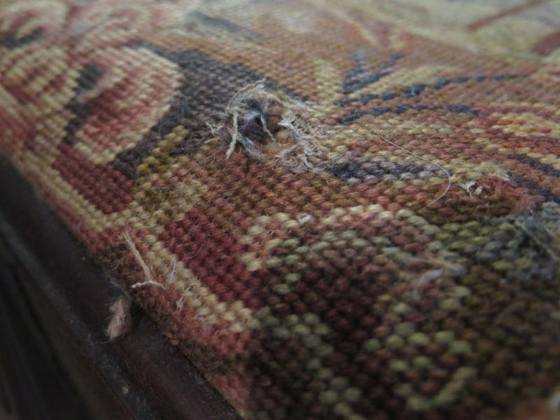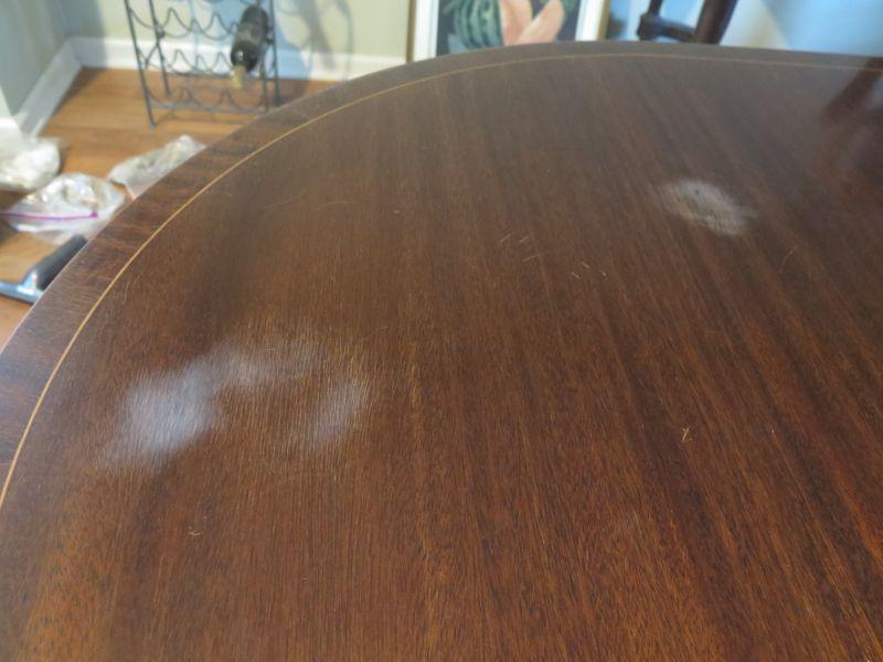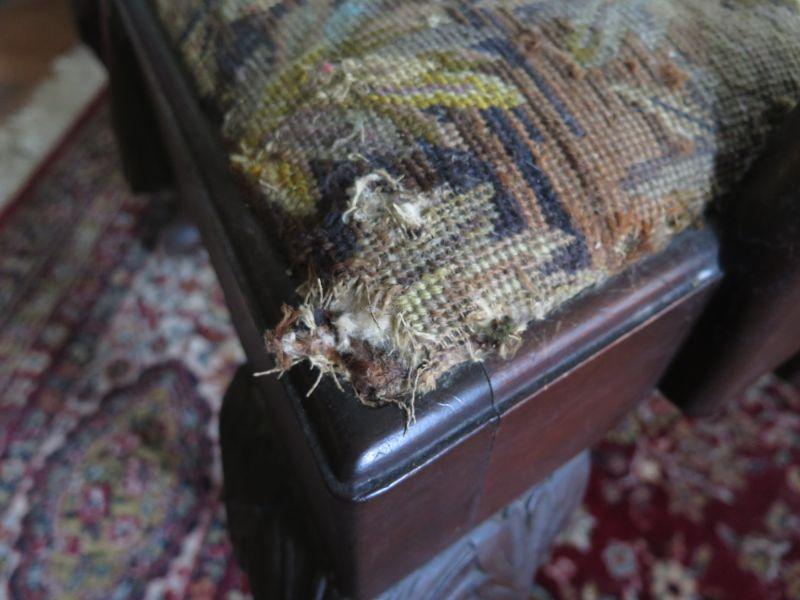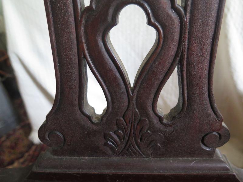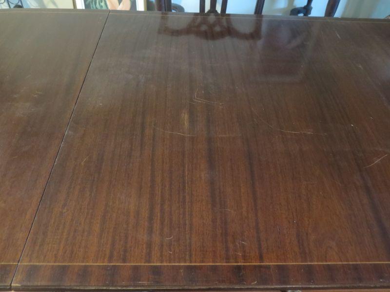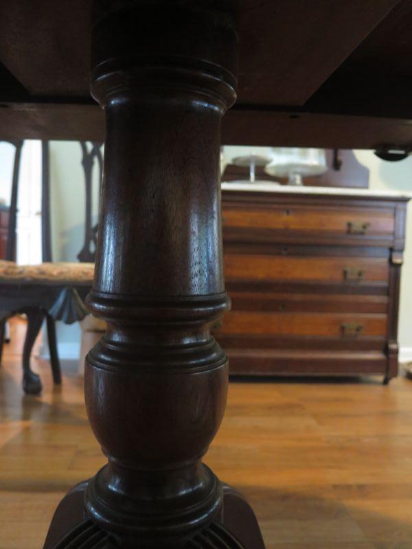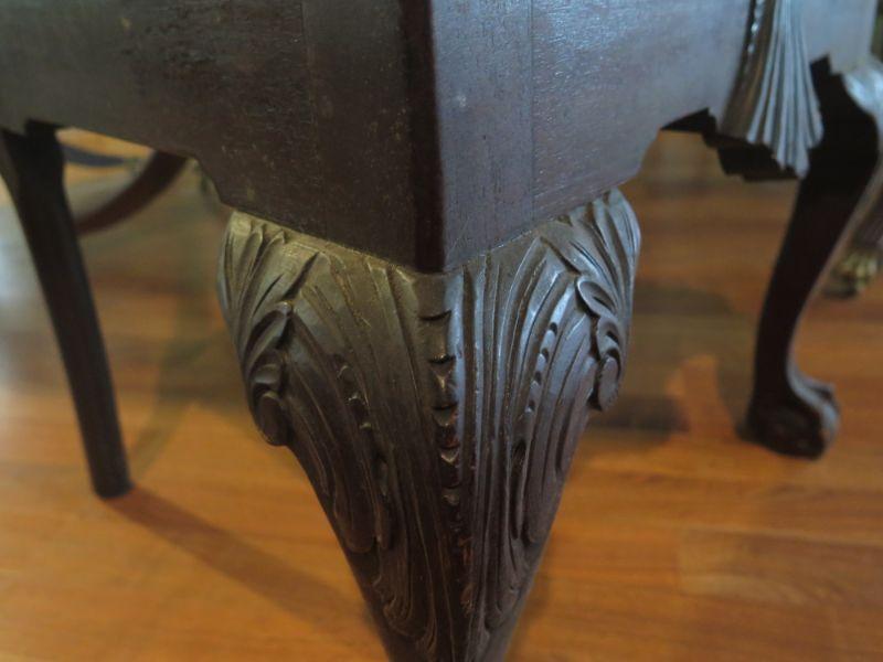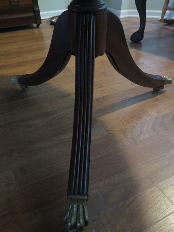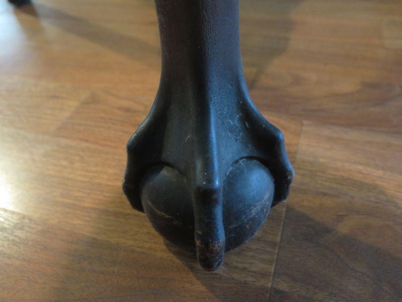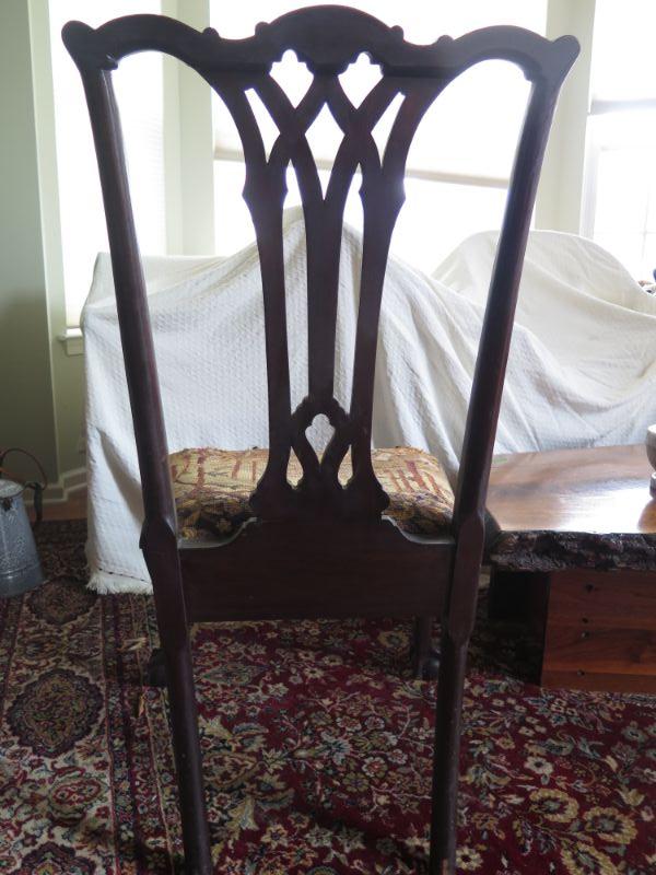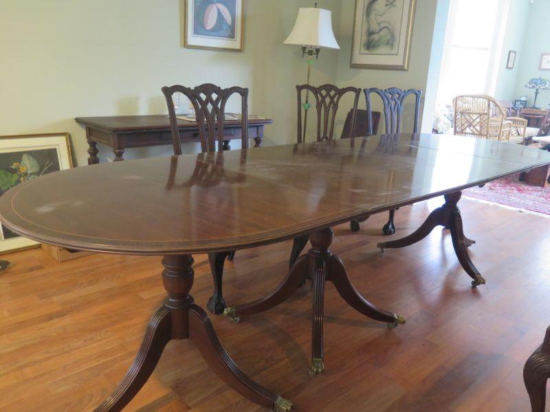 Antique oval mahogany dining table with 6 Chippendale chairs with ball and claw feet. Chairs have tapestry seats and there are two armchairs and 4 regular chairs. Table has 2 leaves. Comes with table pad and table cloth. **Please read Terms and Conditions before placing a bid. Pick up is Sunday, September 1, 2019 from 10am to 4pm in Williamstown. All sales are final. All sales are as is, where is. Please review all photos. Any props included in photos are not included in listing. All measurements are approximate. Comes from a home with cats.