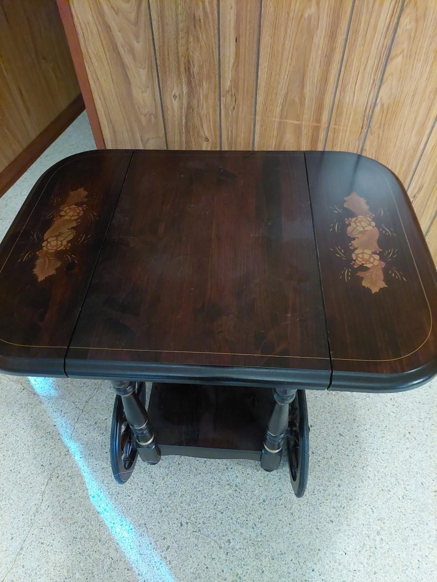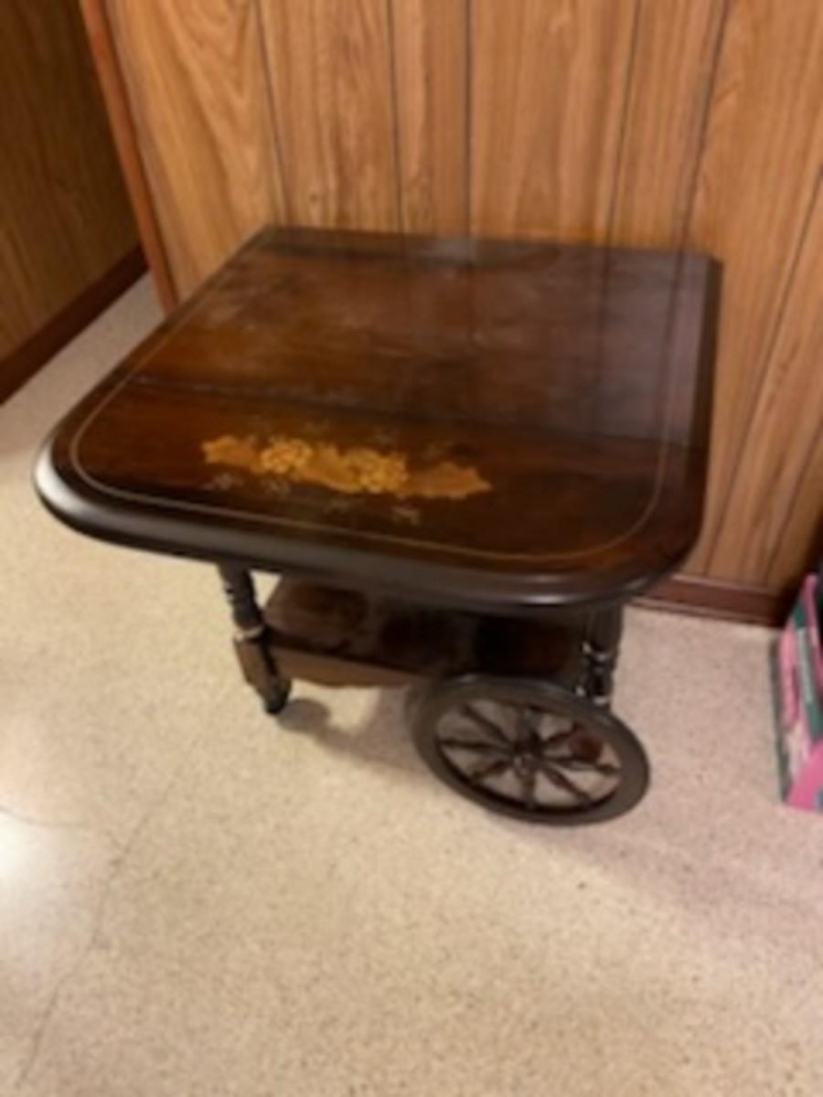 A very unique painted rolling cart. Would make a great bar cart. Dimensions are 29" tall 34" wide ( open) &27" deep