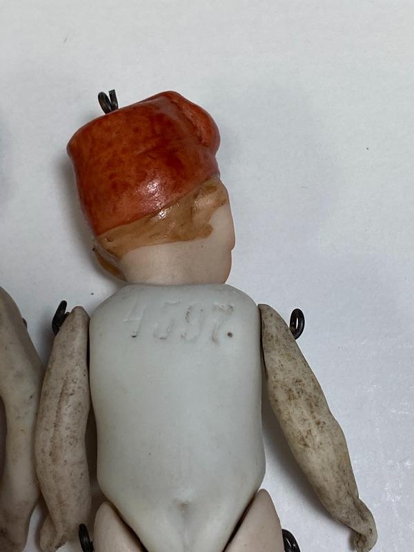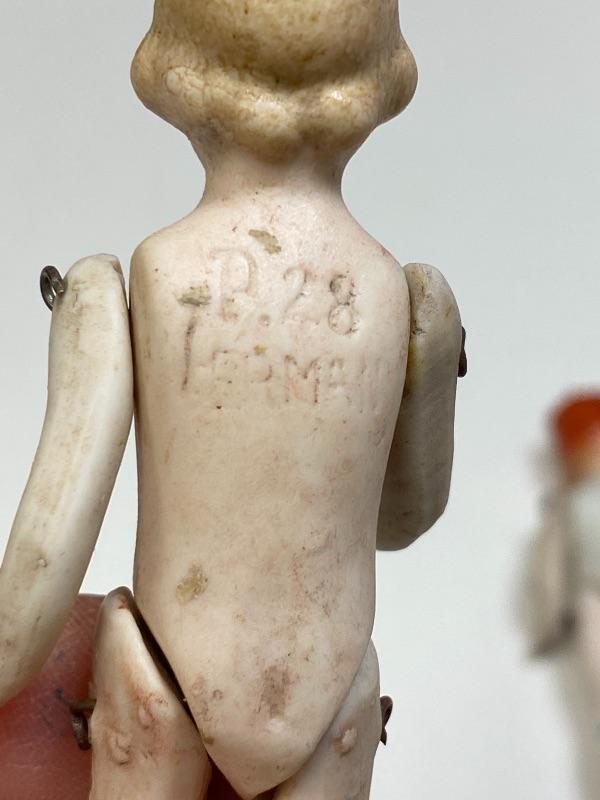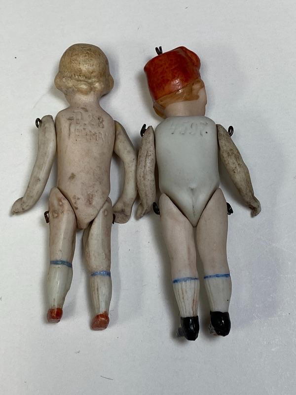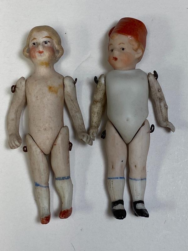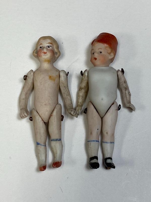 Antique pair of jointed bisque dolls. Dollhouse miniature size at about 3". No clothes, painted socks and shoes. Marked on the backs. The blonde girl is marked p.28 Germany, the boy is marked 4597. Antique conditions, no broken parts.