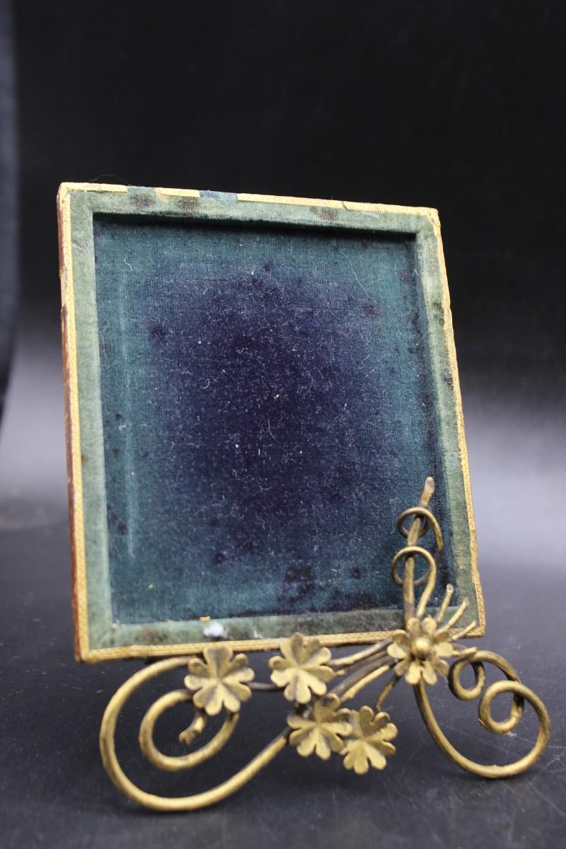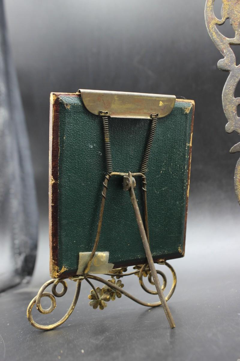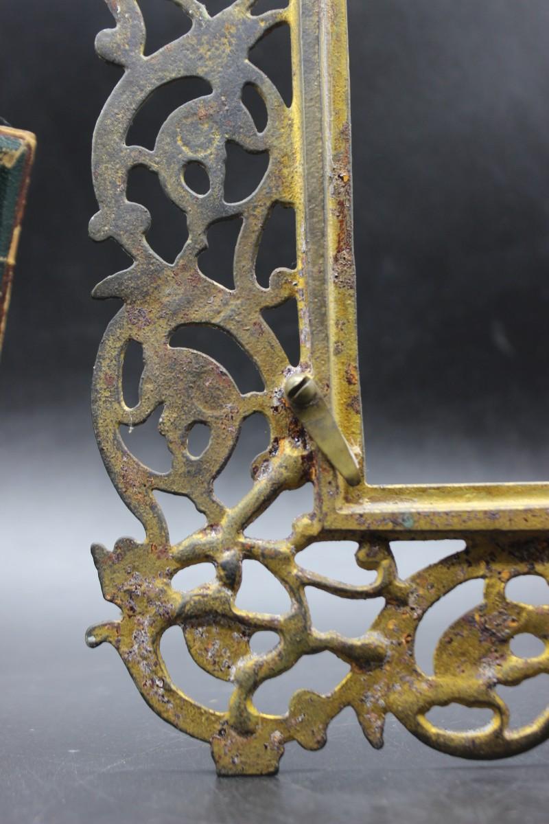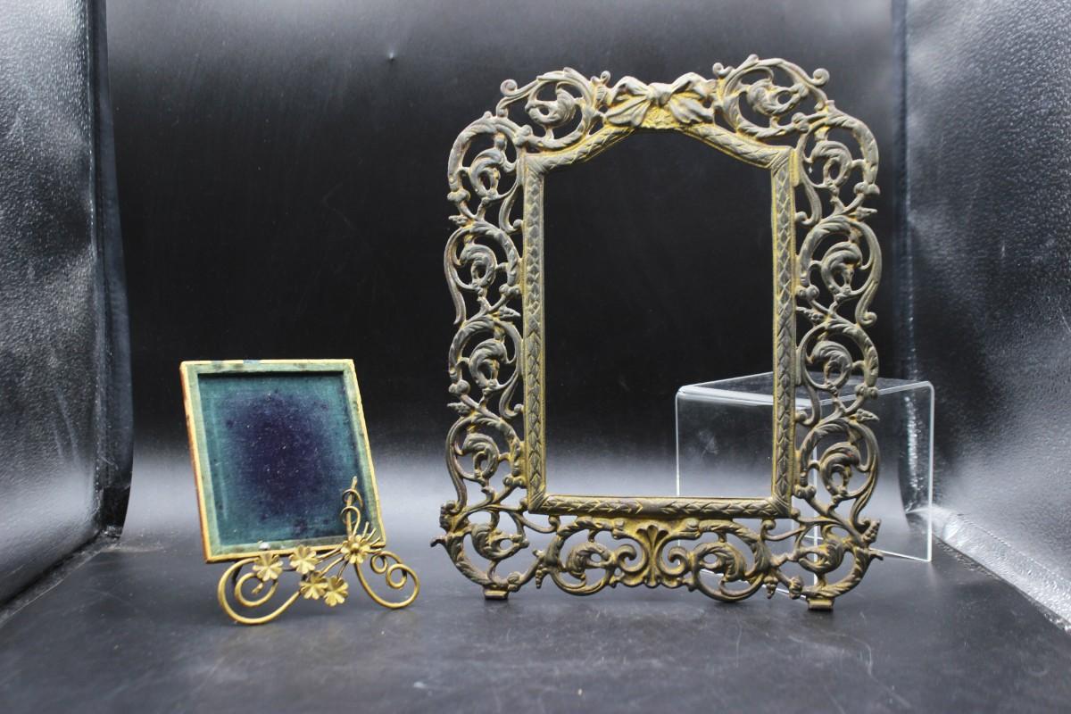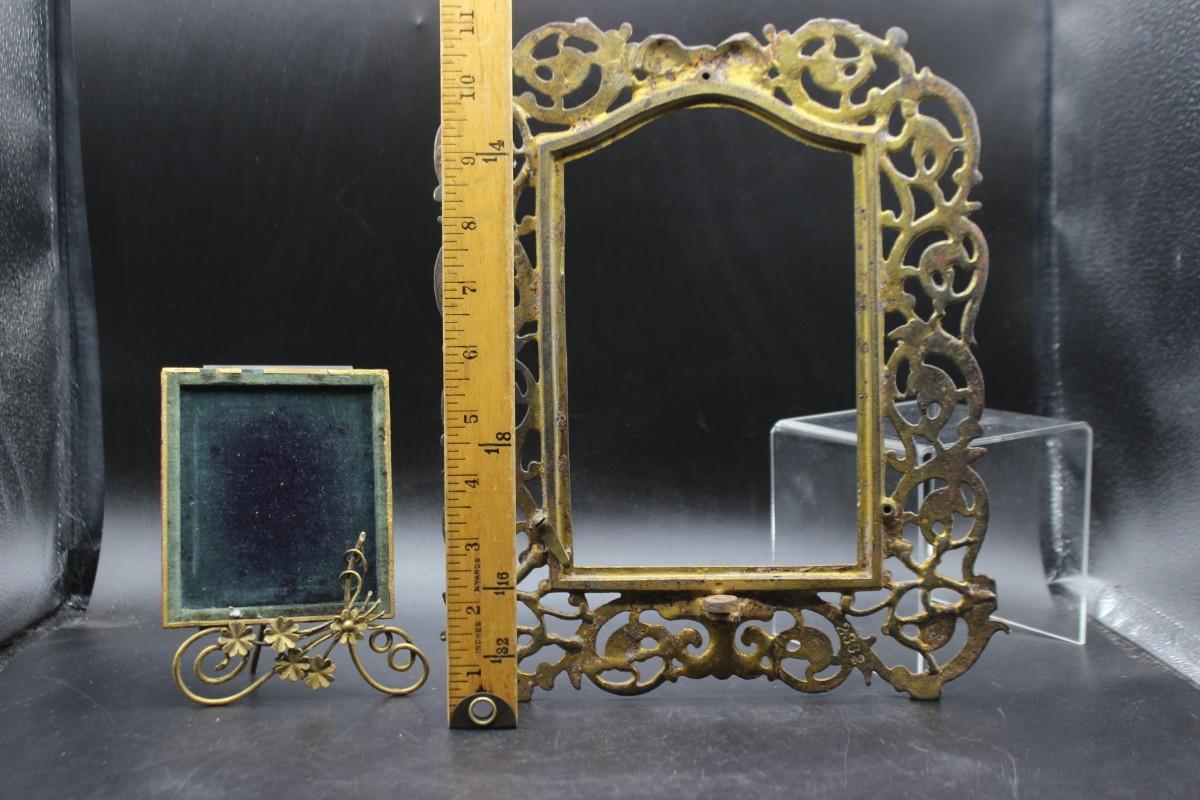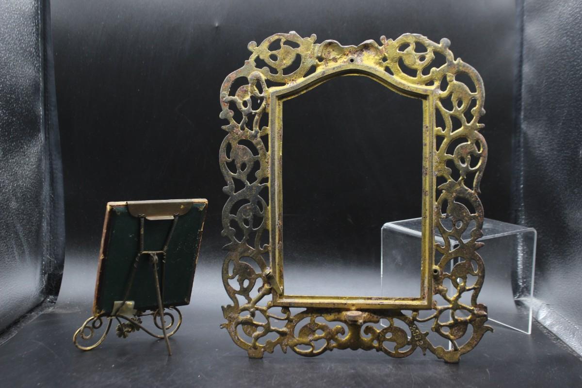 Antique Pair of Art Nouveau Metal Picture Desk Frames, the stand for the larger metal frame is broken and cannot stand on its own, and there is also some natural wear to both of the frames. There is no other significant damage and is in overall fair condition, check pictures for more details and for sizing.