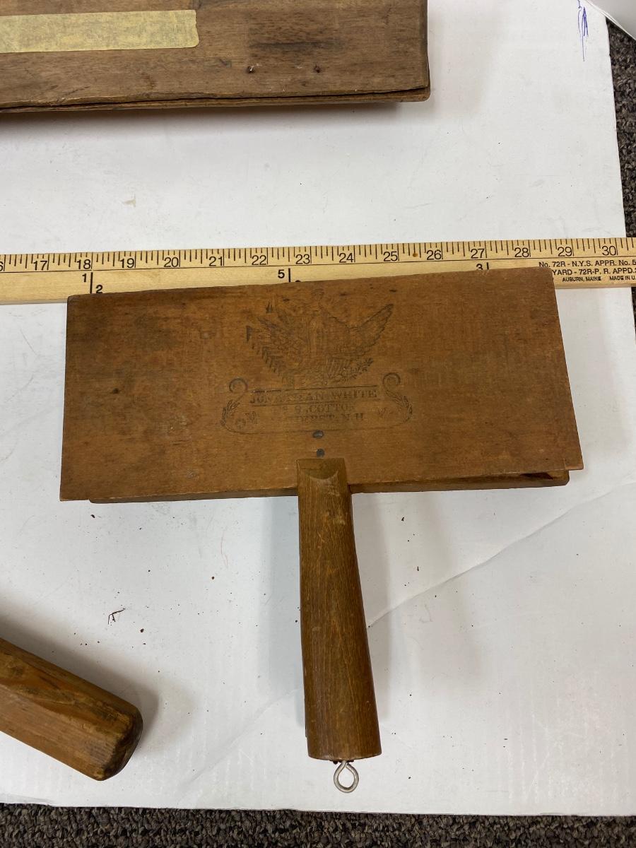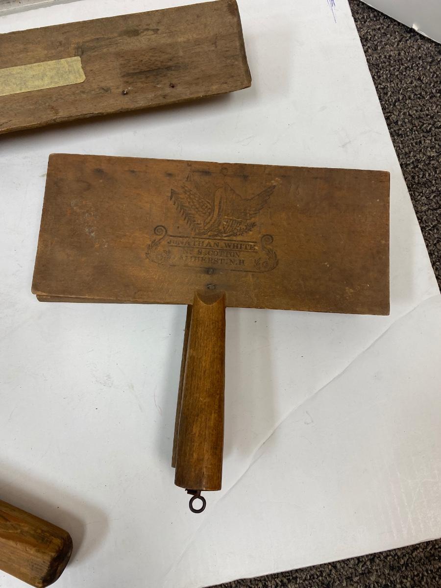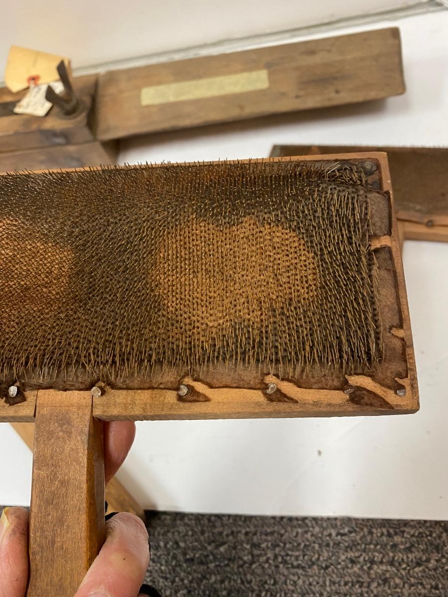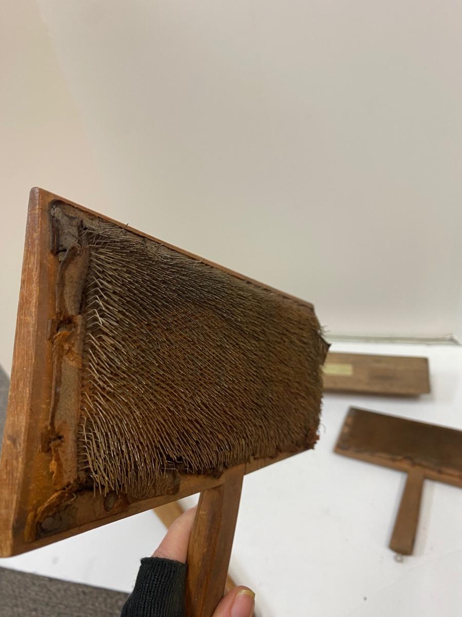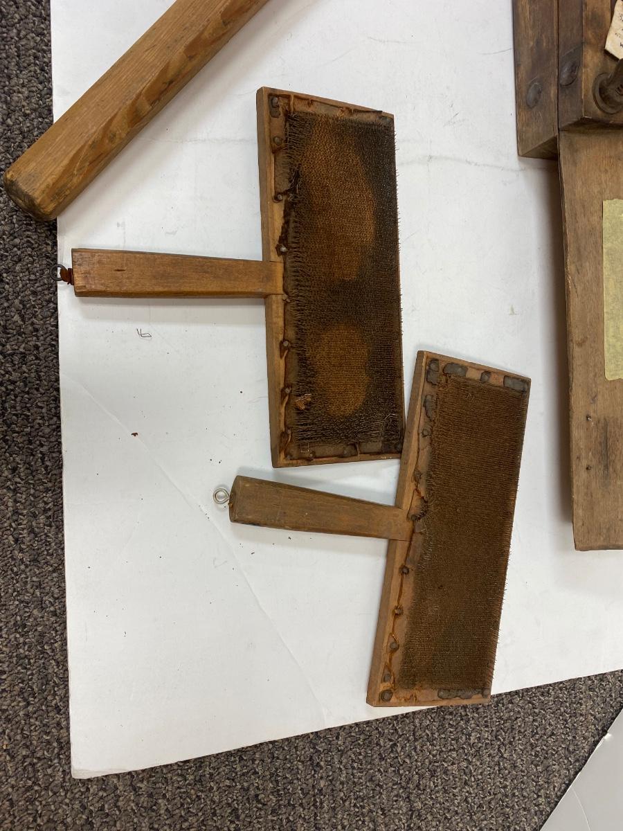 Antique Pair of Carders, Saw Sharpening Vise, Taper Handle Scraper Tool. All in antique condition. The leather backing on the carders is falling apart with age. All display great. Saw vise held a saw blade in place while being sharpened with file.