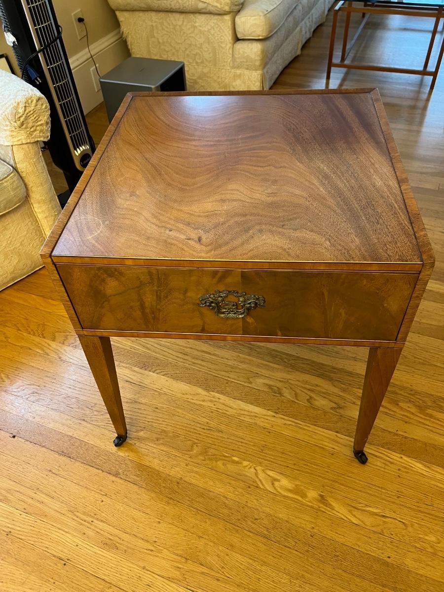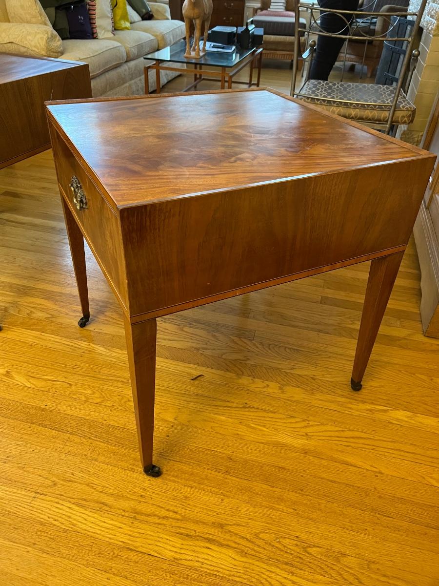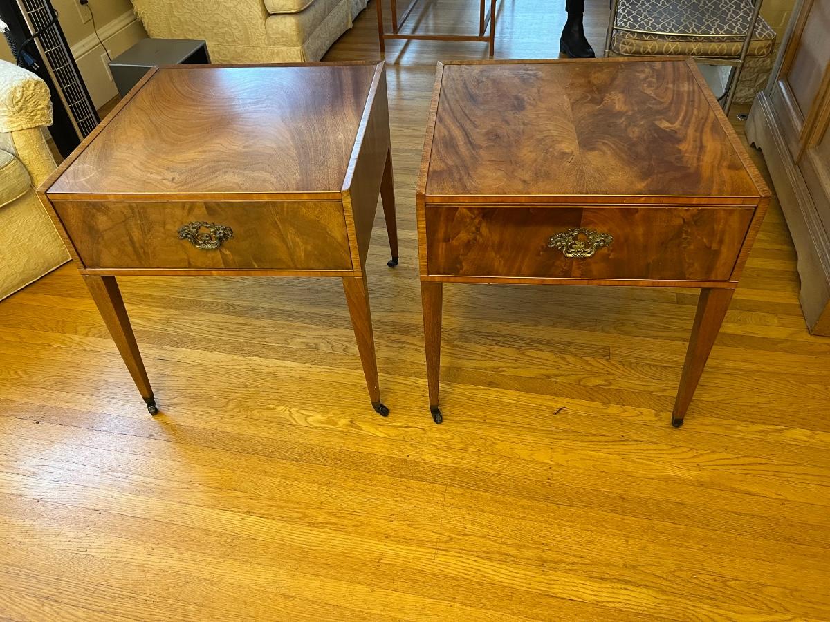 Antique pair of mahogany side tables with drawers, on wheels. 24” D x 24” W x 26” T