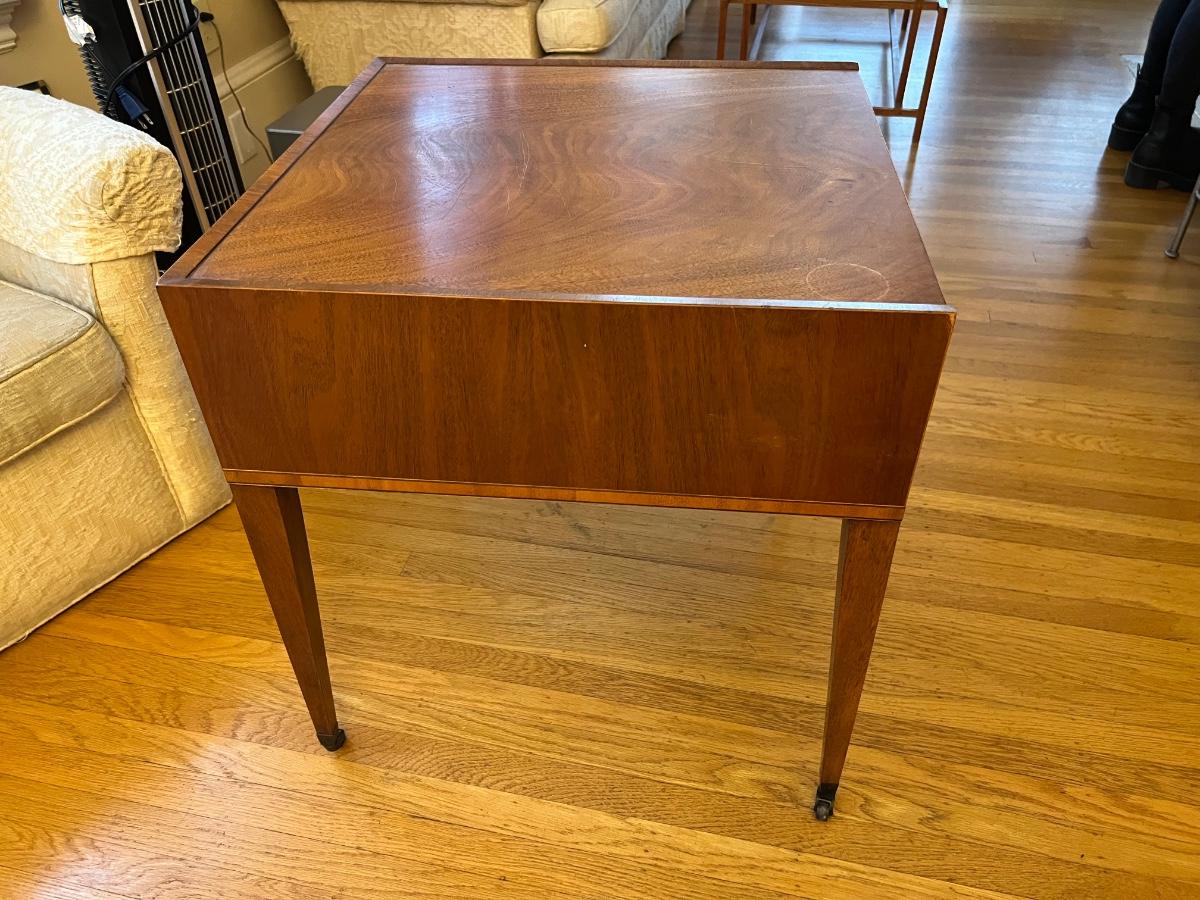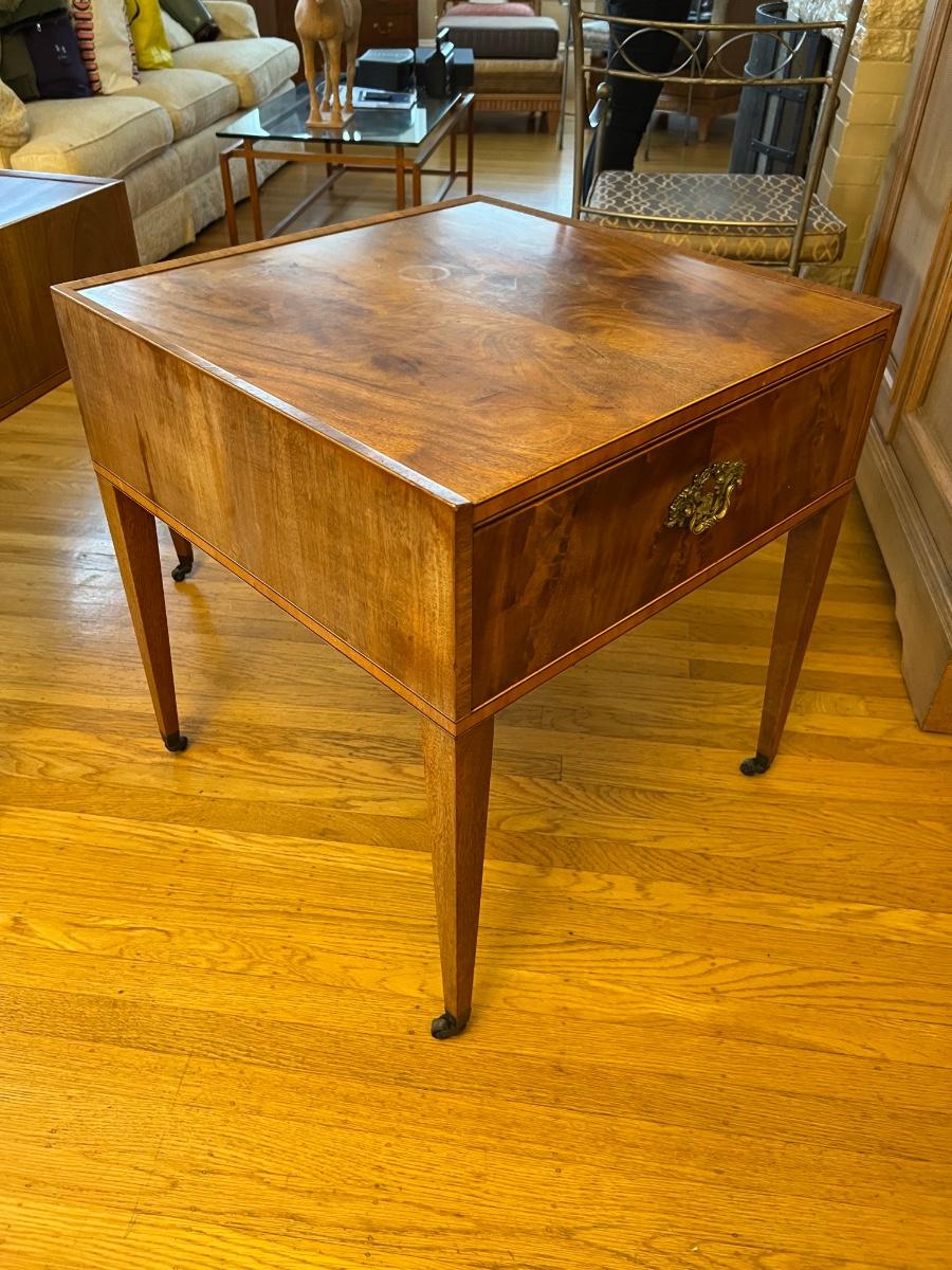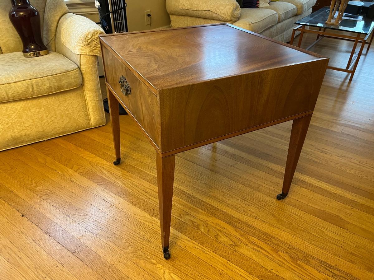 Antique pair of mahogany side tables with drawers, on wheels. 24” D x 24” W x 26” T