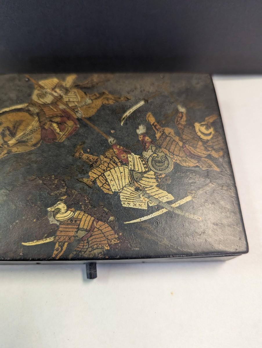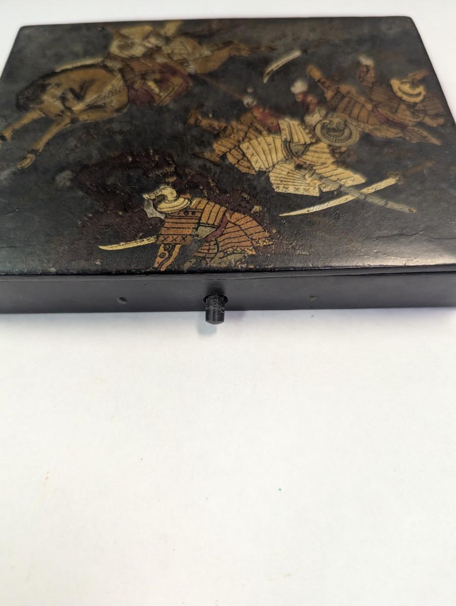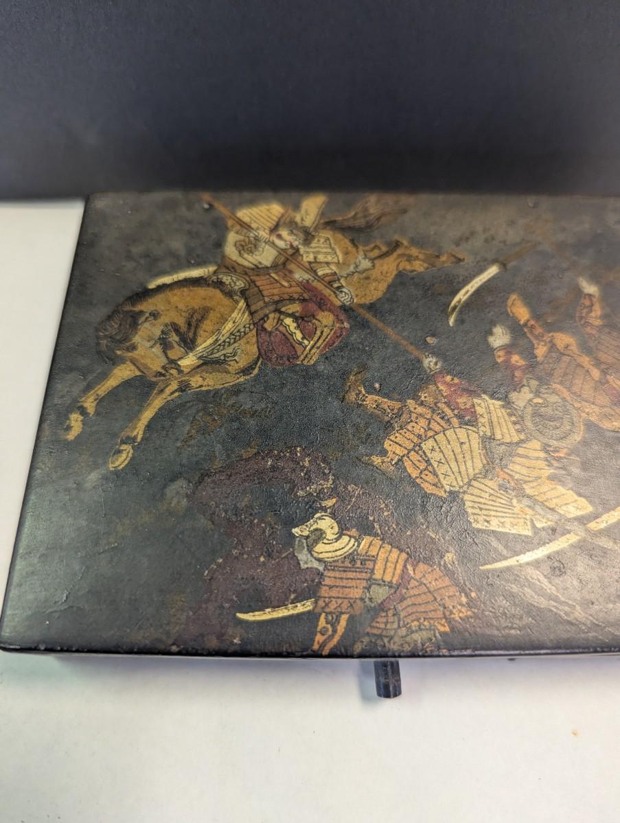 Antique Paper Mache Chinese Sectioned Sewing Jewelry Storage Battle Scene Box