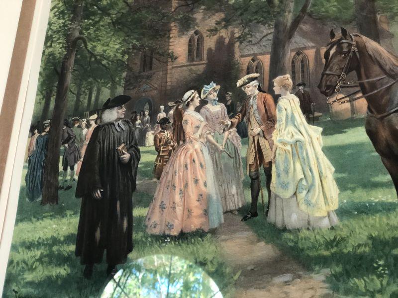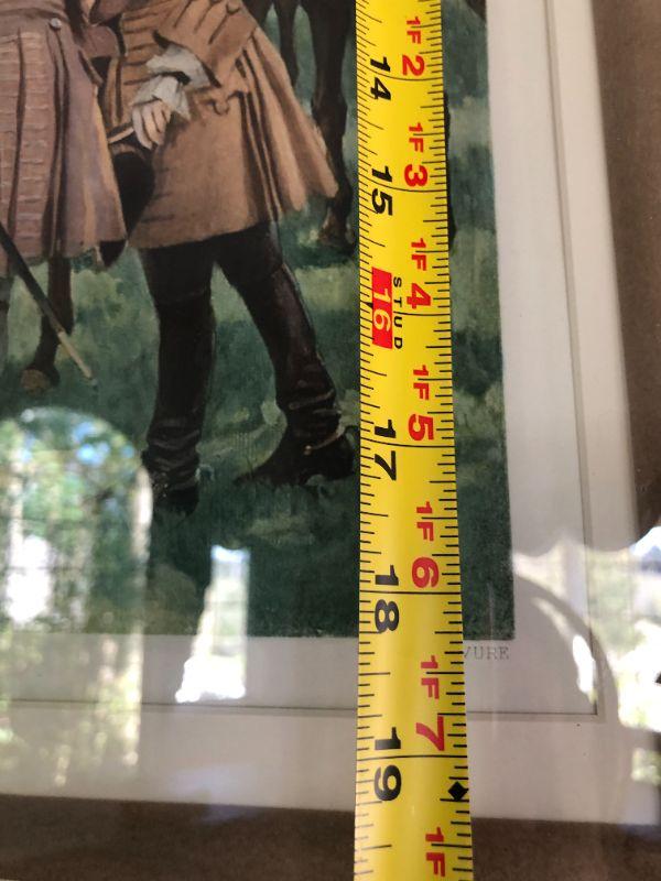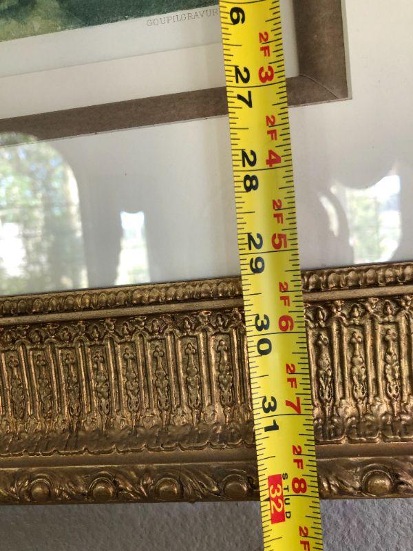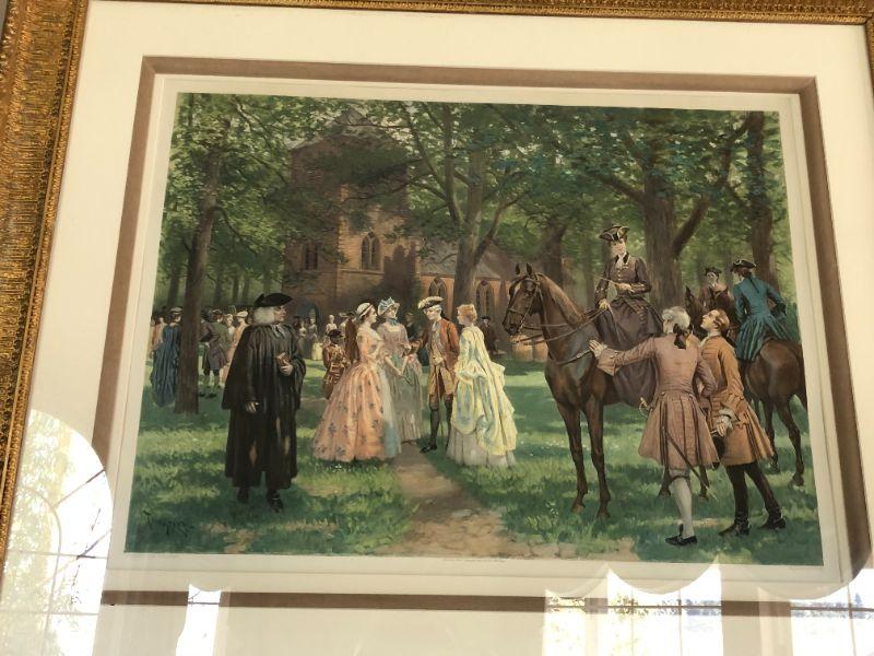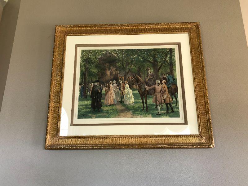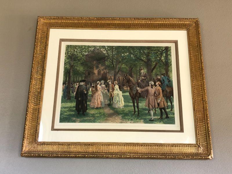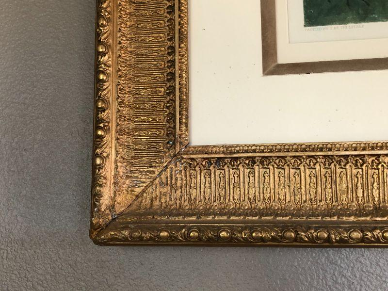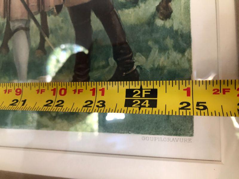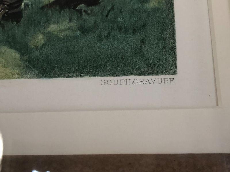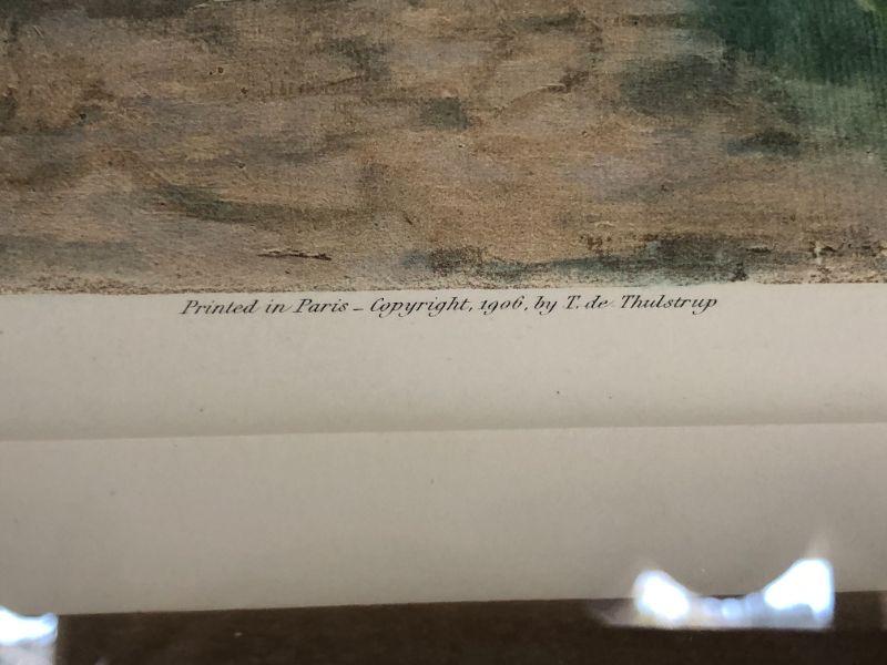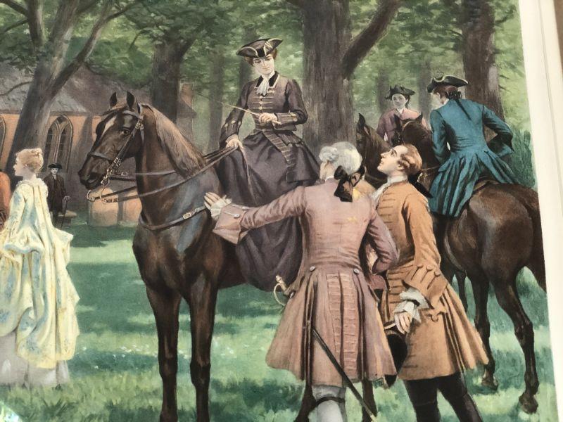 Fabulous antique print of a social horseback scene; with a group of ladies talking, and two gentlemen speaking to a woman on horseback. Says 1906 copyright by Thulstrup, made in Paris, Goupilgravure. In very good condition- one corner of the frame is a bit damaged, as shown in photo.