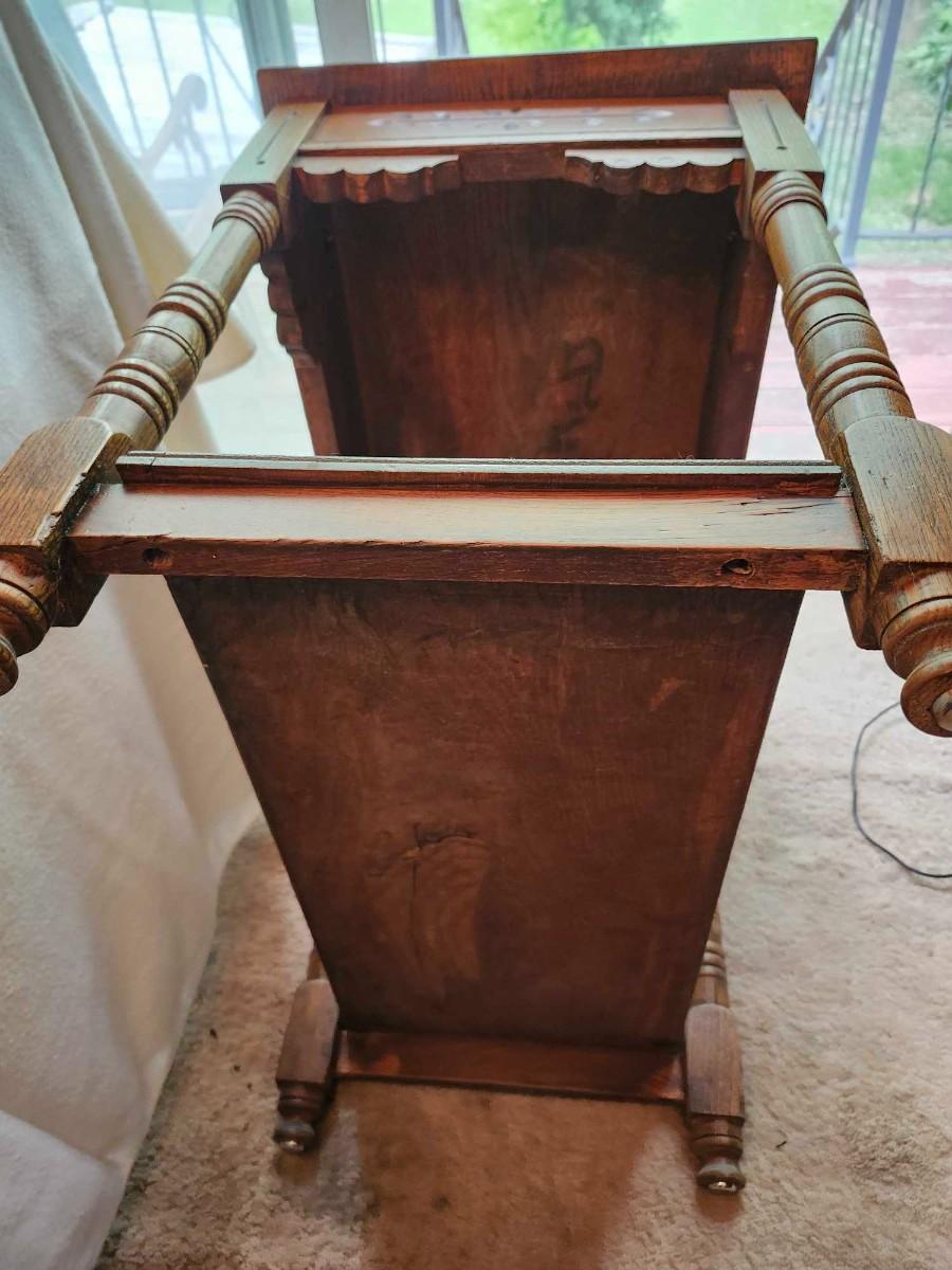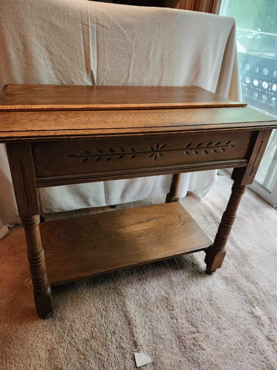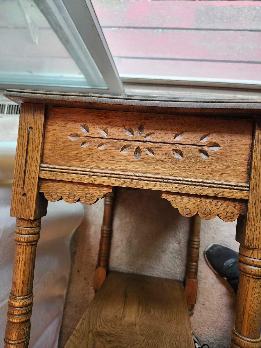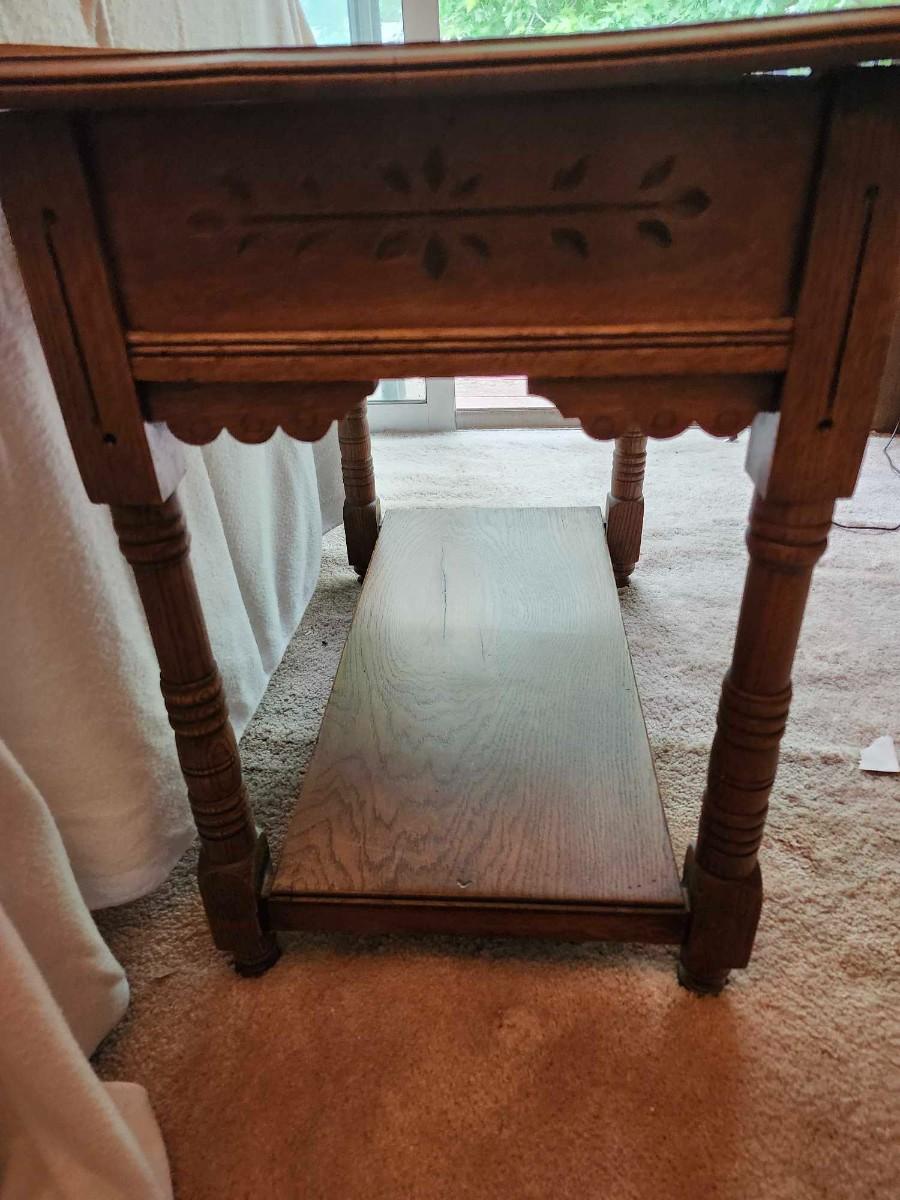 Antique Parlor Table Carved Sides Turned Legs Bottom Shelf Oak Wood Solid Side Table Living