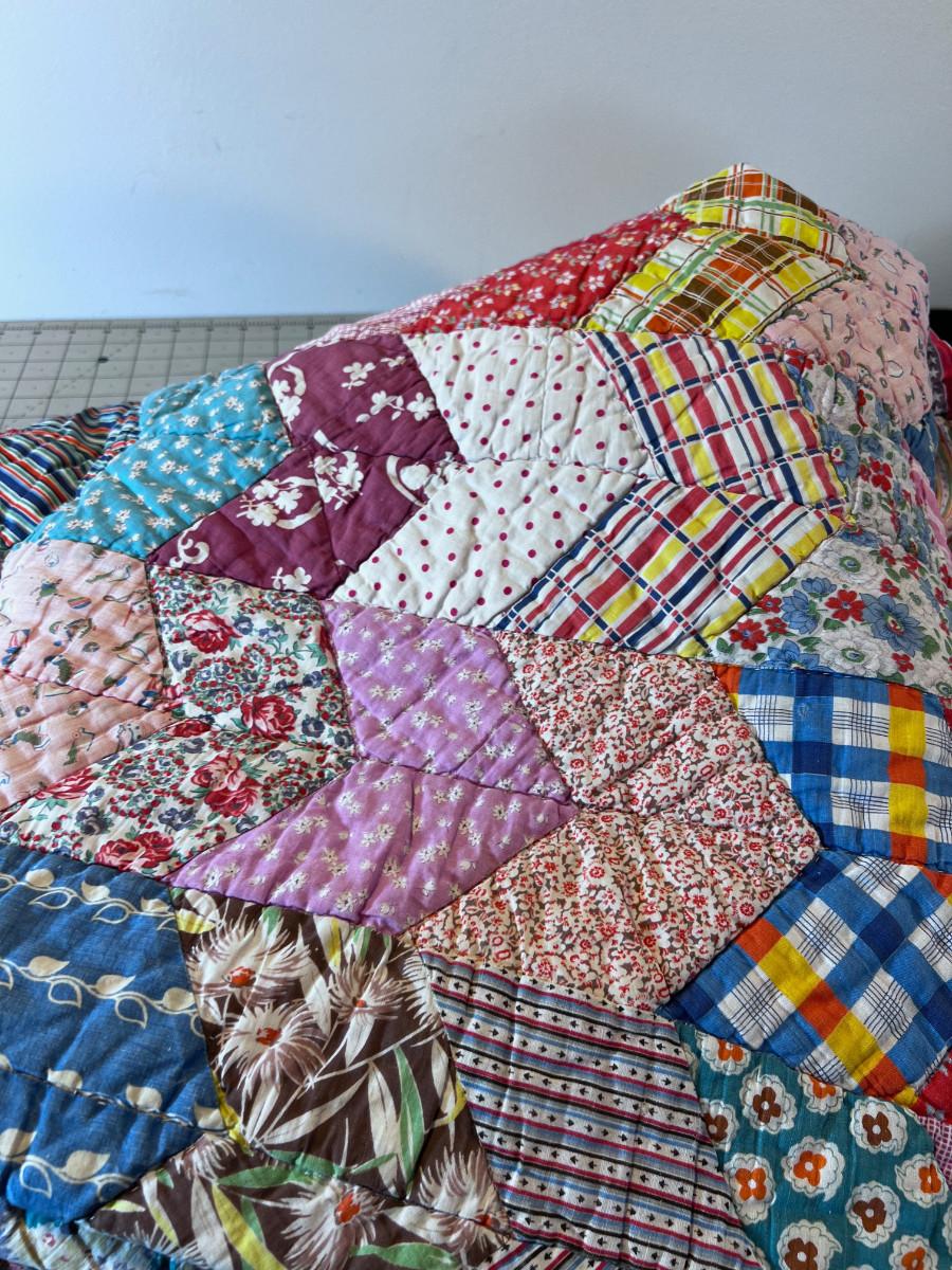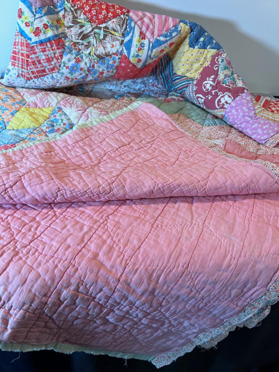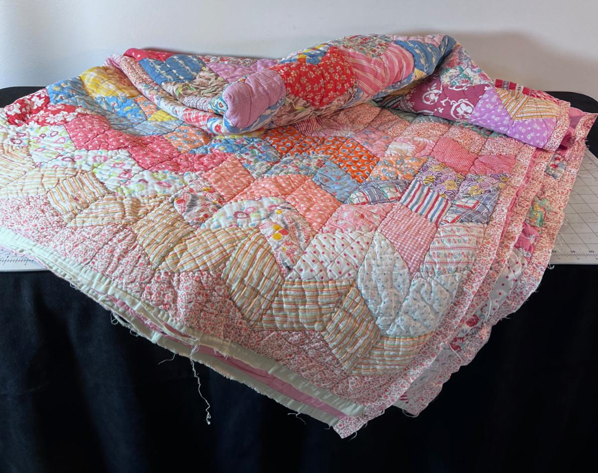 SHOWS AGE and WEAR! But still very cute. 66 x 78" Needs a new repaired edge to be sew onto it.