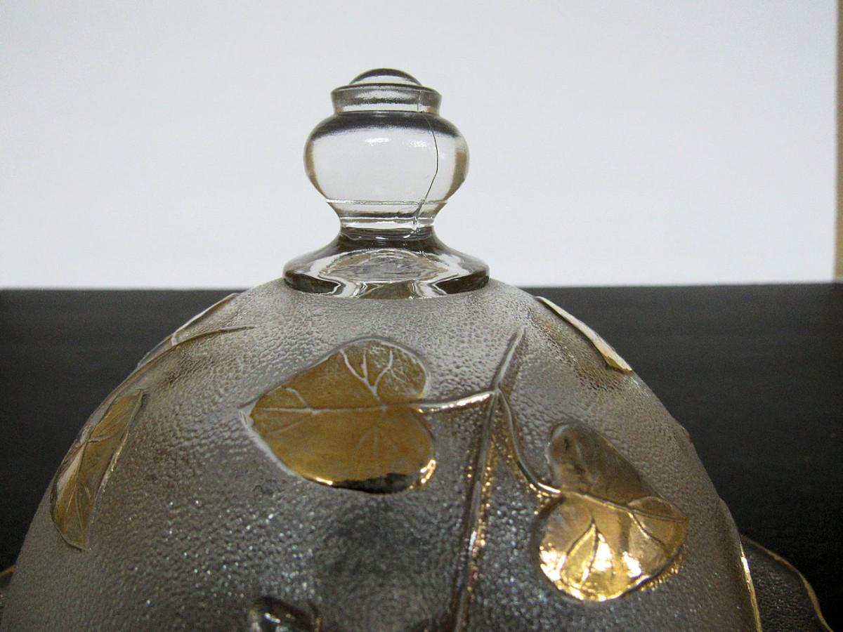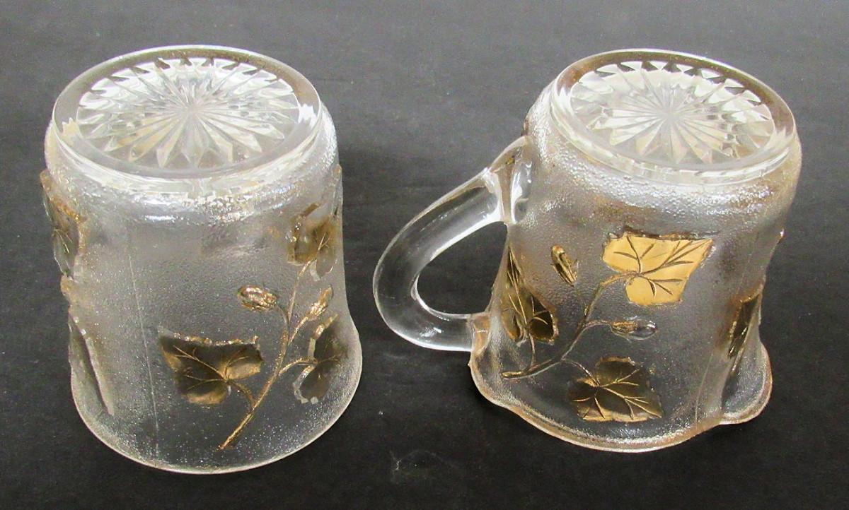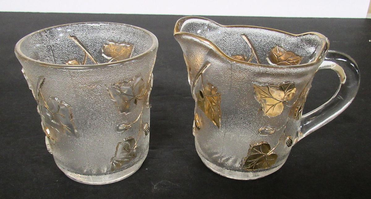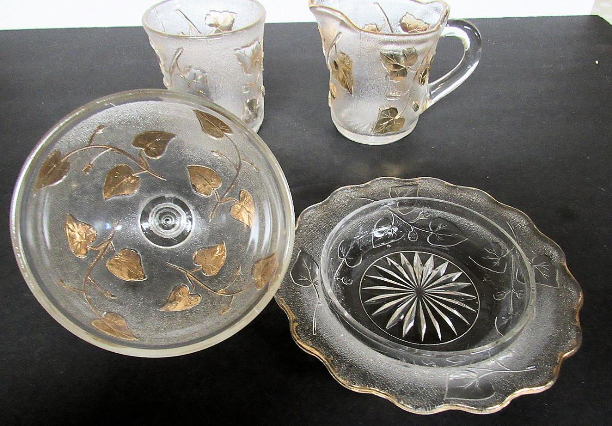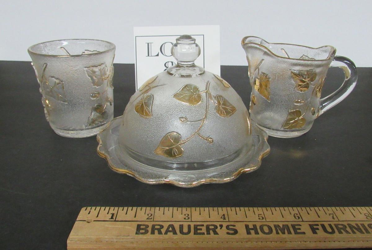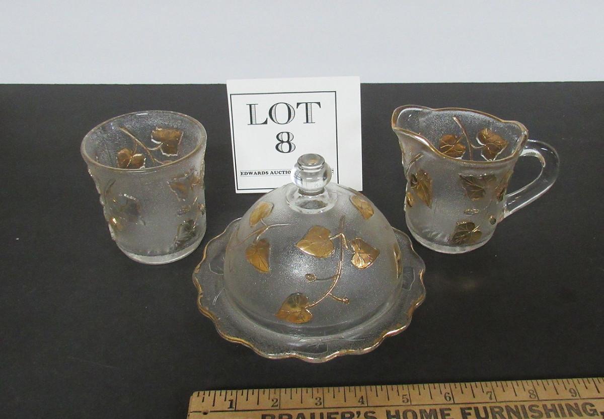 Antique Pattern Glass Ivy In Snow Butter Dish, Sugar and Creamer With Gold Trim