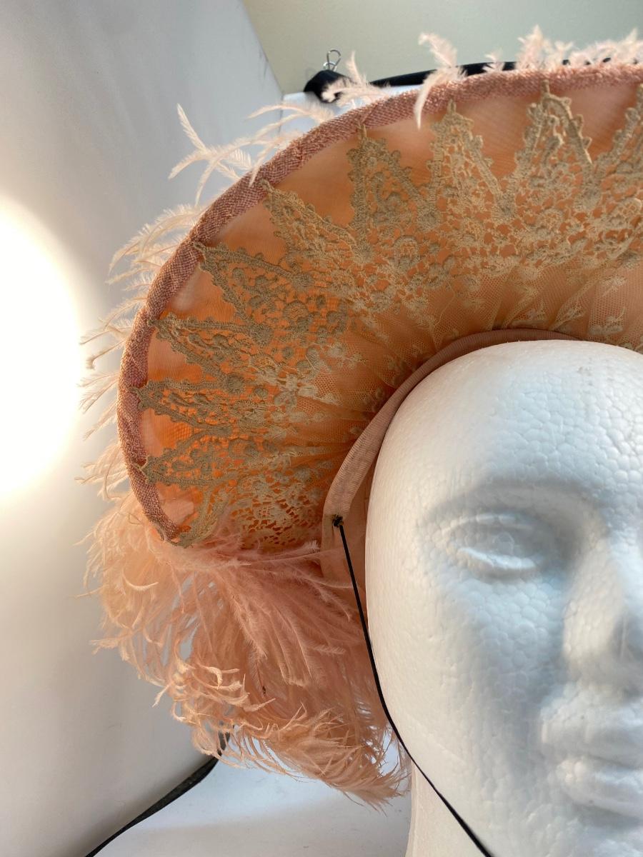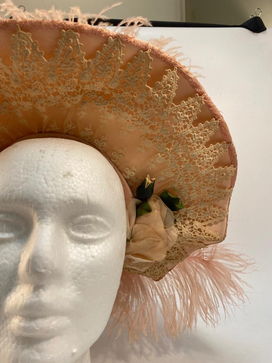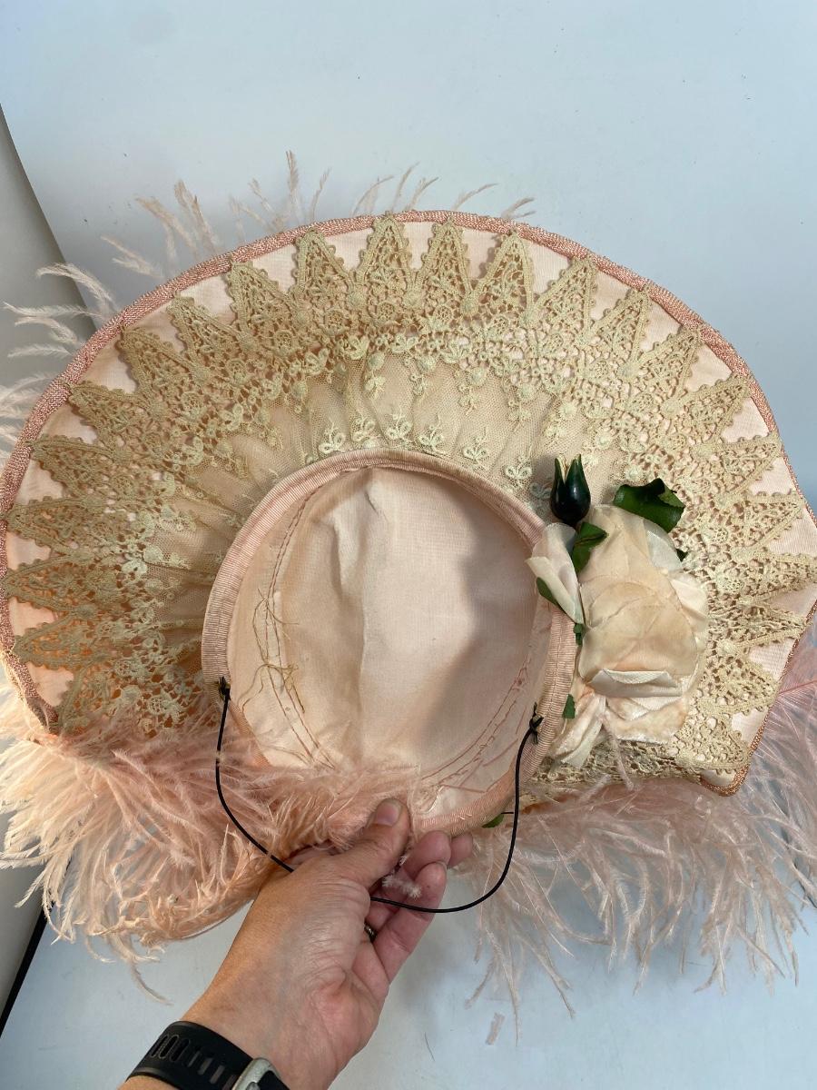 Antique Peachy Pink Ostrich Feather & Lace Victorian Sun Hat. Some discolor normal with age. Needs a little reshaping from being in storage. In overall good condition.