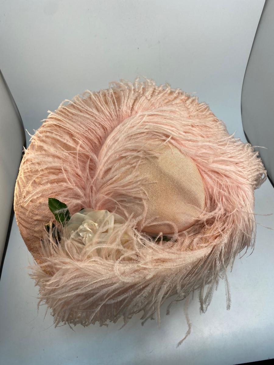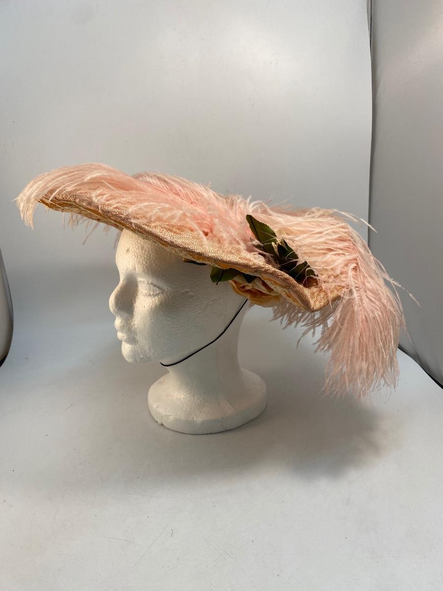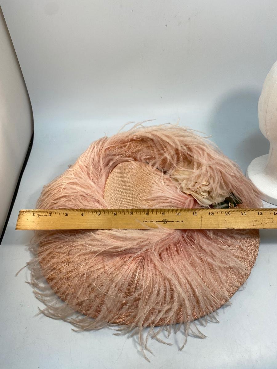 Antique Peachy Pink Ostrich Feather & Lace Victorian Sun Hat. Some discolor normal with age. Needs a little reshaping from being in storage. In overall good condition.