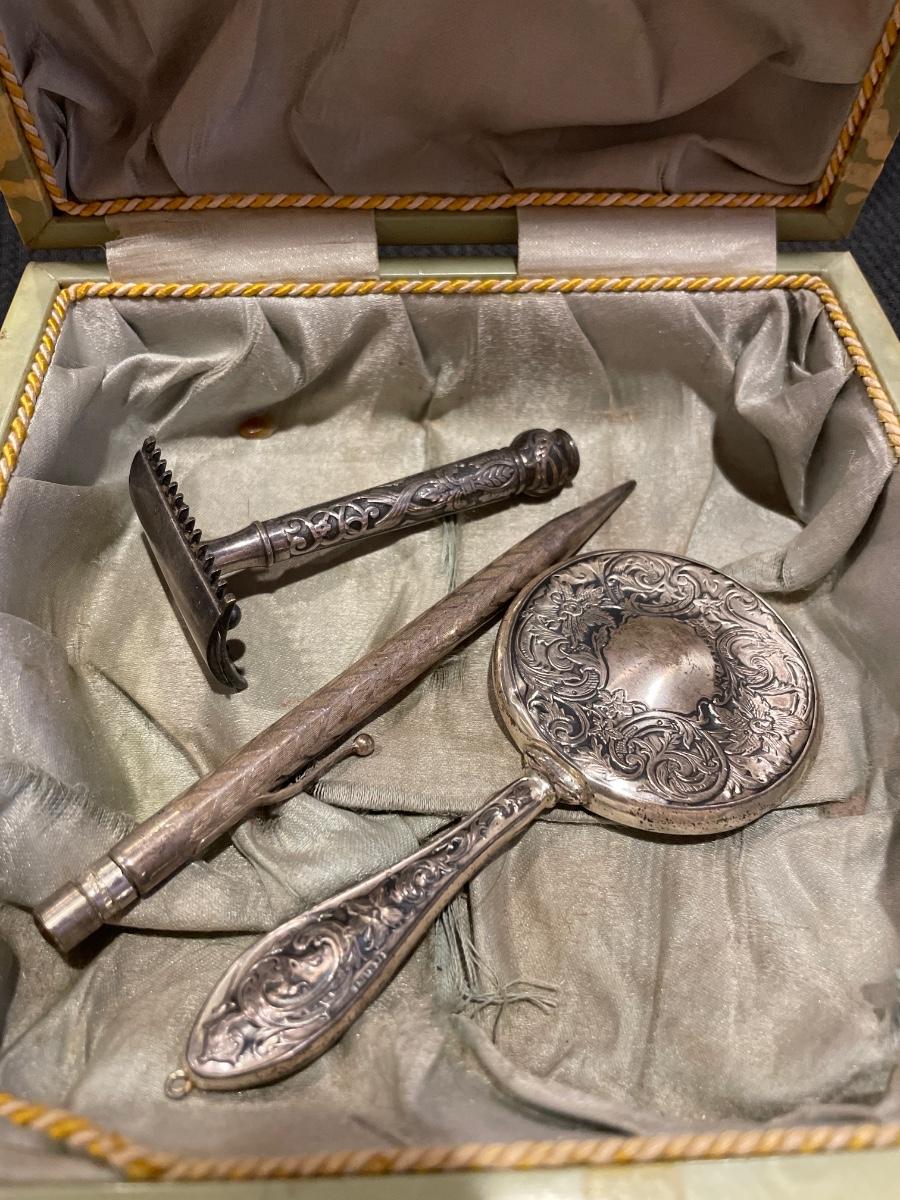 Antique pencil, mirror and razor