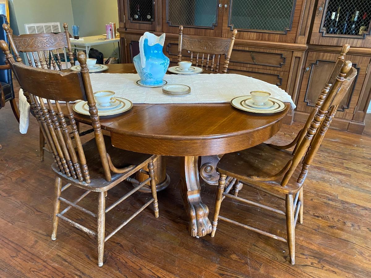 Antique Pennsylvania Dutch solid oak table and 4 chairs. Table has claw feet with a pedestal and is on rollers. Four antique pressback chairs. There is a chip on one of the claw feet and some wear on table and chairs. Otherwise in good antique condition
