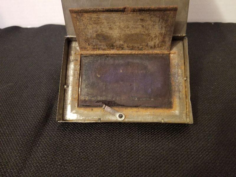 Measures about 4.75" x 2.25 x 3.25" says PERFECT on the lid. I'm sure its probably missing some numbers and or letters. The other metal pieces are blanks.