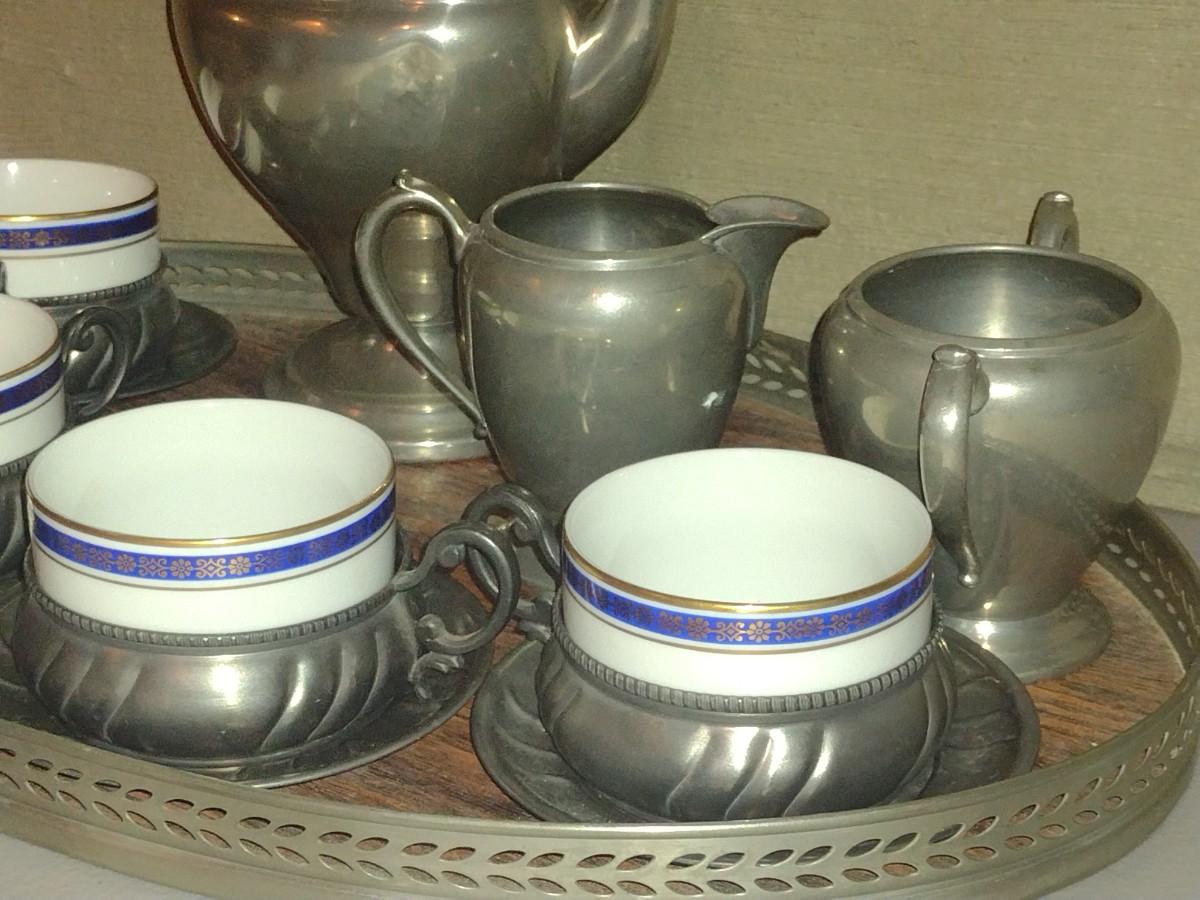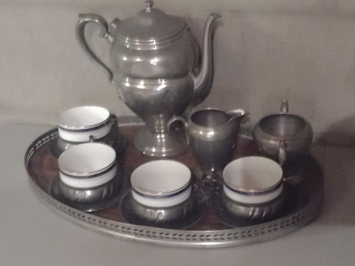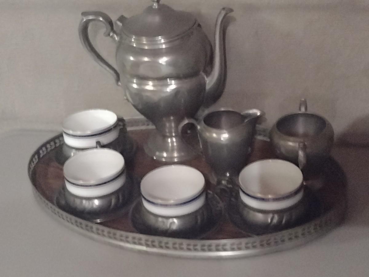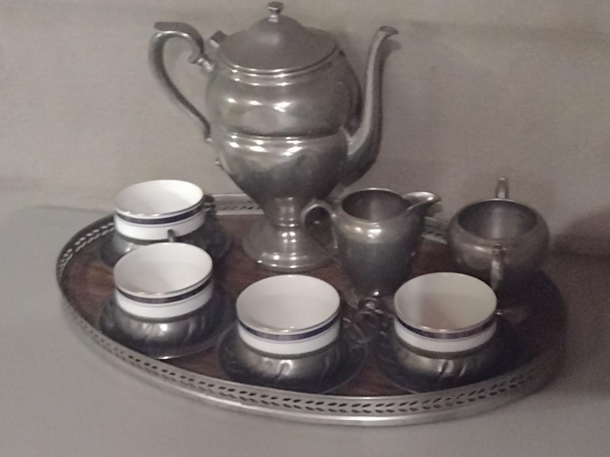 Antique Pewter Coffee, Creamer, and Cup Set with Faux Wood Tray