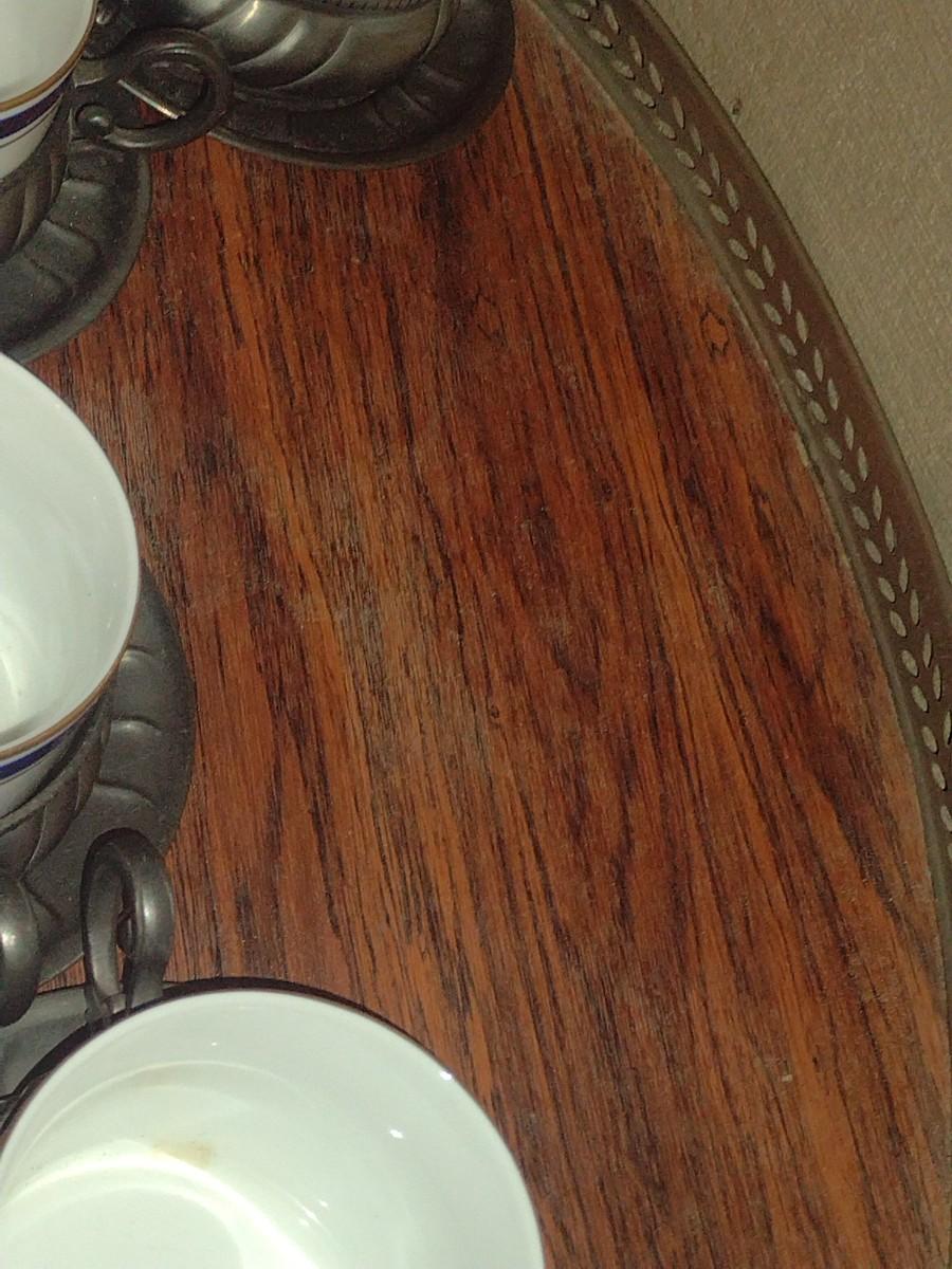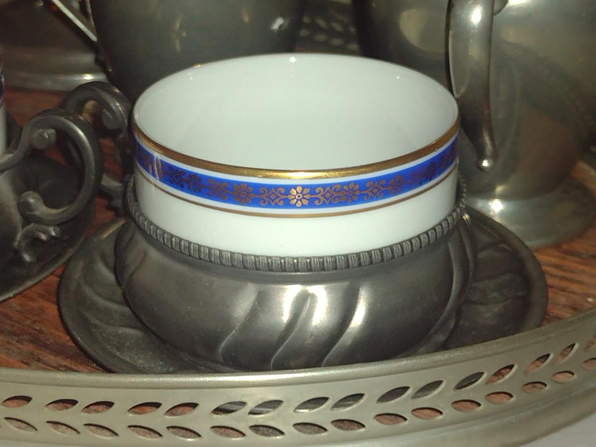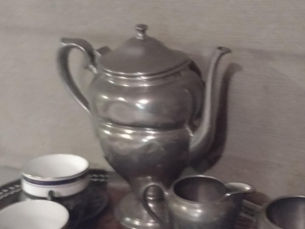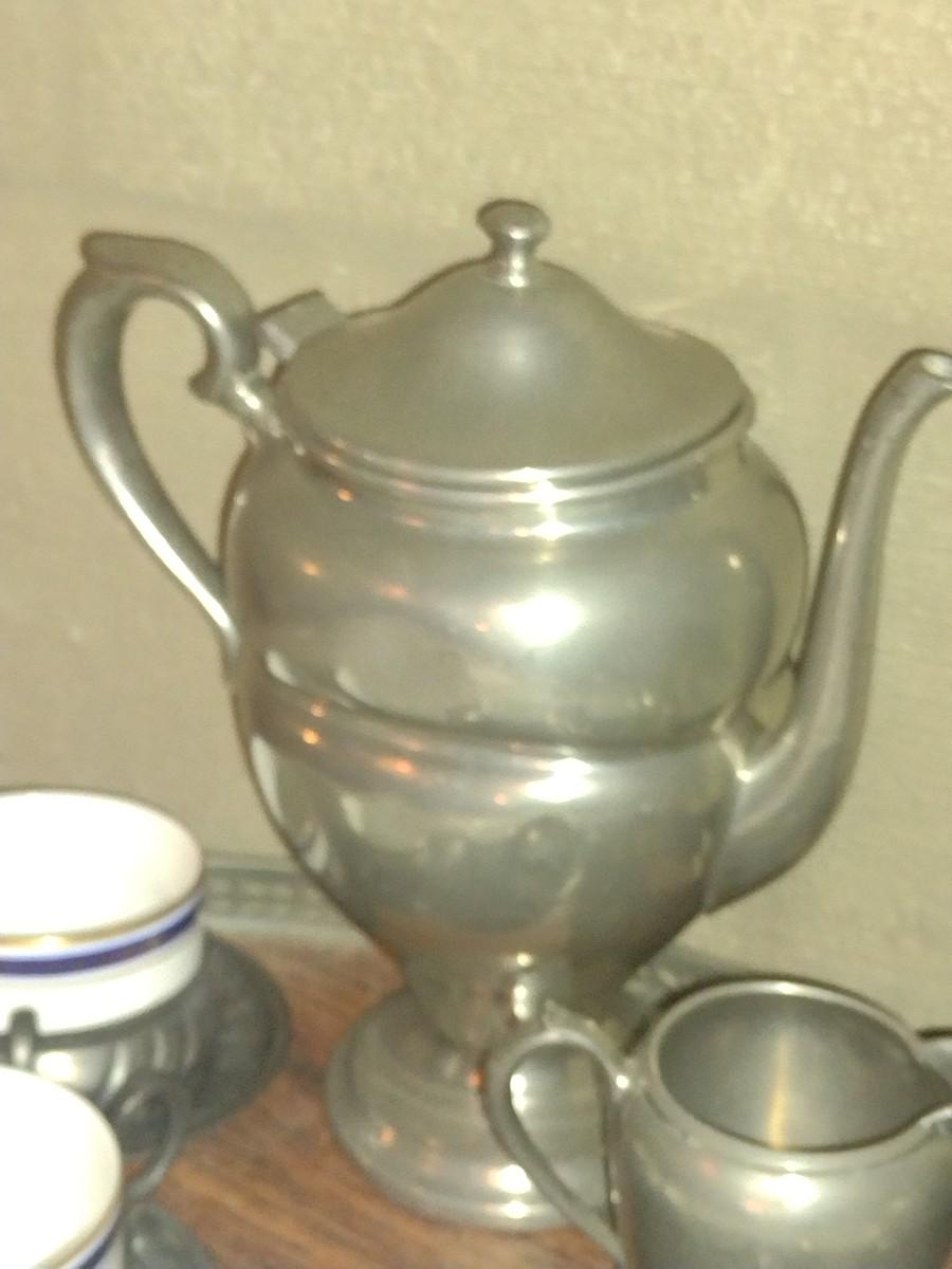 Antique Pewter Coffee, Creamer, and Cup Set with Faux Wood Tray