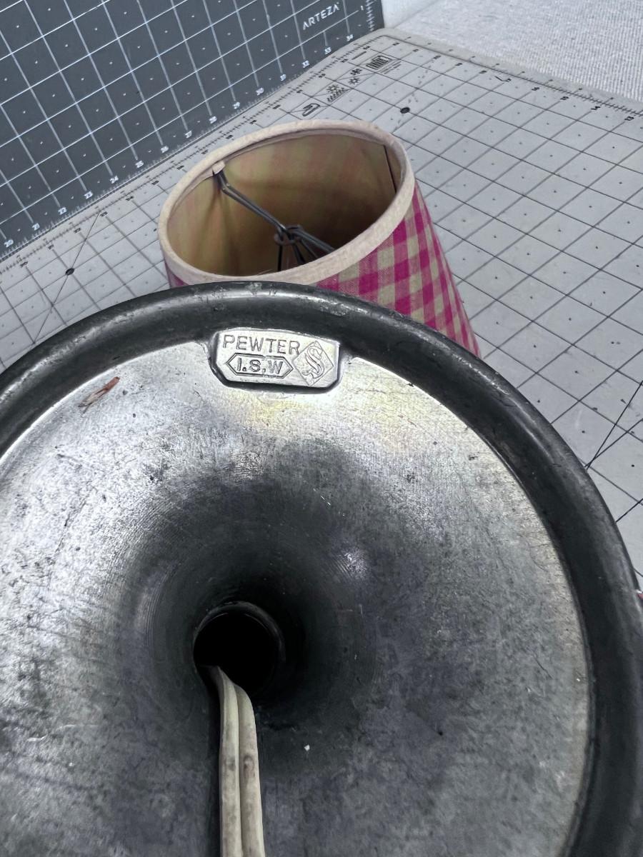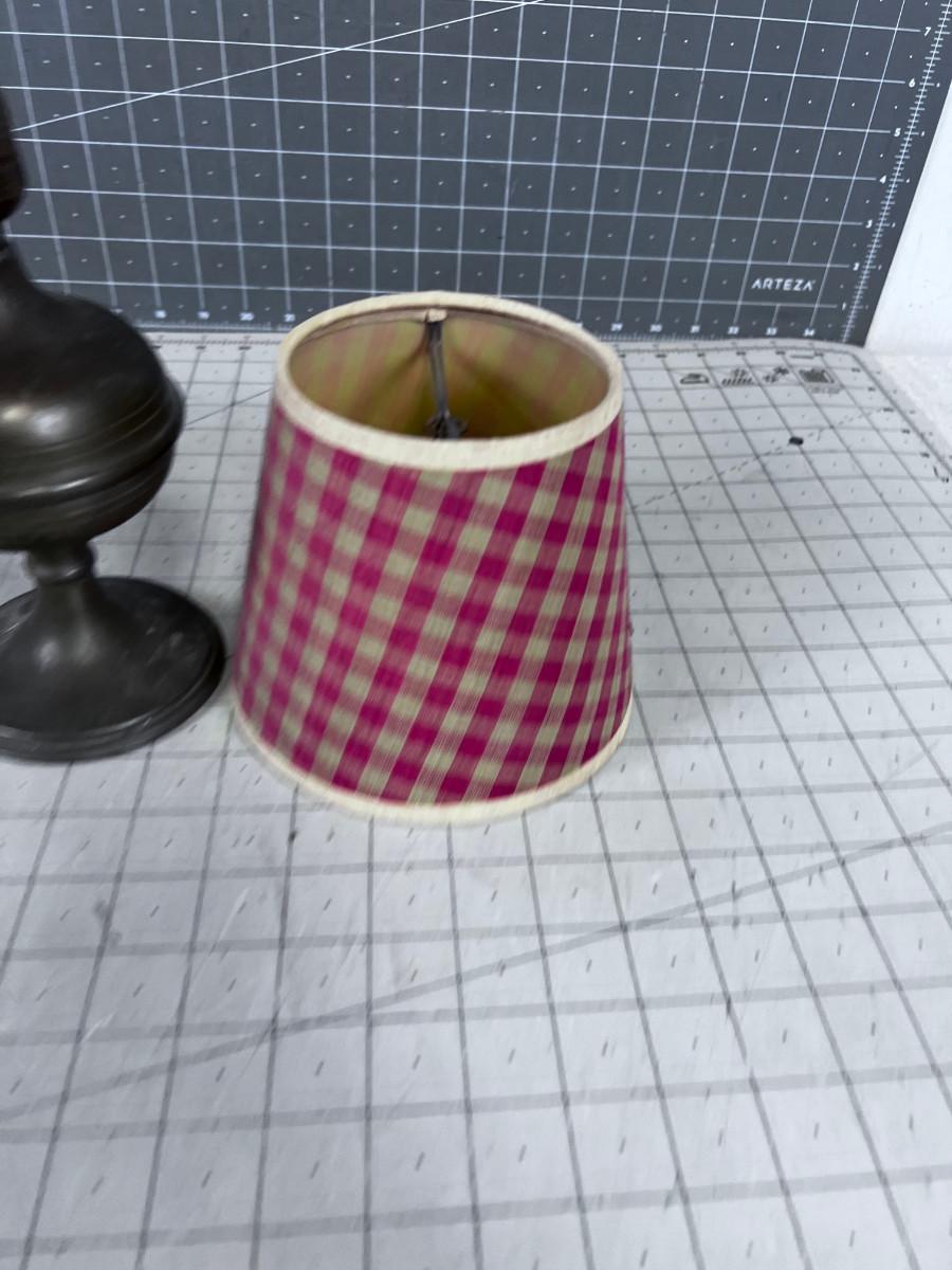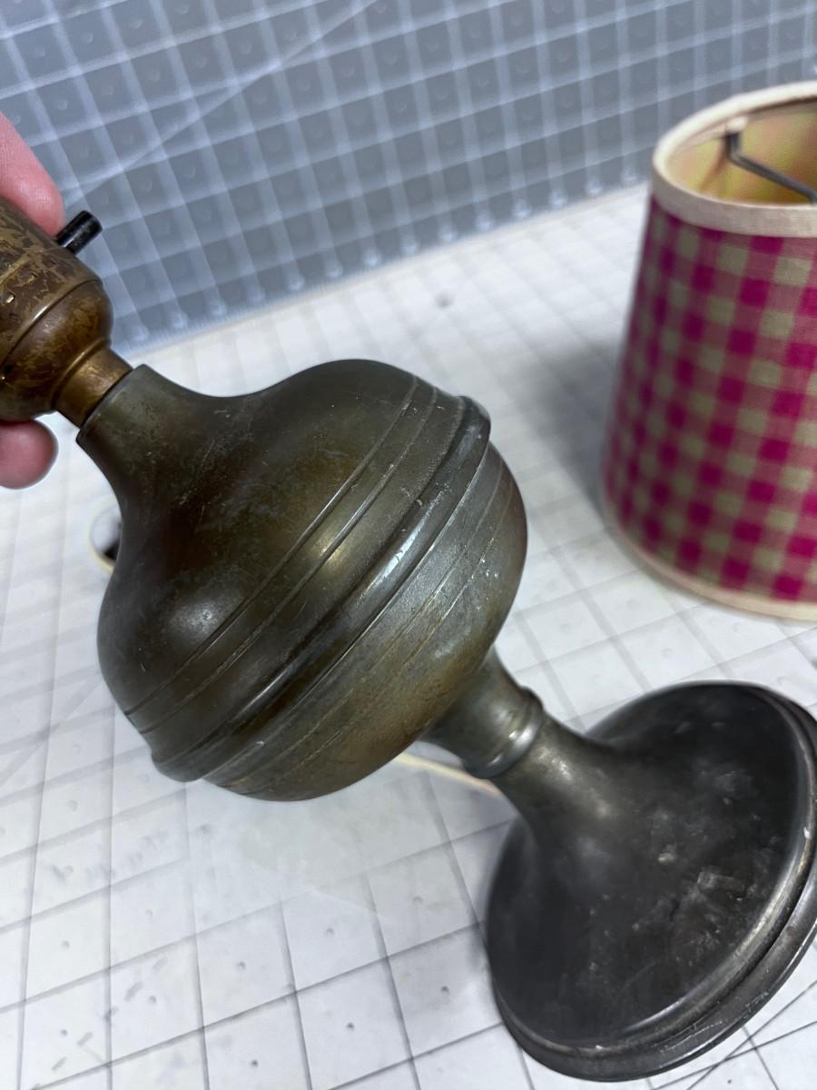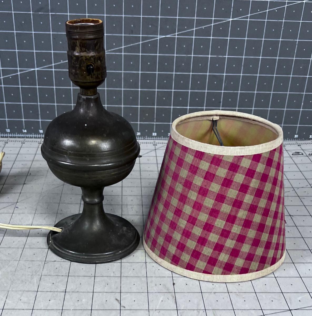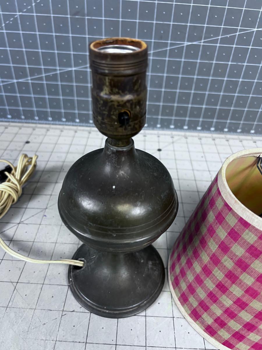 Antique Pewter LAMP with Red Gingham Shade, OLD