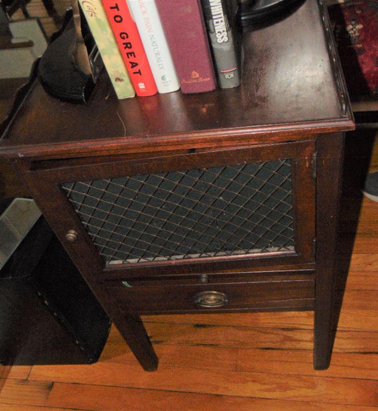 Circa 1940s. Features a storage area with a wire mesh front. Original hardware. Tapered legs. Single small storage drawer at the bottom. Some condition issues on the top, but only surface scratches.