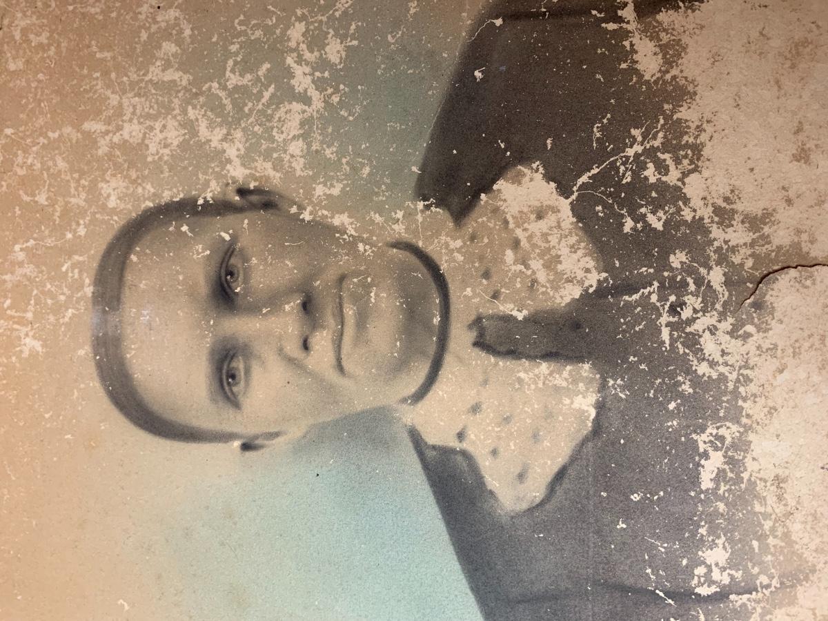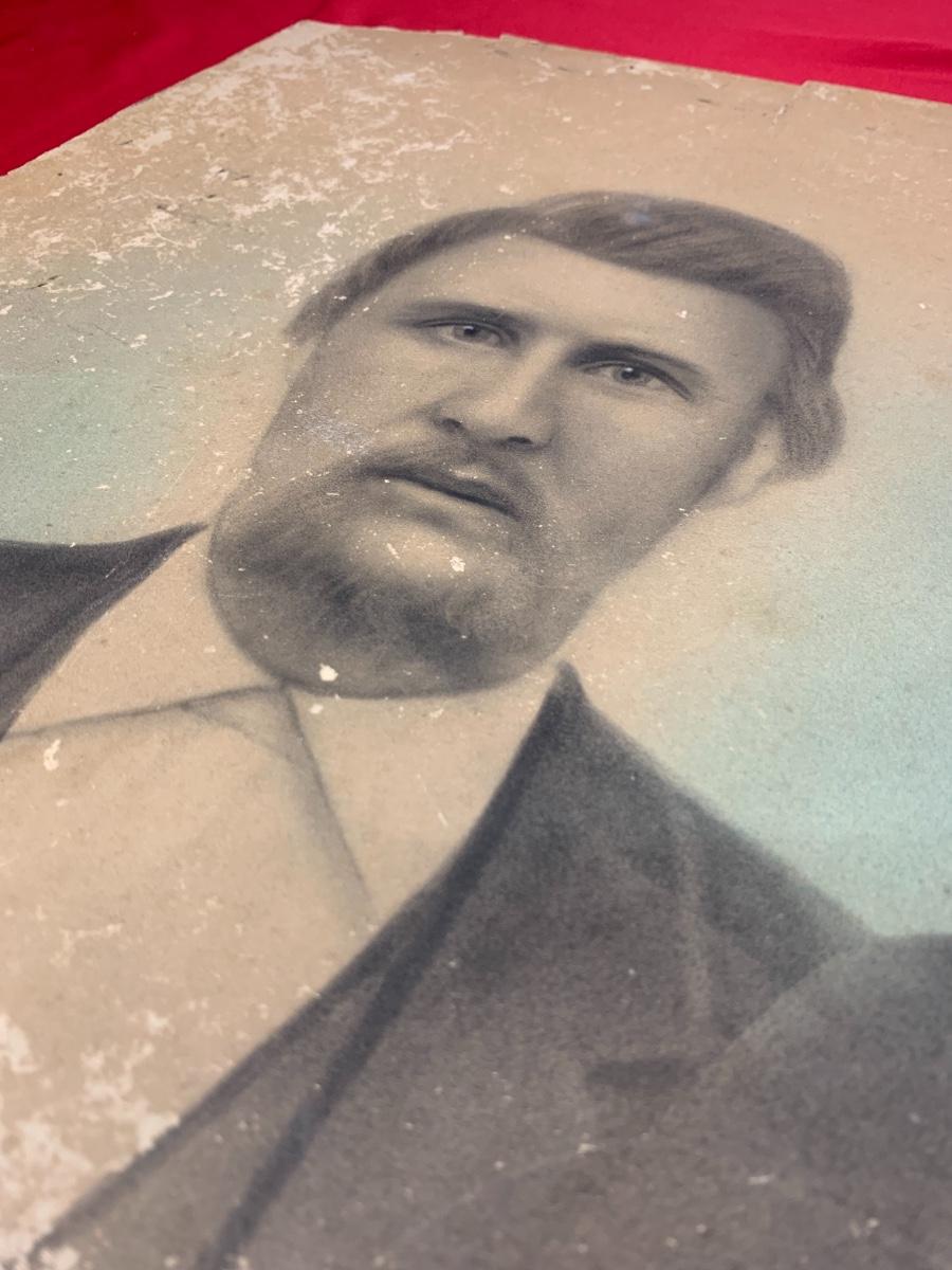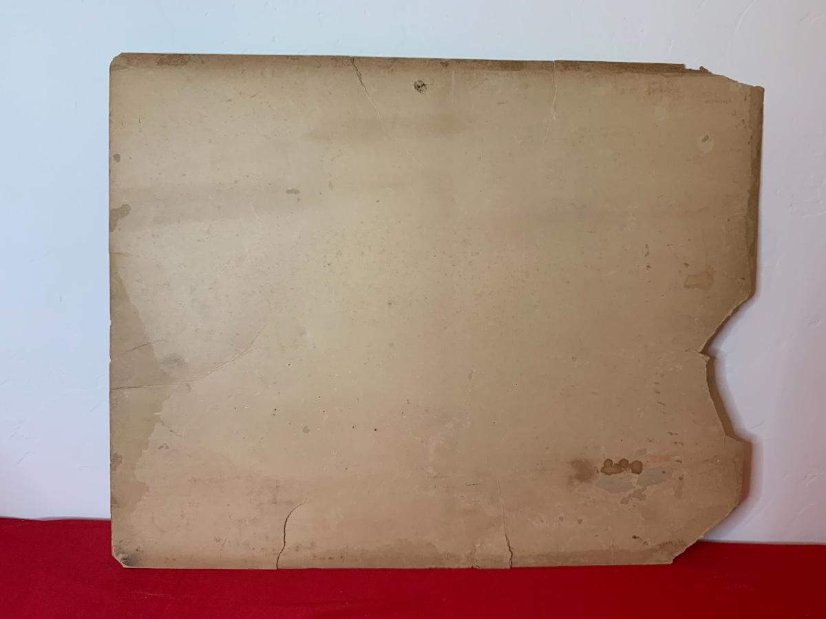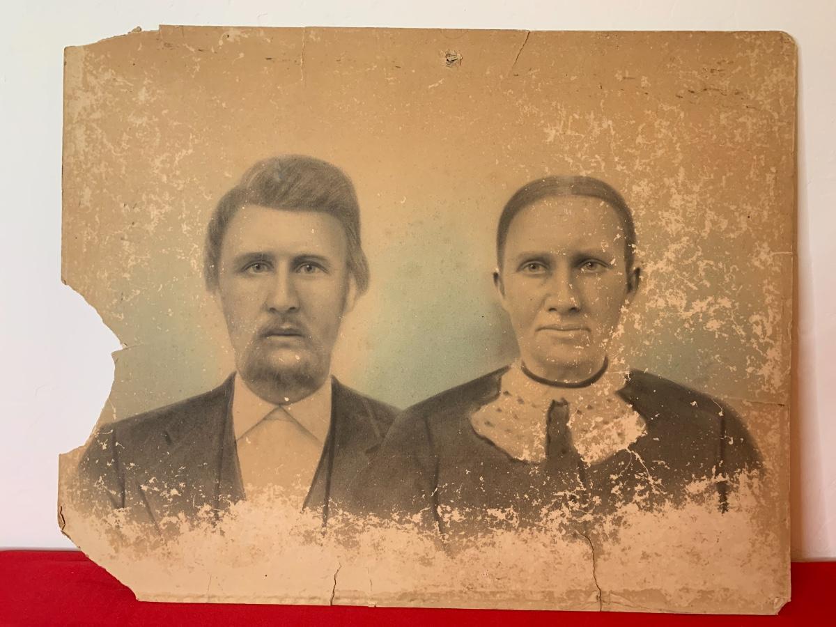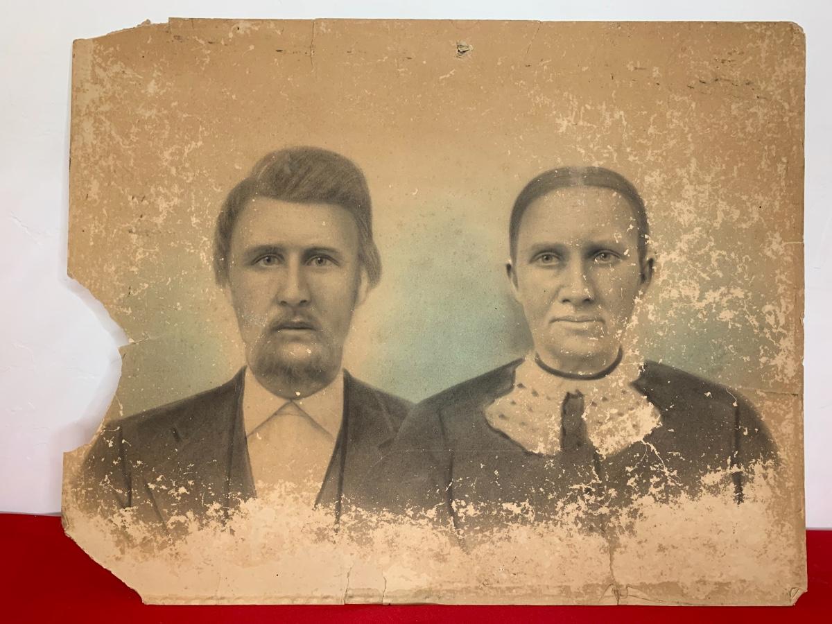 Appears to be an antique colorized photograph on a paper cardboard type backing. Rough edges, some peeling and hanging hole at top.