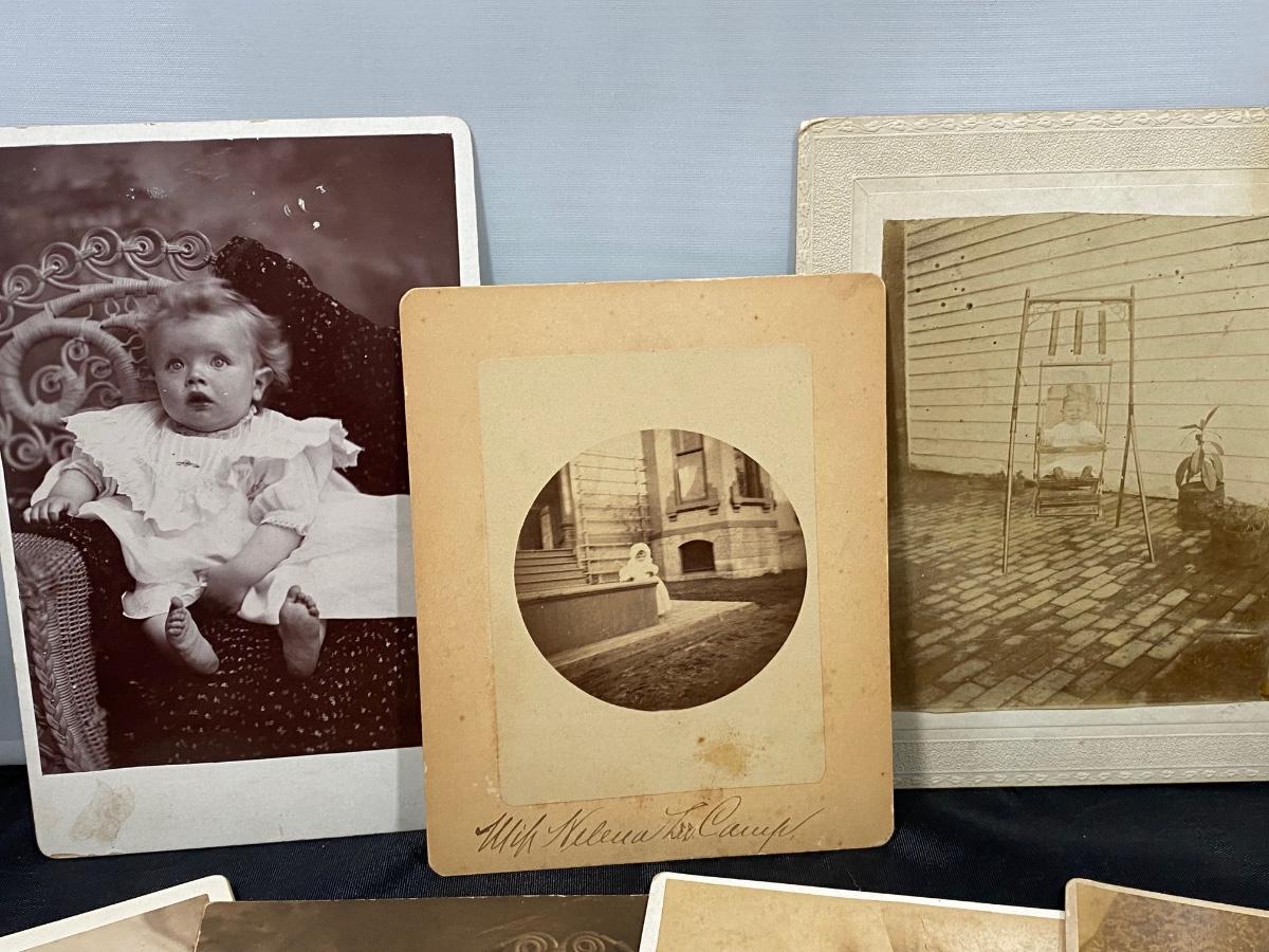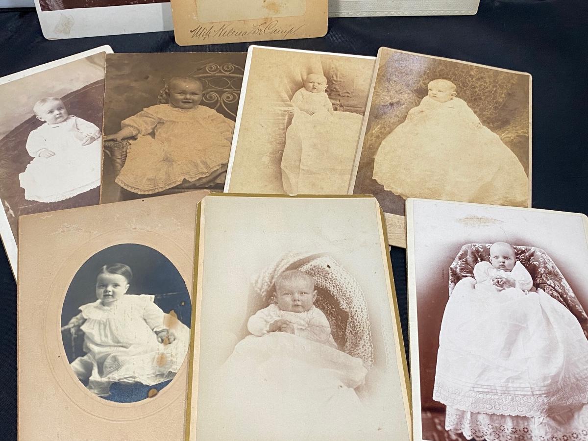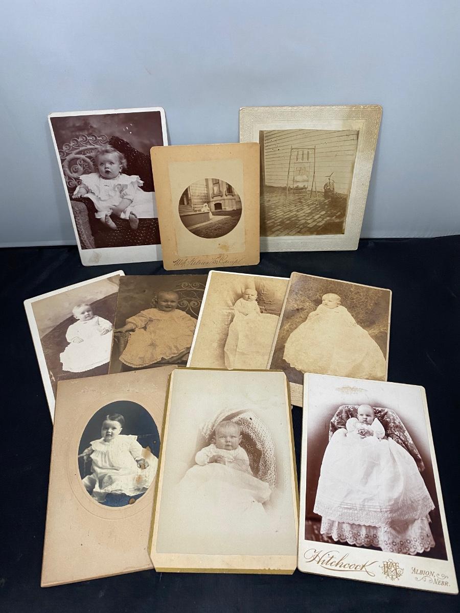 Lot of antique cabinet card photos of babies and infants. Some fade and discolor but in good condition.