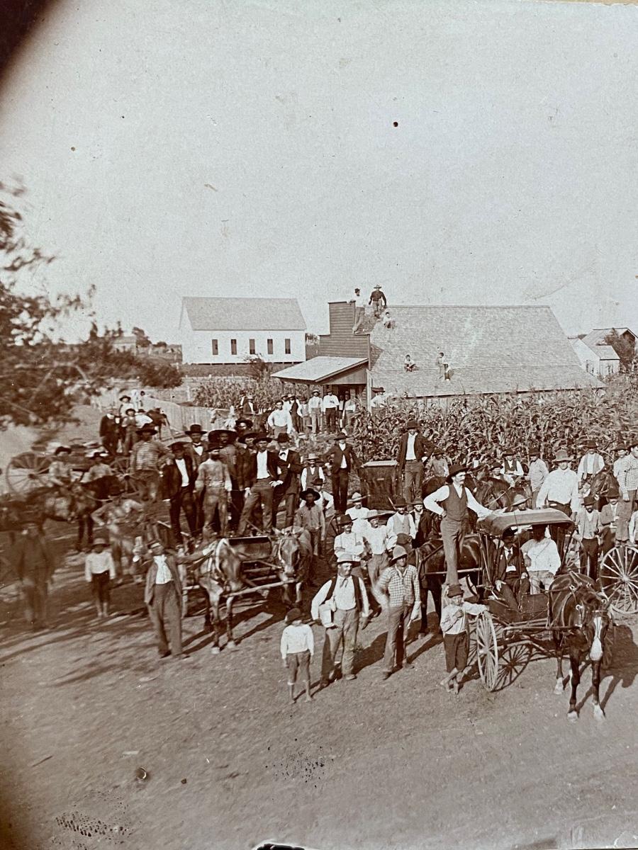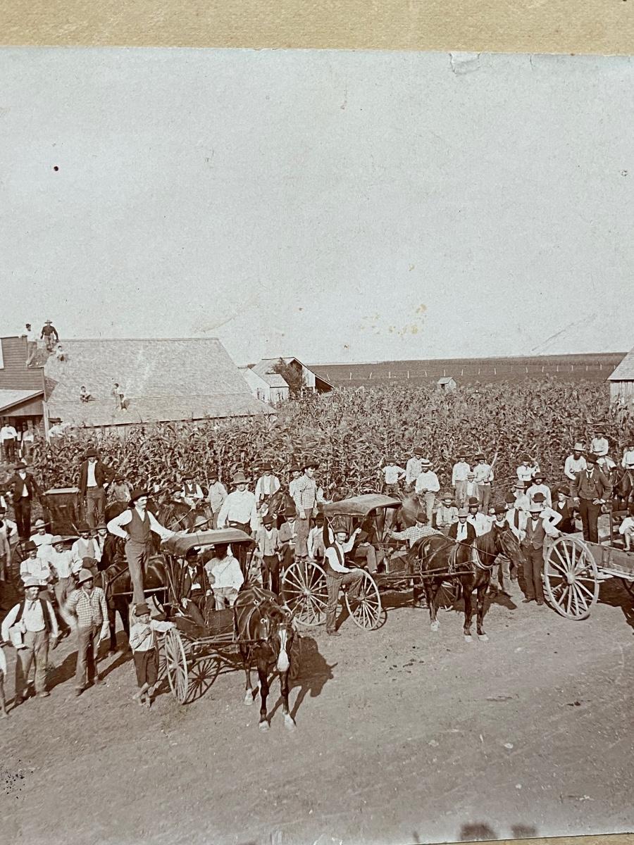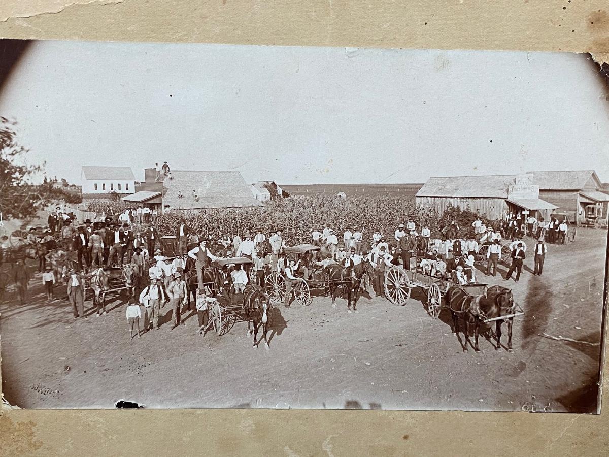 Antique Photograph of a Whole Towns People Group Shot by Corn Field Houses Stores