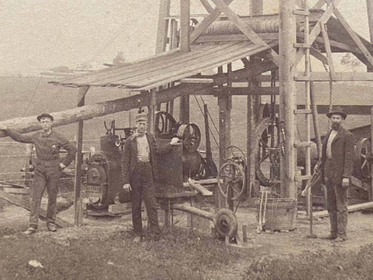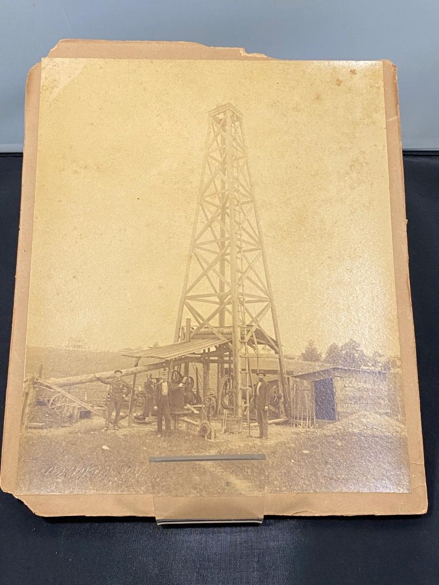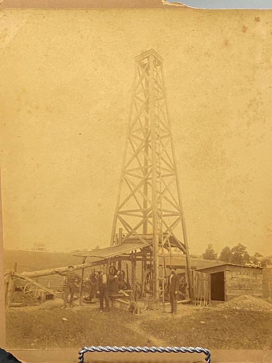 Antique photo of men working at an oil pump tower. Wear to the edges and fade from age. Location unknown.