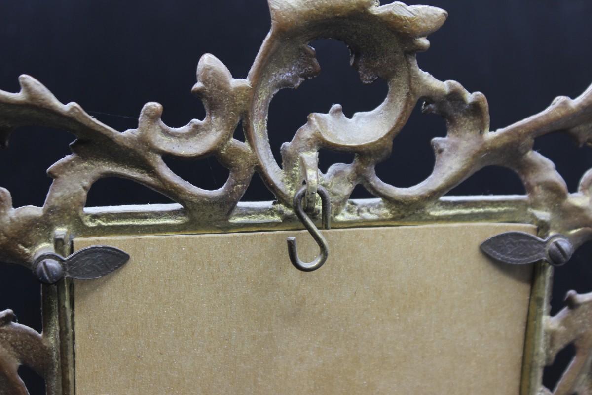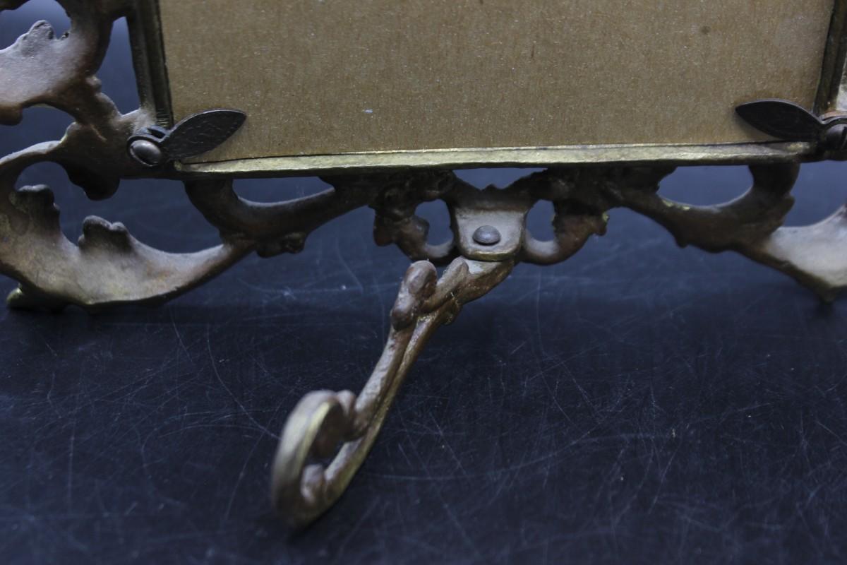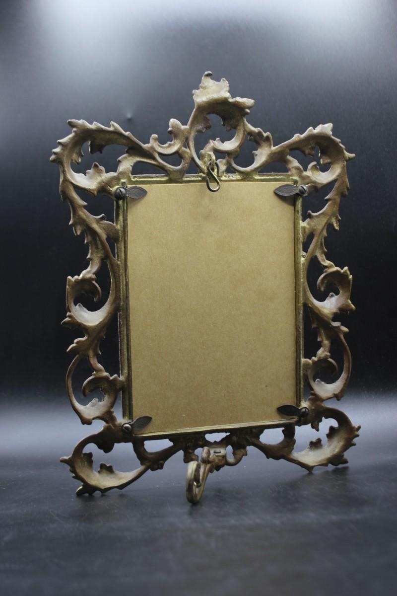 Vintage Bronze Metal Art Nouveau Style Gold Frame with a Photo of two Gentlemen in Swimming Suits, there is no significant damage to the frame and is in good vintage condition. The photo frame can be hung or propped with the stand in the back. The photo looks a little pixilated to be authentic, check pictures for more details and for sizing.